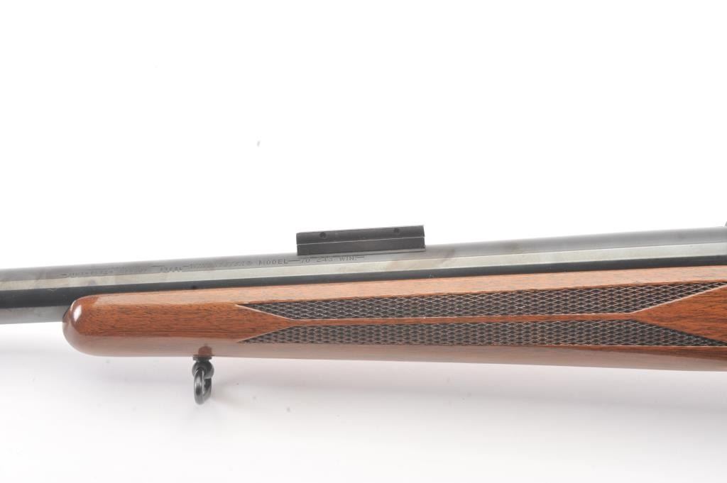 Winchester Model 70 Sporting Rifle in .243 caliber with a 24” heavy round barrel, S/N 732097. Scope mounts. Very good used condition. Missing bolt. Est.: $200-$400