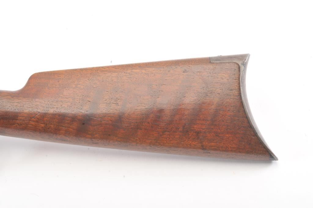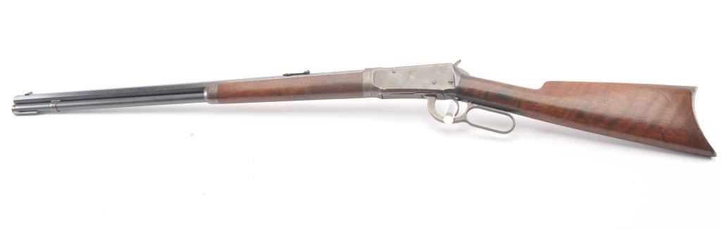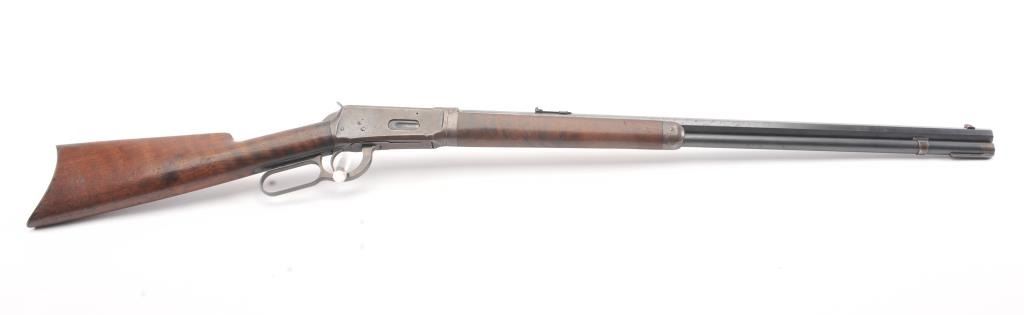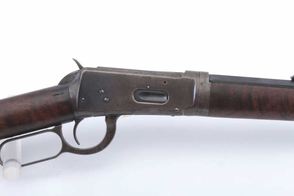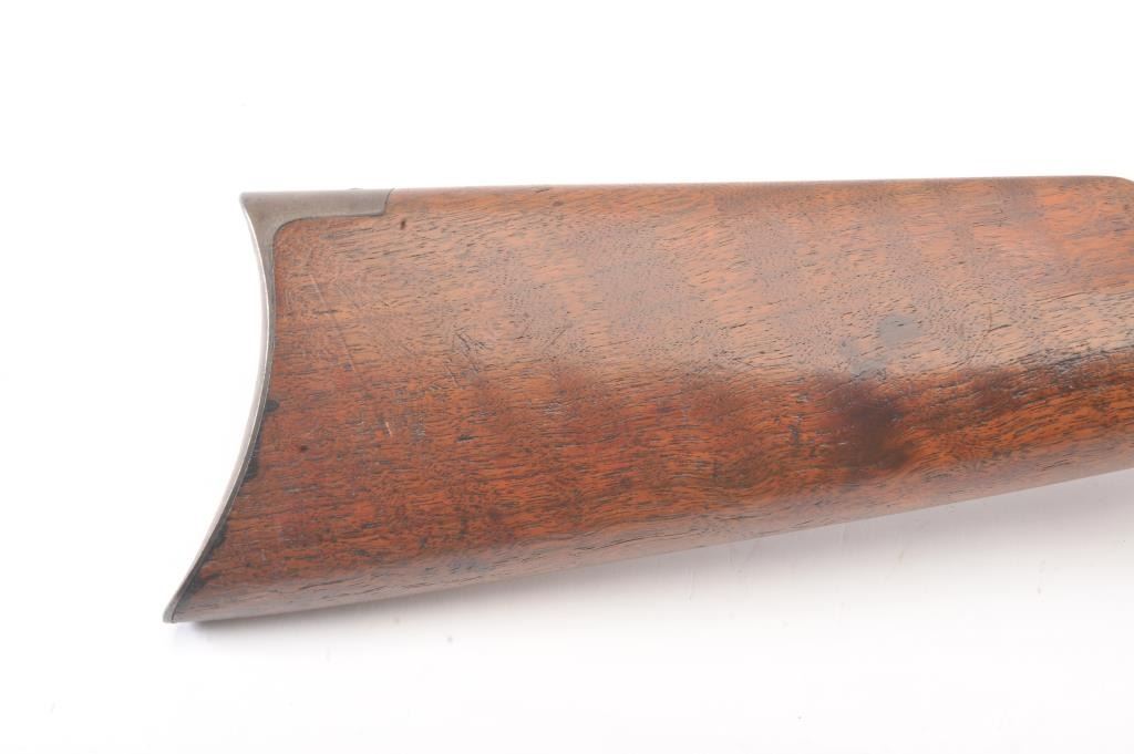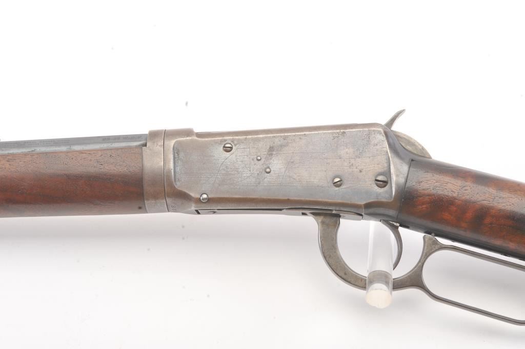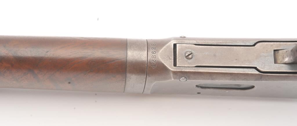 Winchester 1894 Lever Action Takedown Rifle in .25-.35 W.C.F. caliber with a 26” octagon barrel, blue finish, walnut stock, crescent butt, and 3 leaf rear sight, S/N 428628. This rifle remains in very good condition showing 80%-90% of its original blue remaining on the barrel and magazine tube with wear on the edges along with some pinprick pitting on the barrel and tube. The frame shows considerable amount of blue remaining turning to a brown/plum patina. The action is tight and the bore is very good. There is some “Play” where the barrel and frame lock up. (C&R) Est.: $1400-$2800