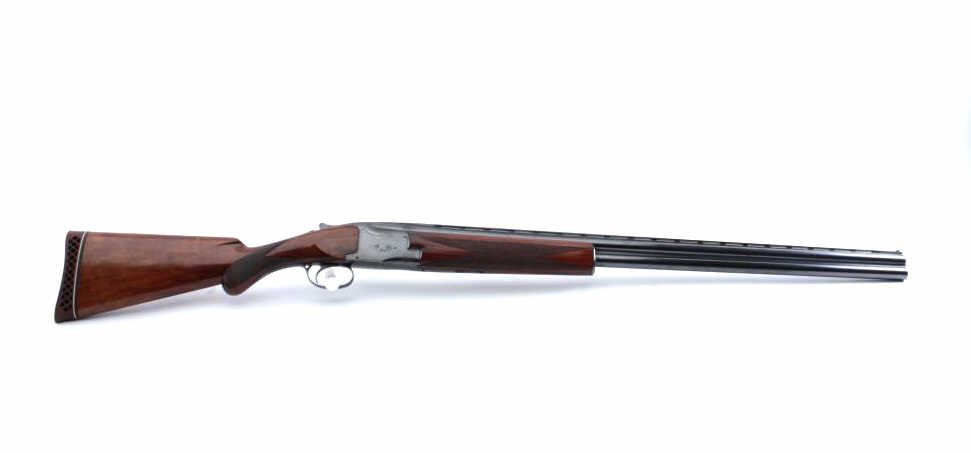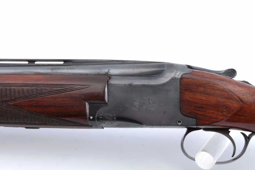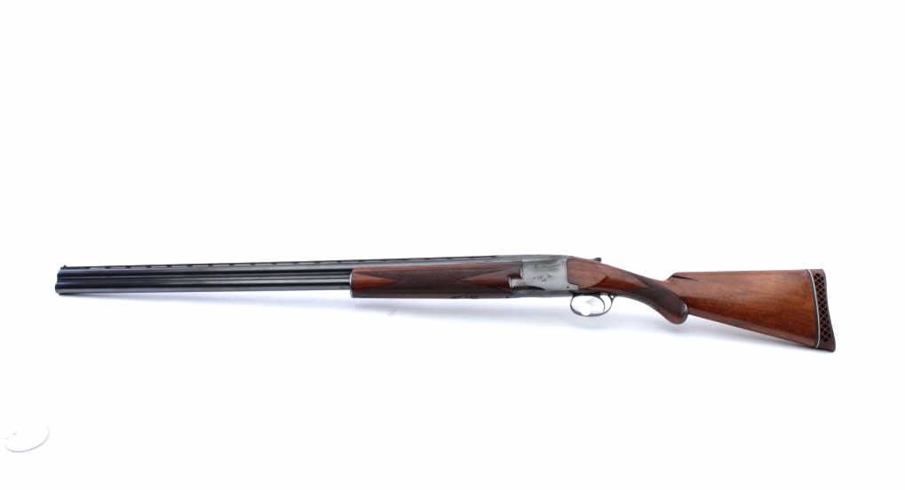 Belgian Browning O/U shotgun, 12 gauge, Serial #12343. The shotgun is in fine overall condition with 32” barrels with a full-length ventilated rib with an ivory bead front sight. The top barrel is choked“Full” and the lower barrel “Modified”. The metal surfaces retain nearly all of the original finish with light scroll engraving on the receiver, with a long tang and a single selector trigger. The finelycheckered wood stocks are in very good condition with a round knob pistol grip and ventilated butt pad providing a 13 ¾” LOP to a single trigger. The bores are good, the action is crisp and the markings are sharp on this early Belgian Browning. Est.: $500-$1,000. (C+R).