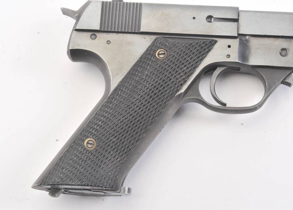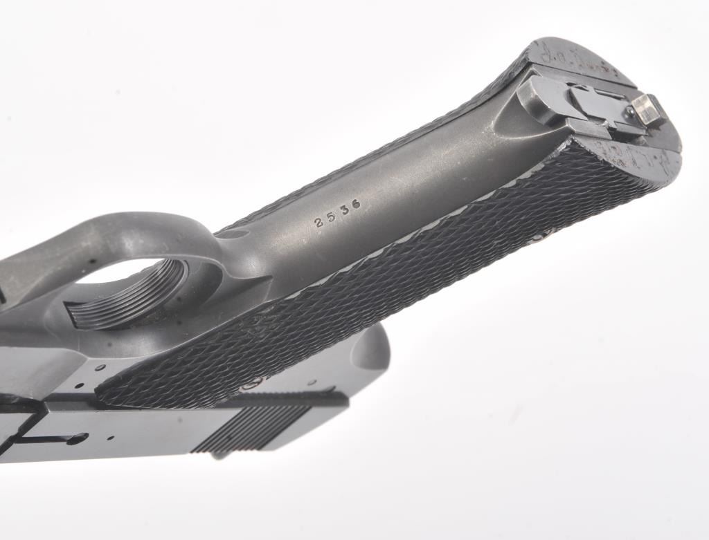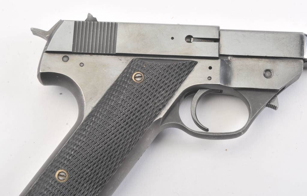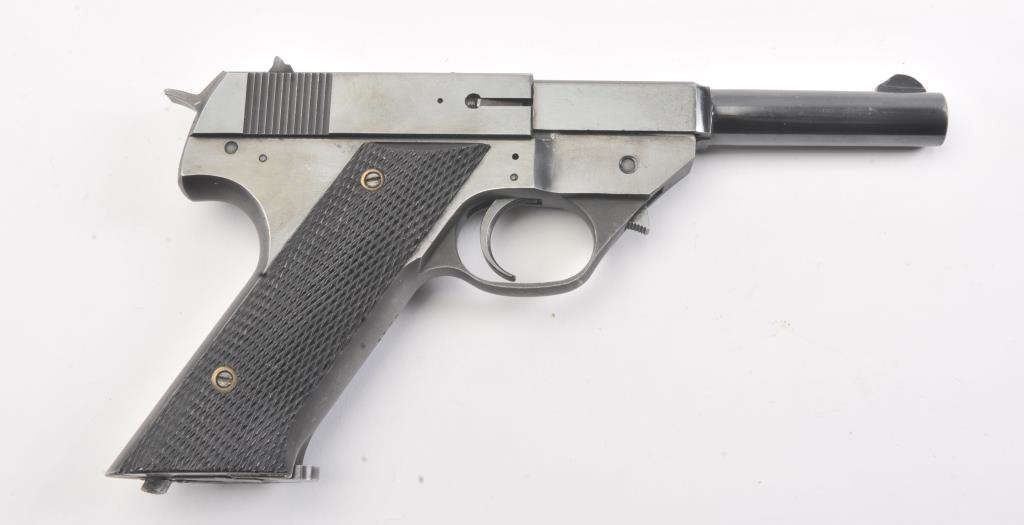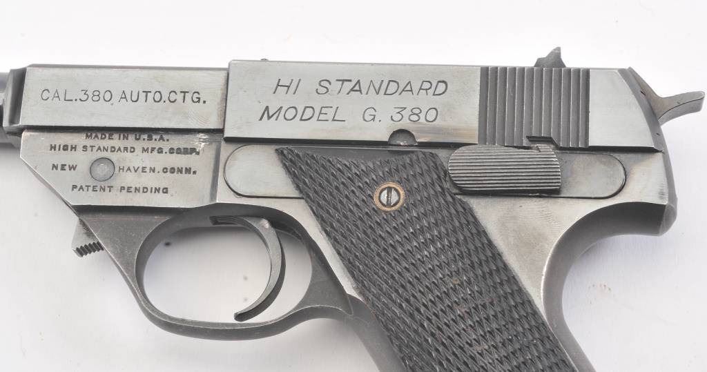 Hi Standard Model G .380 semi-automatic pistol, .380 caliber, Serial #2536. The pistol is in very good overall condition with a 4 ¾” barrel. The pistol retains the majority of the blue finish with wear at themuzzle and small scratches consistent with carry and use. The checkered plastic grips are in good condition with a prior owner’s name etched into the bottom of the panels. The bore is good, the action is crisp and the markings are sharp. Manufactured from 1947 to 1950 with a total production of about 7,400. This model was also High Standards only centerfire pistol. Est.: $400-$800. (C+R/PPT).