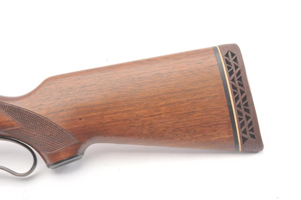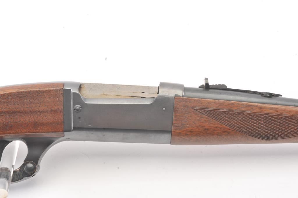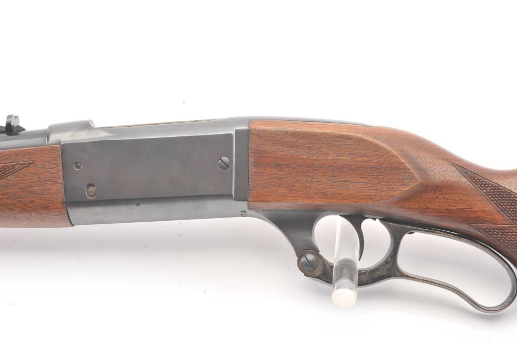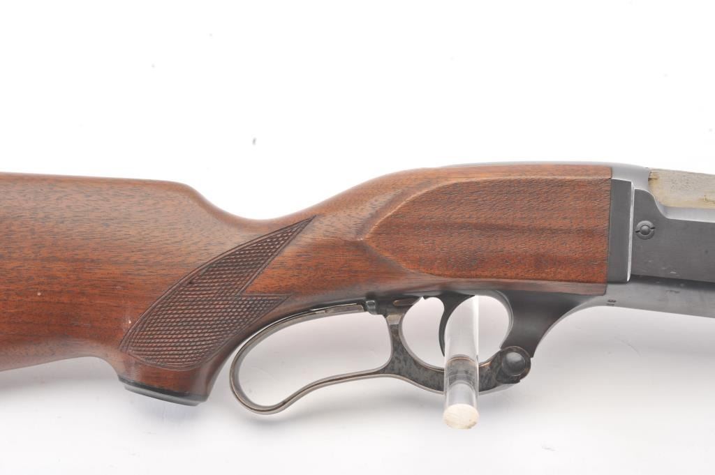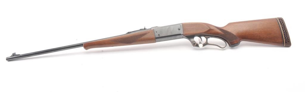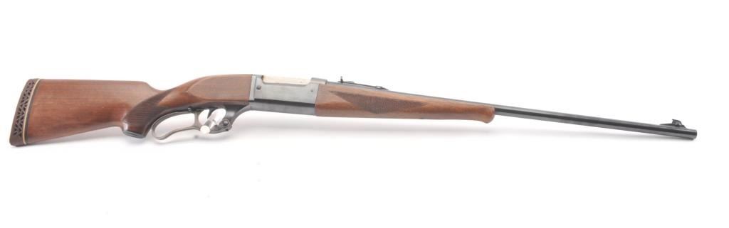 Savage Model 99 lever action rifle, .300 Savage caliber, Serial #638872. The rifle is in nearly excellent overall condition with a 24” barrel with a ramped blade front and semi-buckhorn rear sights. The rifle retains nearly all of the blue finish with light handling marks. The lever and lever assembly shows vivid color case hardening. The checkered wood butt stock has been shortened with a ventilated rubber recoil pad addedproviding a 12 7/8” LOP. The bore is dark and may clean to fair and the action works well. Est.: $175-350 (C+R).