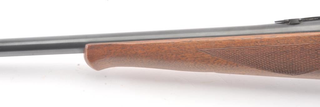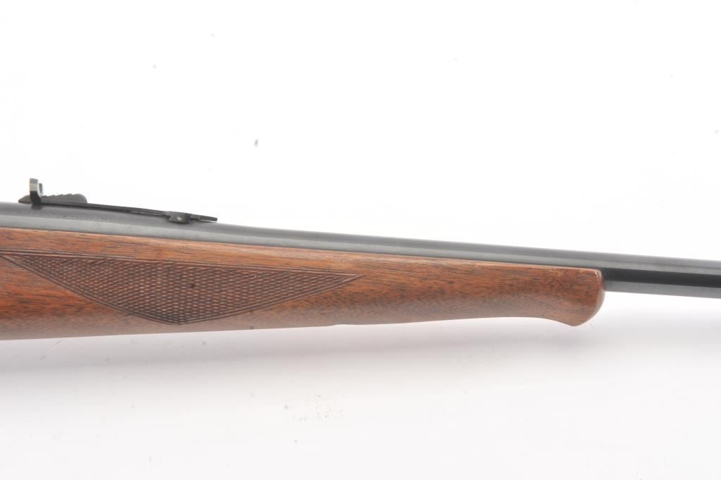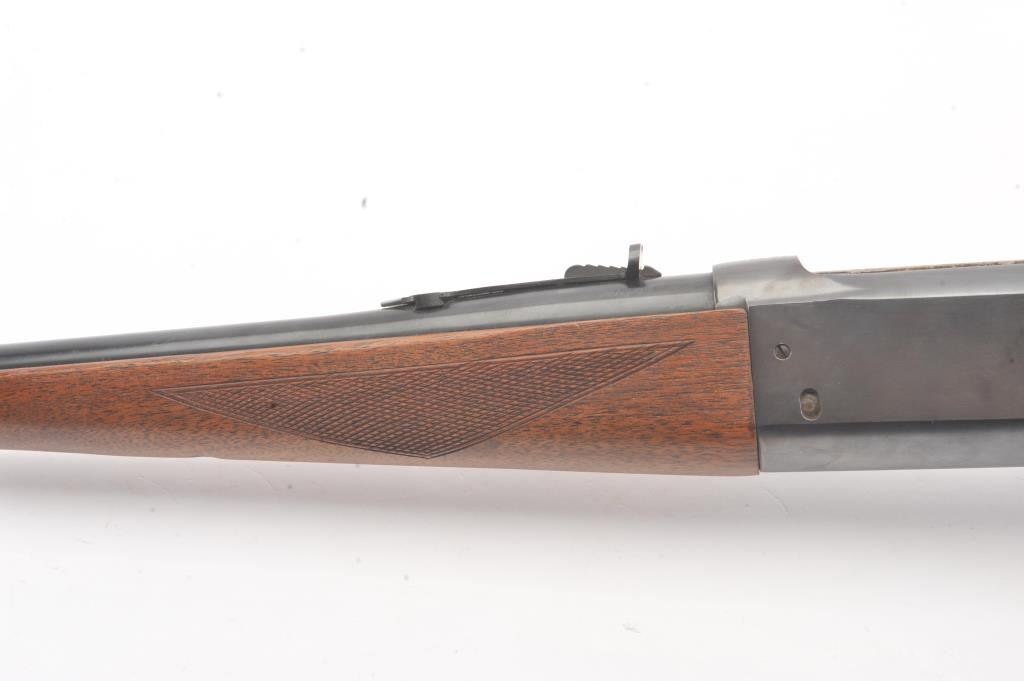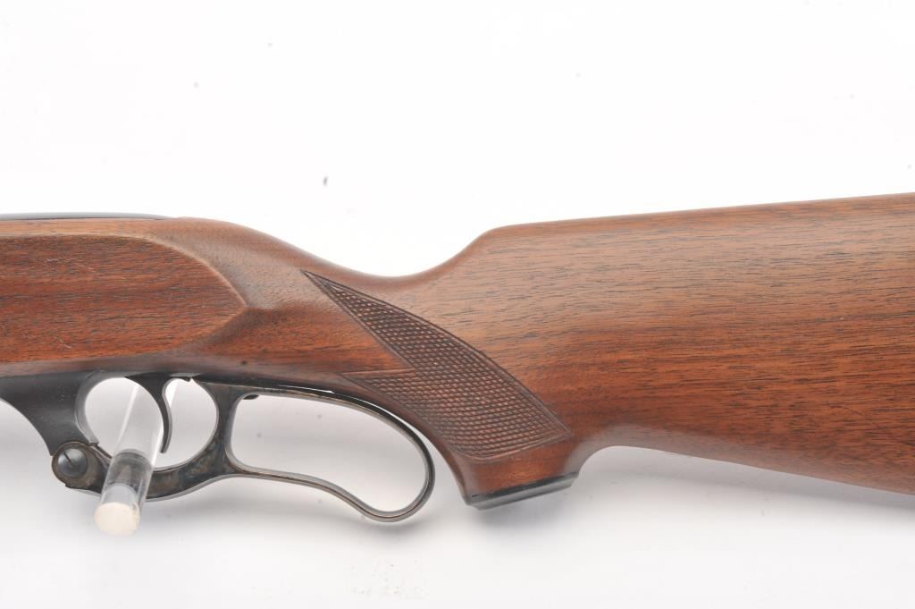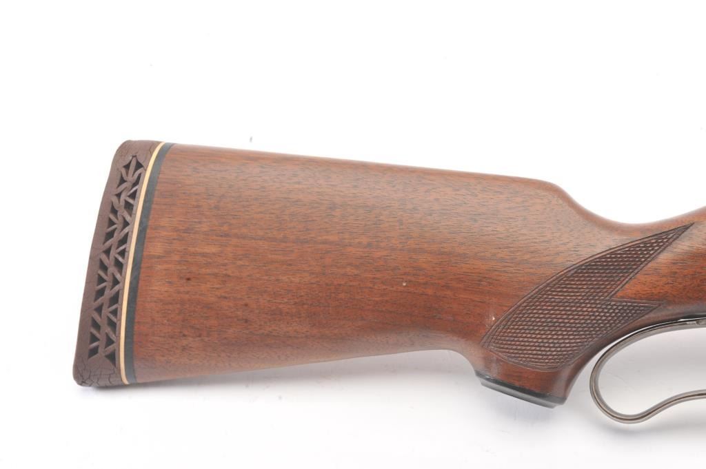 Savage Model 99 lever action rifle, .300 Savage caliber, Serial #638872. The rifle is in nearly excellent overall condition with a 24” barrel with a ramped blade front and semi-buckhorn rear sights. The rifle retains nearly all of the blue finish with light handling marks. The lever and lever assembly shows vivid color case hardening. The checkered wood butt stock has been shortened with a ventilated rubber recoil pad addedproviding a 12 7/8” LOP. The bore is dark and may clean to fair and the action works well. Est.: $175-350 (C+R).
