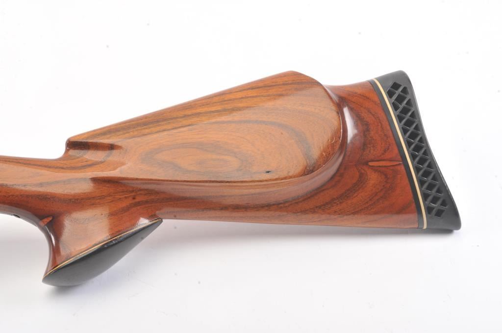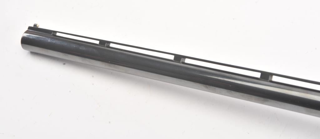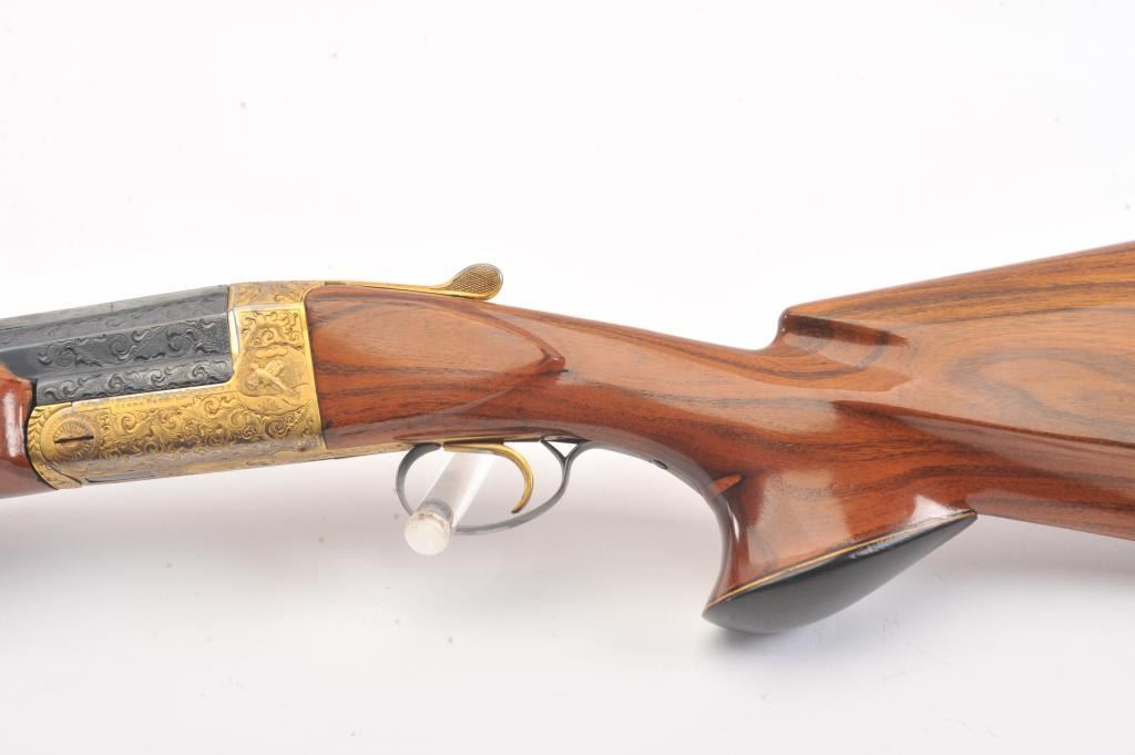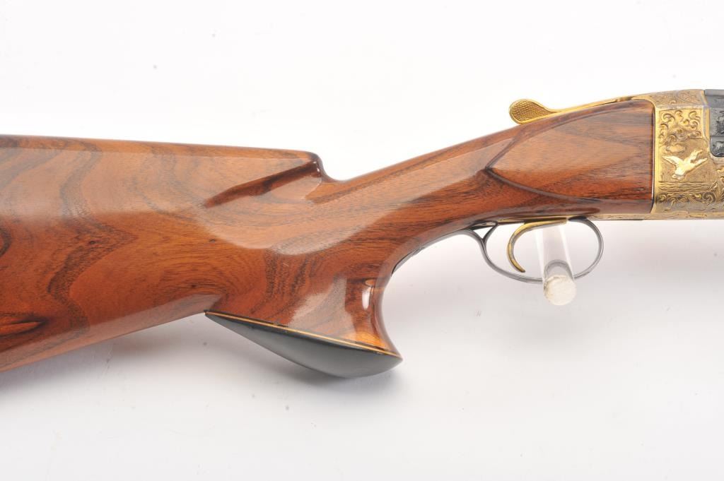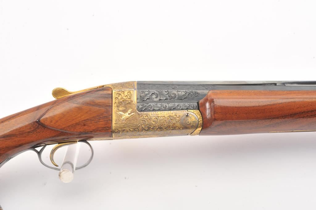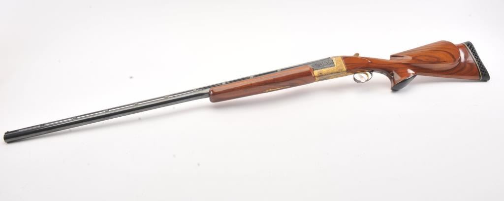 A. Francotte single shot Trap shotgun, 12 gauge, Serial #81462. The shotgun is in fine overall condition with a 34” octagon to round single barrel with a full-length ventilated rib and ivory bead front sight.The barrel retains nearly all the blue finish with scroll engraving at the breech. The receiver is beautifully engraved and finished in gold. The action locks up tight and features a single selector trigger. Thefinely finished English walnut stock is in very good condition with an exaggerated pistol grip, beavertail fore end and high comb cheek piece. The butt stock ends with a ventilated rubber pad providing a 14” LOP.The shotgun comes in a Browning luggage hard case. The bore is good, the action is crisp and the markings are sharp. Est.: $1,400-$2,800. (Modern).