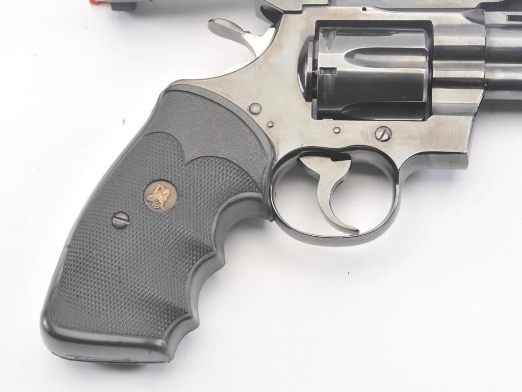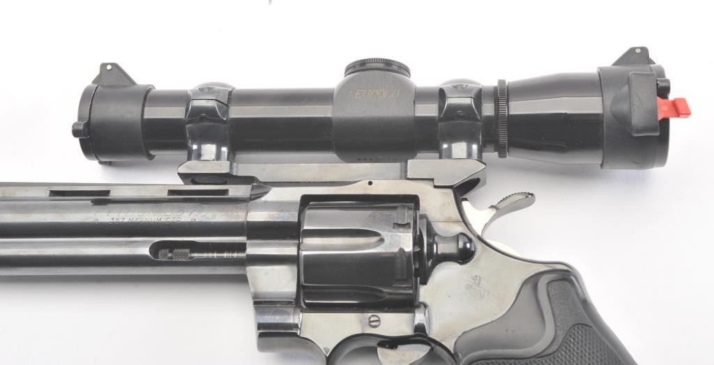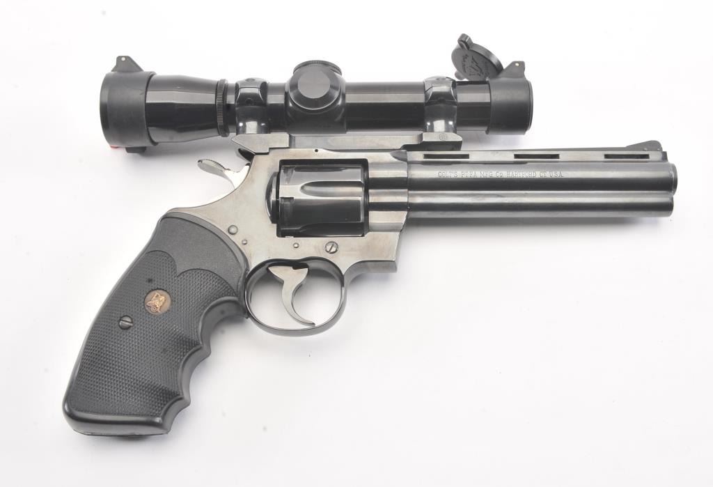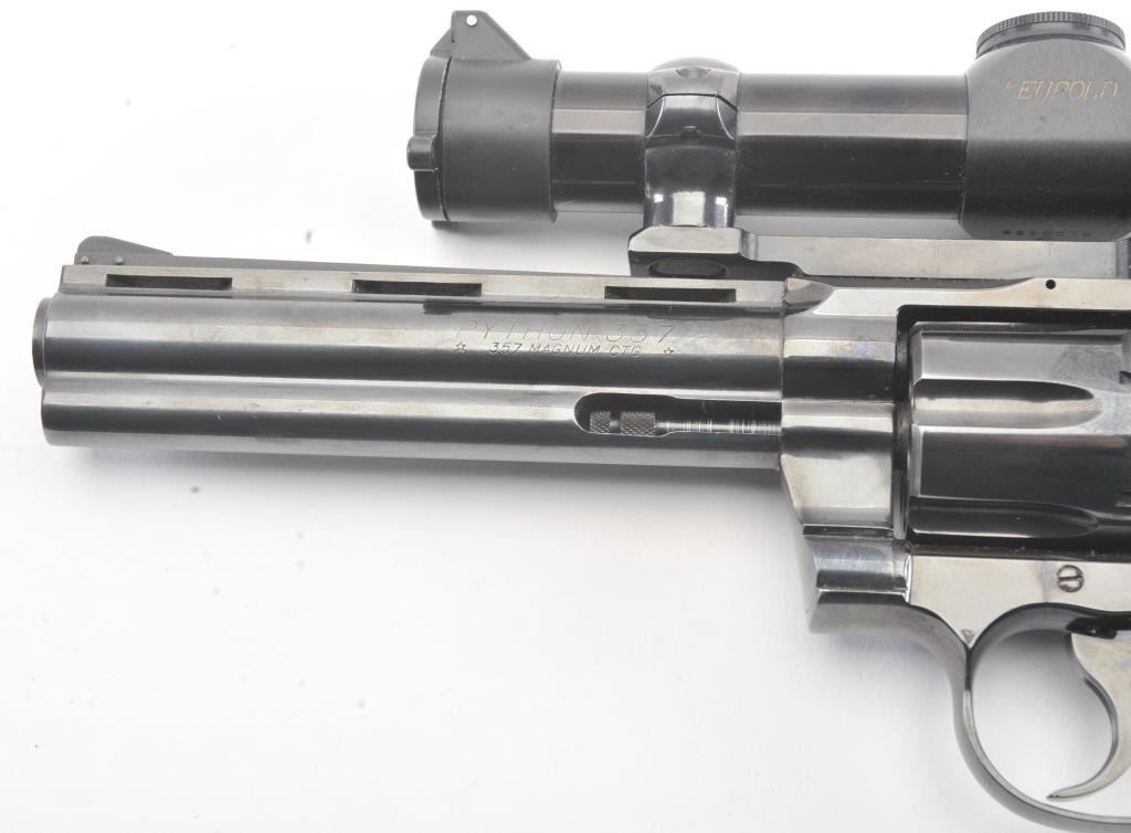 Colt Python Double Action revolver in .357 Mag with a 6” barrel mounted with leupold scope and Pachmayer grips, S/N 84720. 90%-95%+ original blue showing minor use and firing. A couple small nicks. Slight indexline on the cylinder. A fairly early python circa 1968. Showing a little use but no abuse. (C&R/PPT) Est.: $2000-$4000