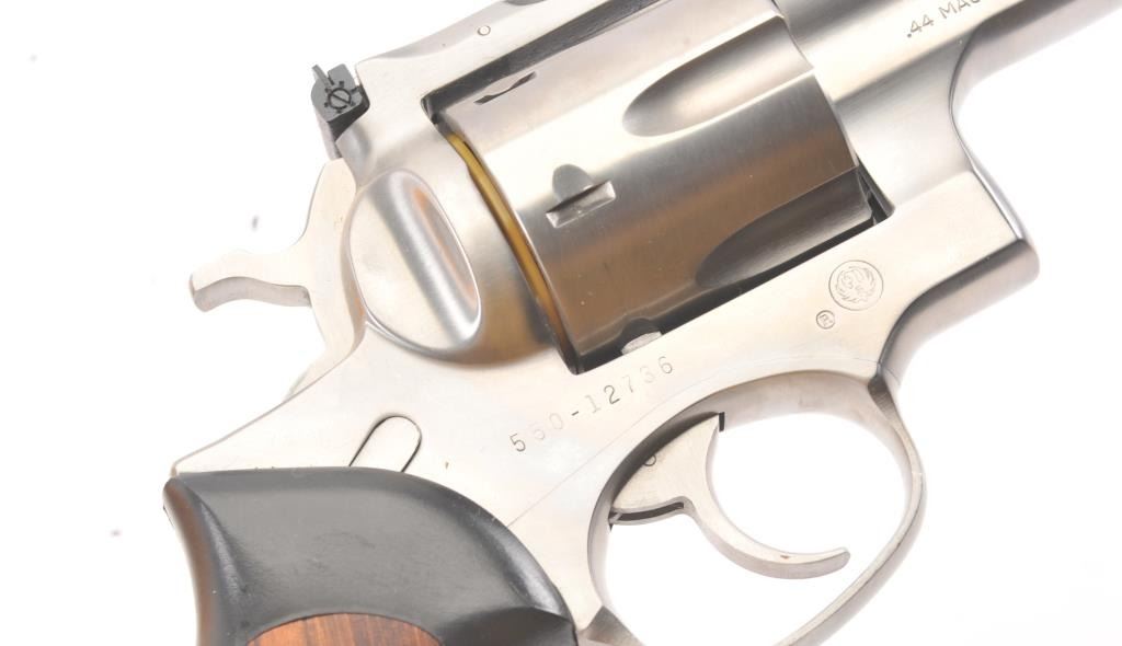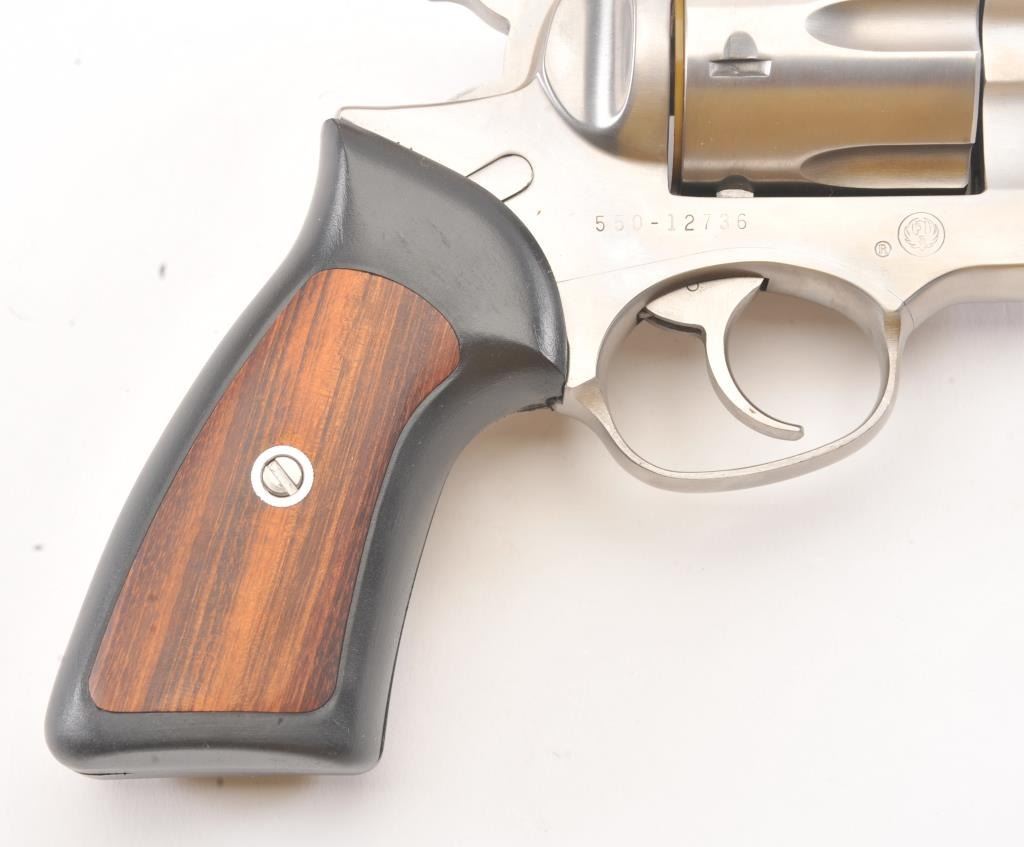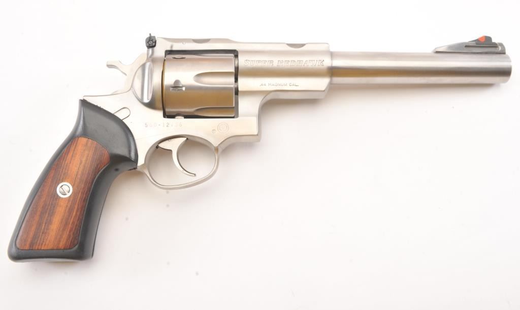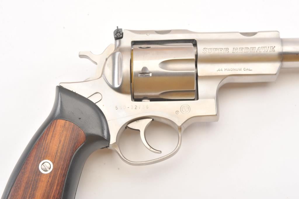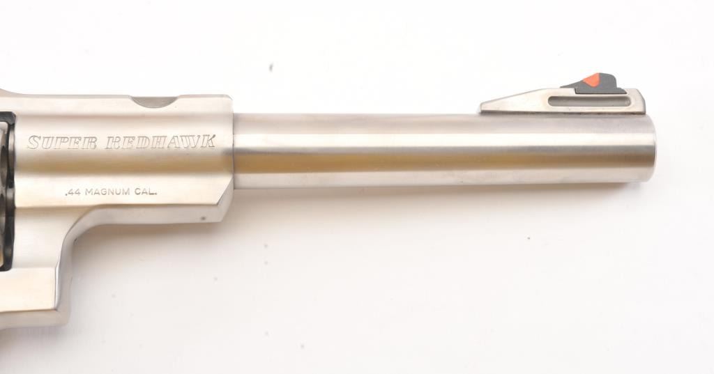 Ruger Super Redhawk Stainless Steel Revolver in .44 mag caliber with a 7 ½” barrel, S/N 550-12736. Fine to excellent in box with slip cover. Evidence of firing and use. About 97%-98% overall. (Modern/PPT) Est.: $350-$700