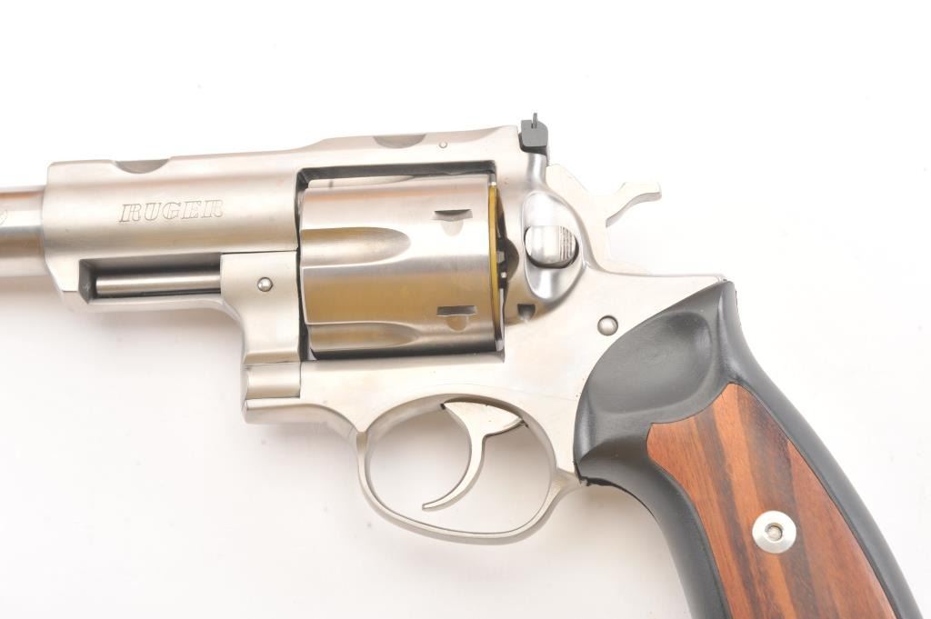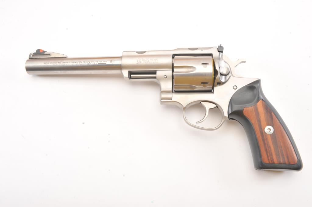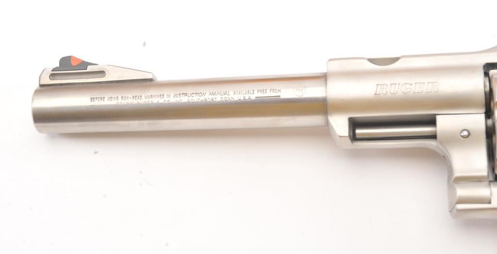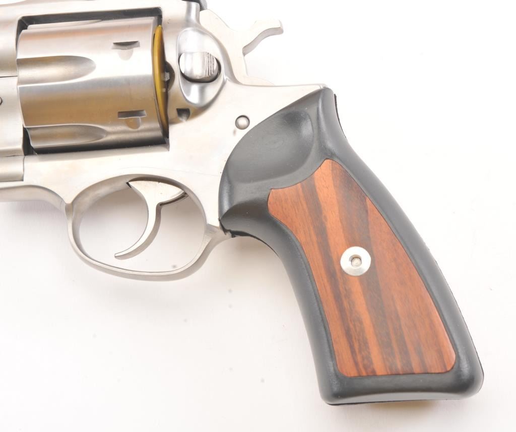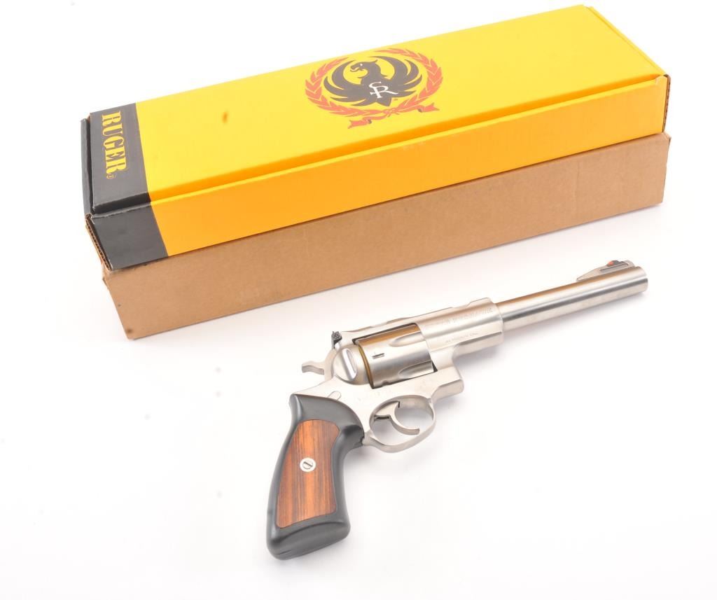 Ruger Super Redhawk Stainless Steel Revolver in .44 mag caliber with a 7 ½” barrel, S/N 550-12736. Fine to excellent in box with slip cover. Evidence of firing and use. About 97%-98% overall. (Modern/PPT) Est.: $350-$700