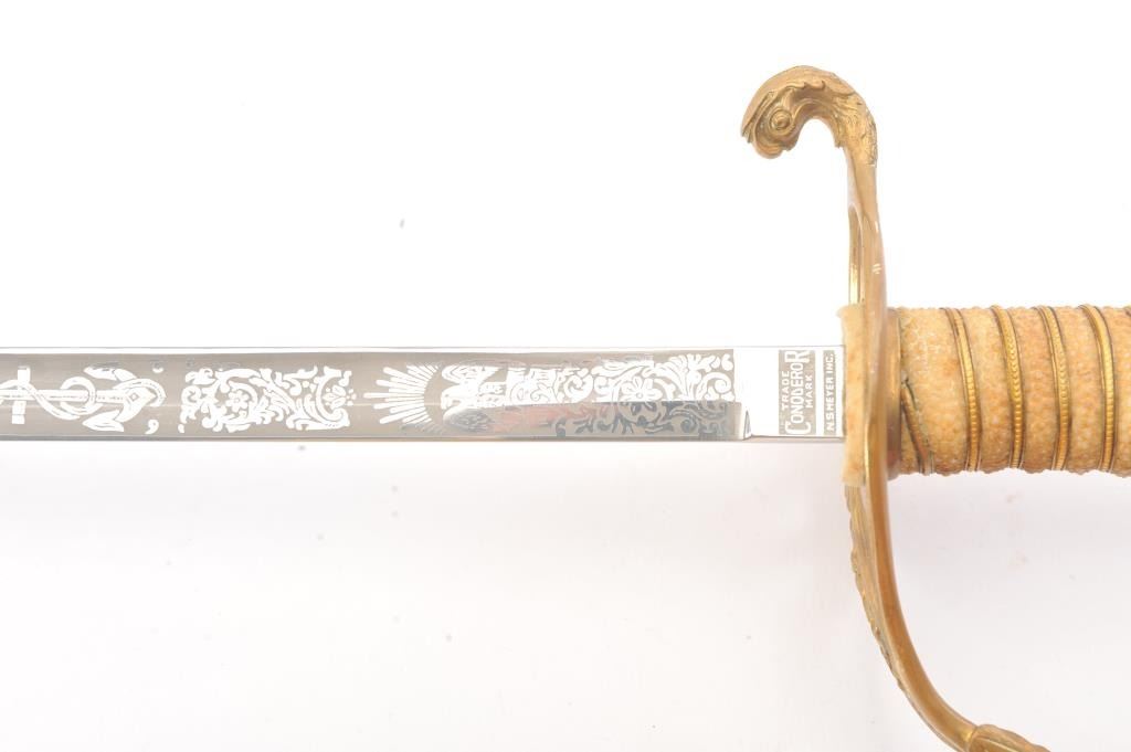 U.S. Naval Officer’s sword with Conqueror trademarks (N.S. Meyer & Co.) in fine to nearly excellent condition about 1910-1930’s. The sword shows some aging to the scabbard and patina on the brass with an excellentblade. Est.: $150-300