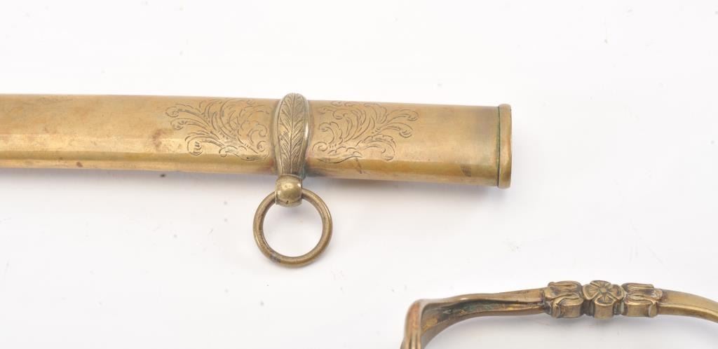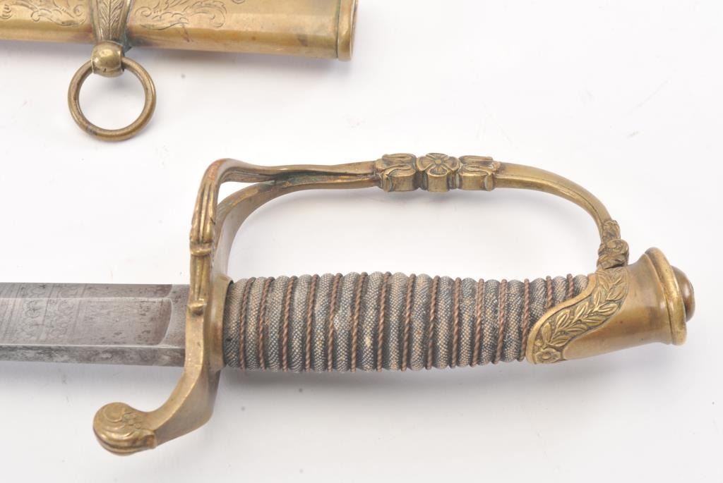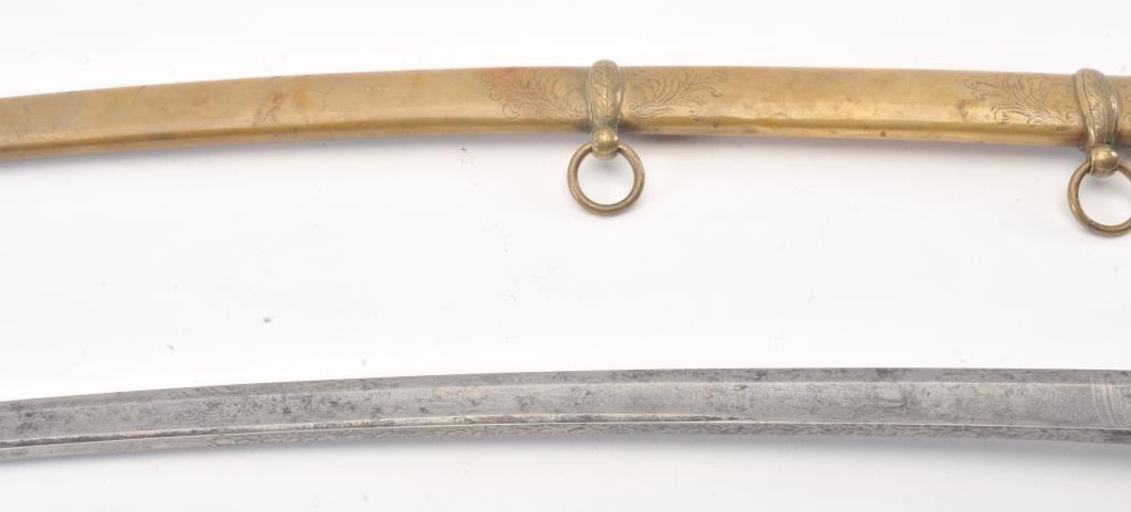 Unusual Civil War Cavalry Officer’s variant sword marked “W.H. Horstman and Sons of Philadelphia” in etching on the blade. Two branch brass D shaped guard with sharkskin grip and attractive engraved brass scabbardwith two rings. The slightly curved blade measures 31 ½” with blood groove area showing foliate etching, stands of arms and maker’s name. No foreign marks of proofs. The condition is god plus to very good with light old cleaning to etching and minor erosion and pitting. The etching is slightly light but fully visible. The grip is very good with slight tatters and wear. The scabbard shows dings and dents. Good patina on the brass.Very attractive and a scarce configuration patterned after French swords of this same era. Est.: $750-$1500