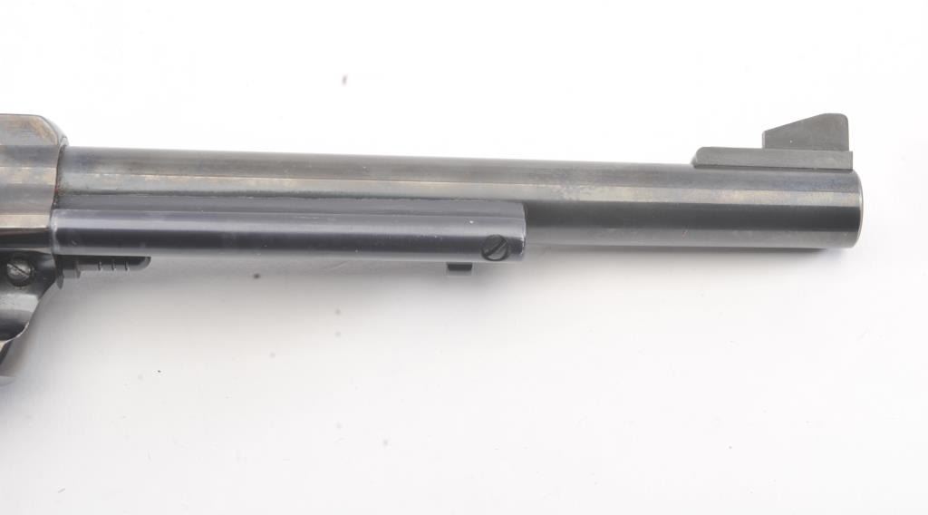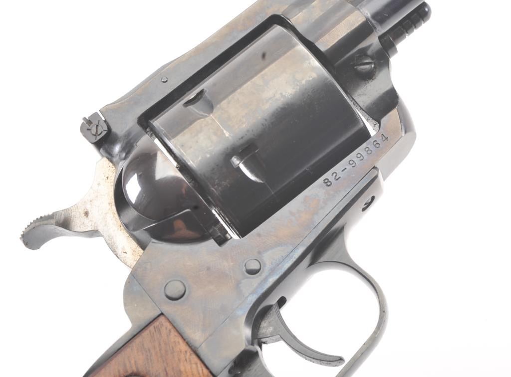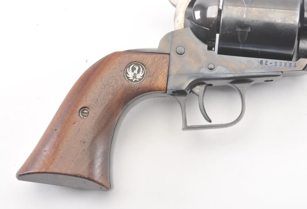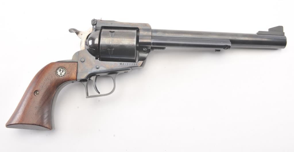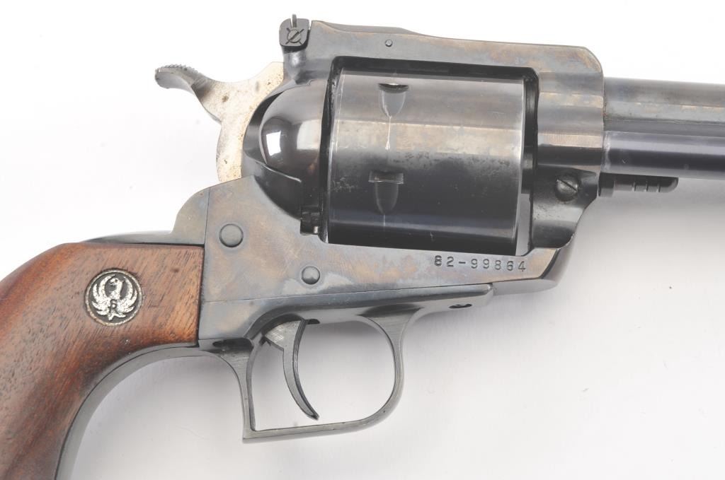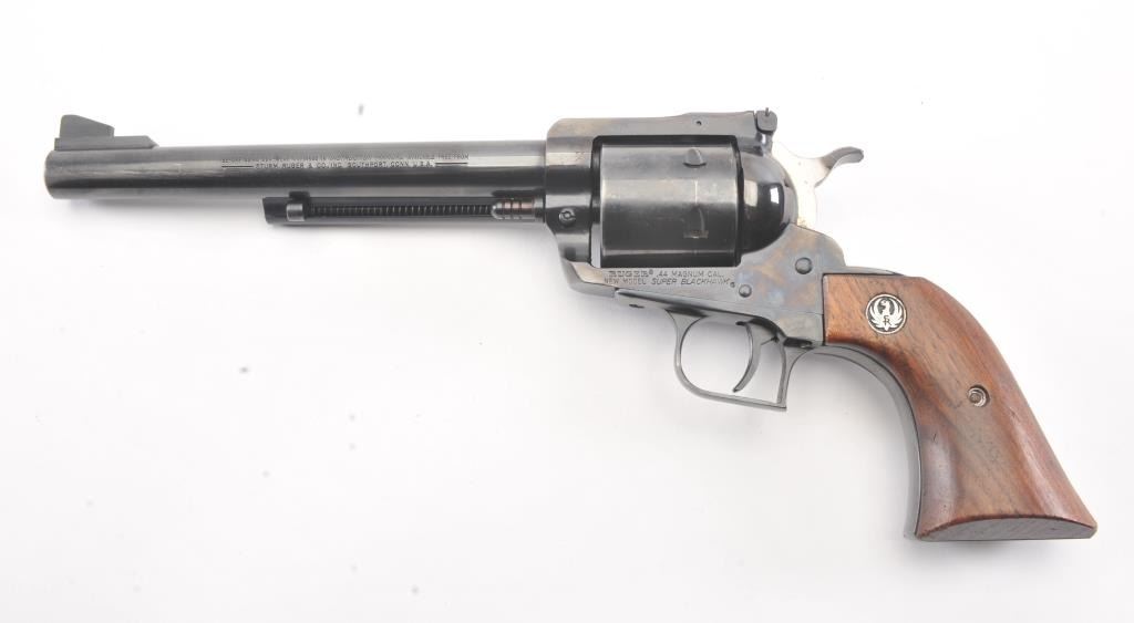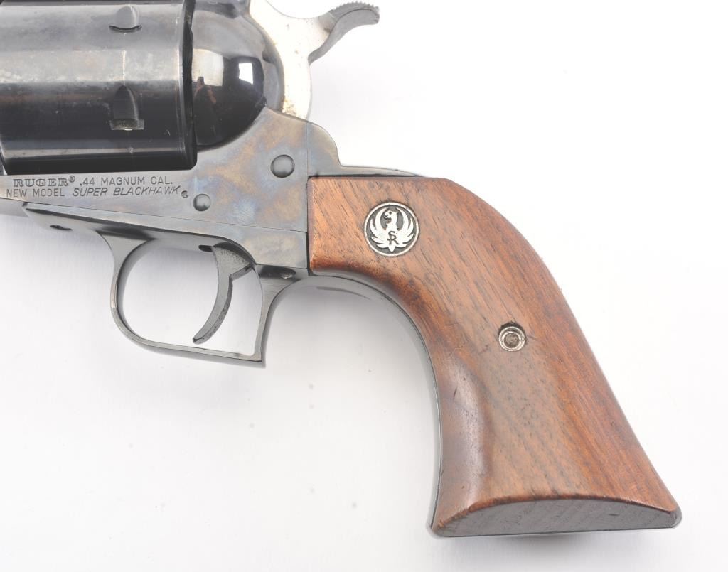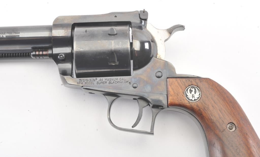 Ruger New Model Super Black Hawk SA revolver, .44 Magnum caliber, Serial #82-99864. The pistol is in very good overall condition with a 7 ½” barrel with considerable dried oil that should clean. The pistol retains themajority of the blue finish with holster wear and thinning of finish at the muzzle. The pistol features a square back trigger guard. The smooth wood medallion grips are in very good condition with light storage andhandling marks. The bore is bright, the action is crisp and the markings are sharp. Est.: $250-$500. (Modern/PPT).
