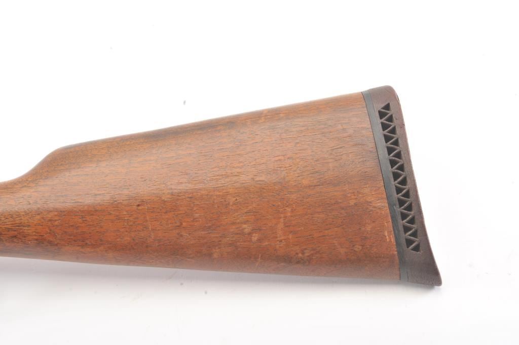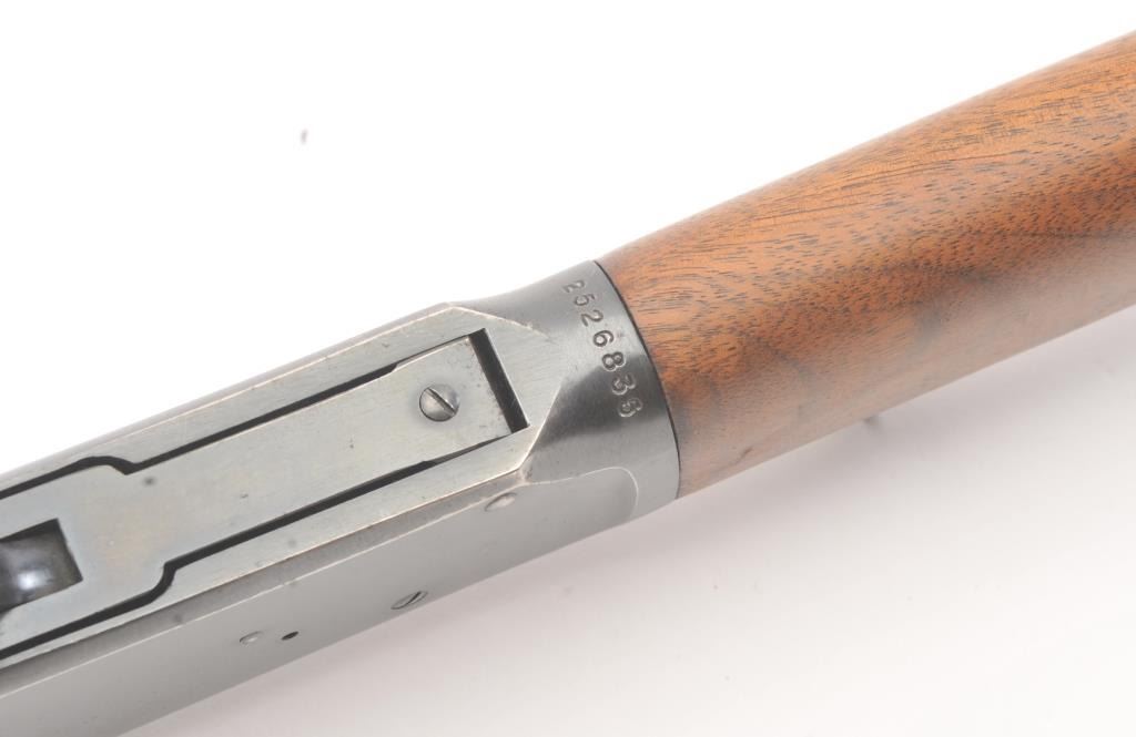 Winchester Model 94 lever action rifle, .30-30 caliber, Serial #2526835. The rifle is in very good overall condition with a 20” barrel and full-length magazine. The rifle retains a significant amount of thinning blue finish with high point edge wear and light scratches. The smooth wood stocks are in good condition showing moderate wear and a ventilated rubber recoil pad. The bore is good, the action is crisp and the markingsare sharp. Est.: $250-$500. (Modern).