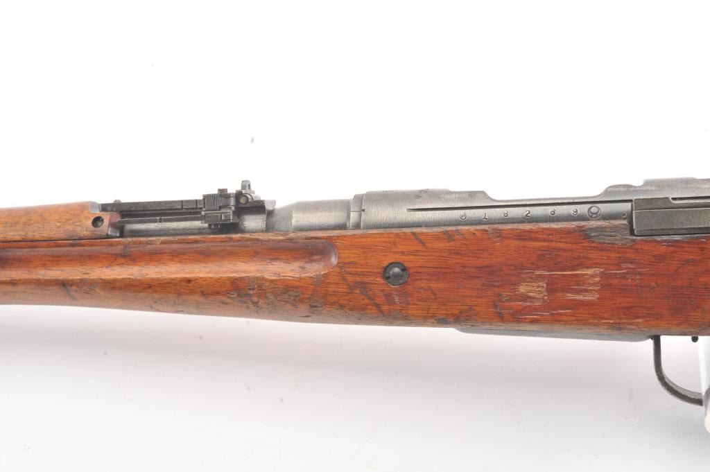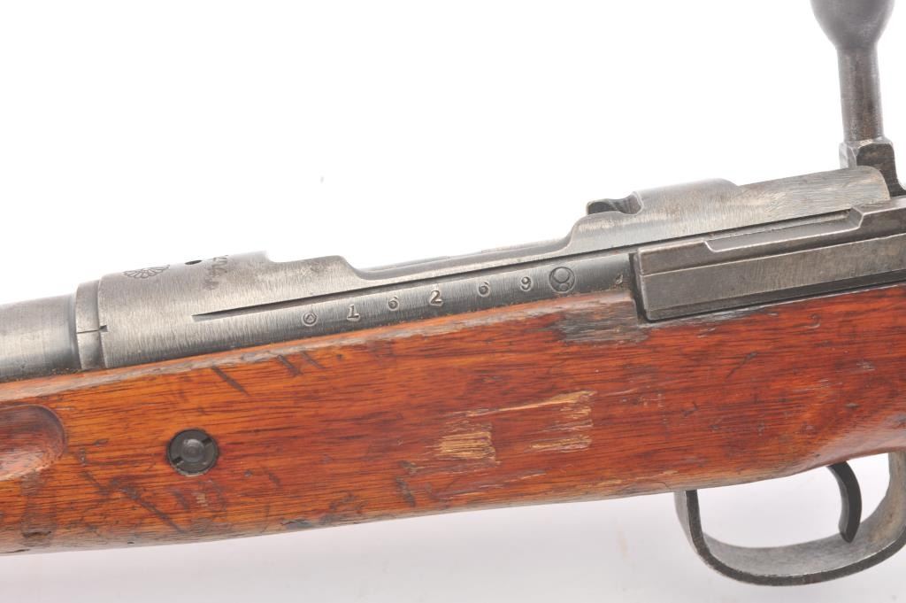 Japanese Arisaka Type 99 bolt action rifle, 7.7 mm caliber, Serial #16269. The rifle is in good overall condition with a 26” barrel with a protected blade front and military ladder rear sight with the aircraft wingsintact. The rifle retains a significant amount of military finish with mottled patina and the Mum is intact on the front ring. The smooth wood stock is in good condition showing heavy use with the ramrod, slingswivels and the butt ends with a smooth steel butt plate. The bore is fair and the action functions well. Est.: $200-$400. (C+R).