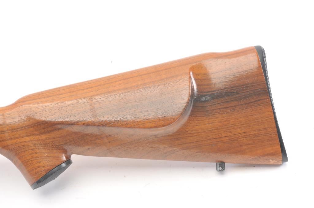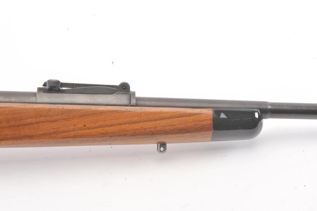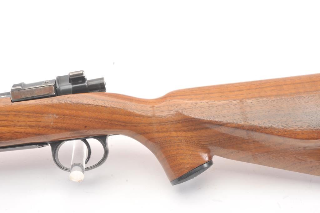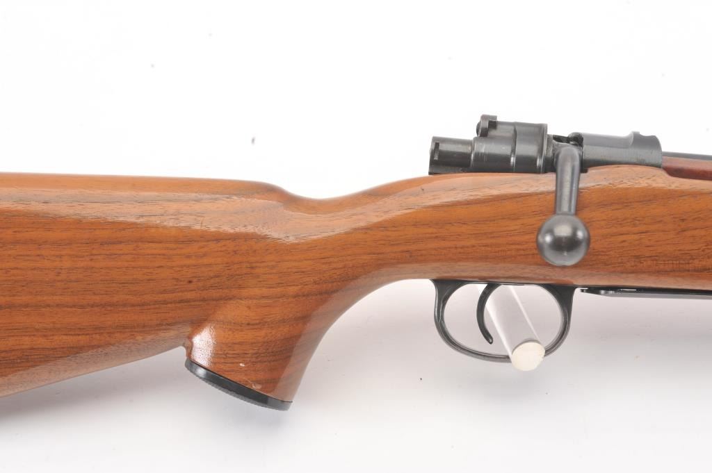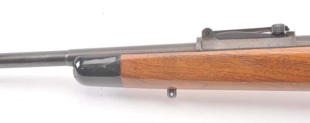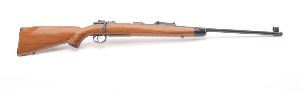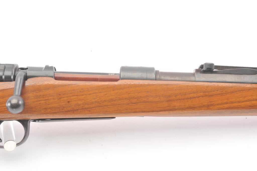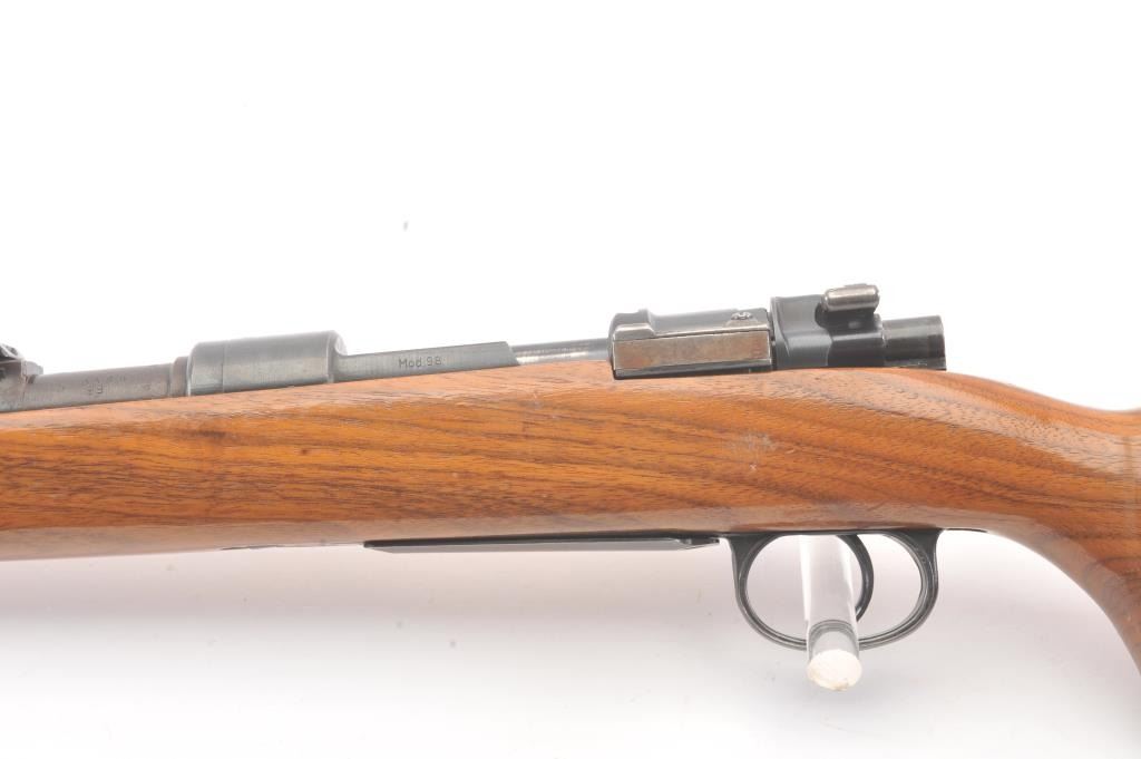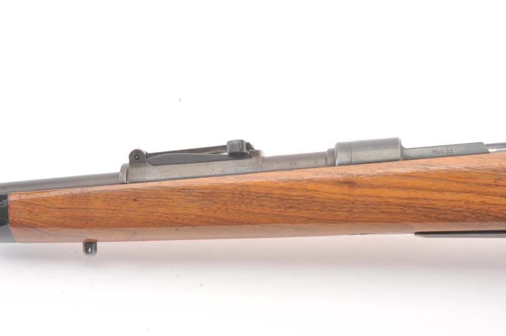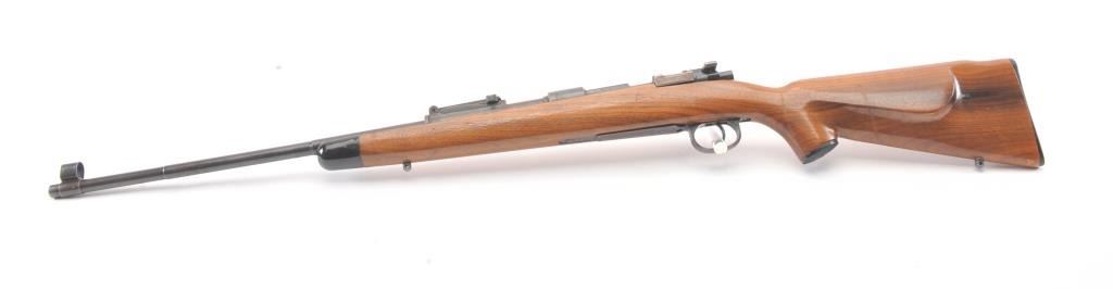 Custom Mauser 98 bolt action sporting rifle, 8 x 57 caliber, Serial #3384. The rifle is in very good overall condition with a 24” military barrel with a hooded front sight and military tangent style rear sight. Therifle retains a significant amount of military finish with wear at the muzzle. The rifle has numerous Nazi Waffen Eagle proofs while the front ring is marked, “dou” and dated 1944. The smooth wood sporter stock is in very good condition. The bore is fair, the action is crisp and the markings are quite good. Est.: $250-$500. (C+R).