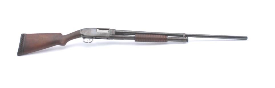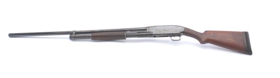 Winchester Model 12 pump action takedown shotgun, 12 gauge, full choke, 30” barrel, blued finish, wood stocks with added butt pad, S/N 454380; overall good condition with considerable blued finish remaining on metalsurfaces, very good bore, crisp action, good markings; butt stock shows old thin lateral crack at wrist and the added butt pad is a White Line product. (Modern). Est.: $150-$300.