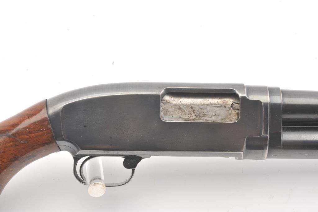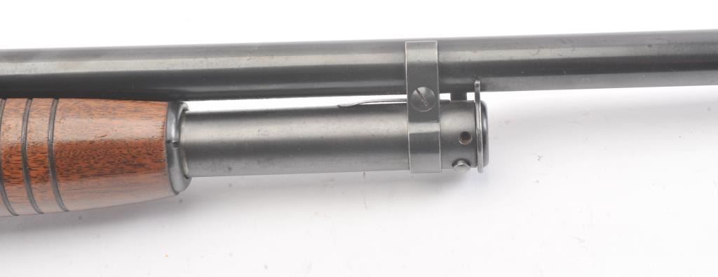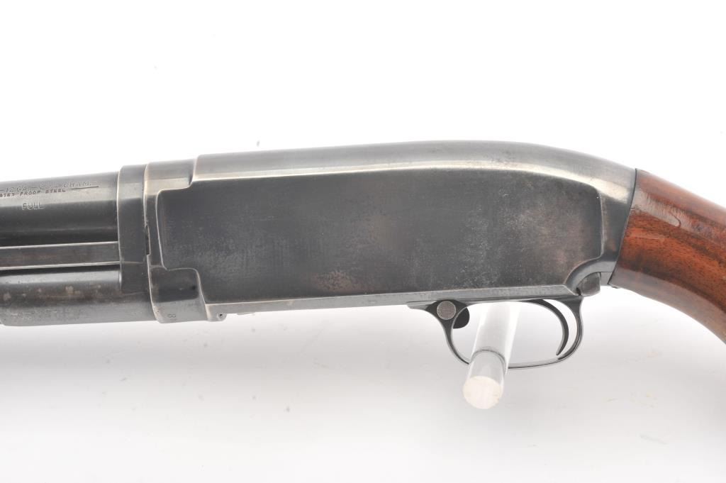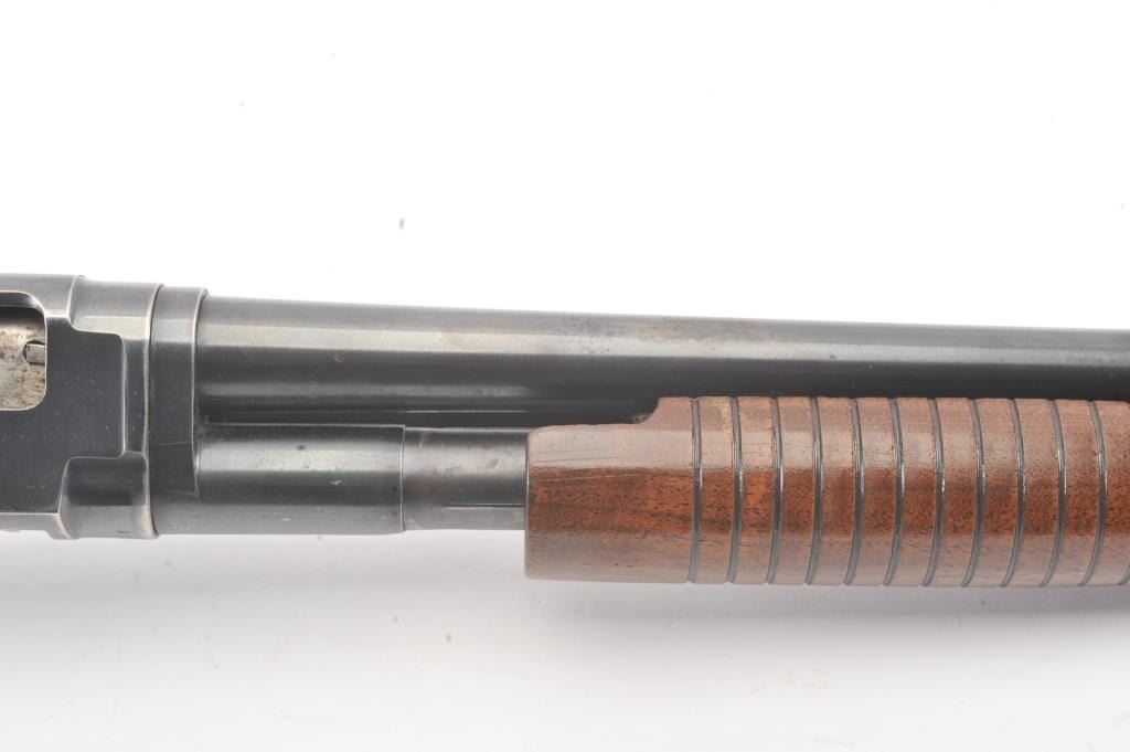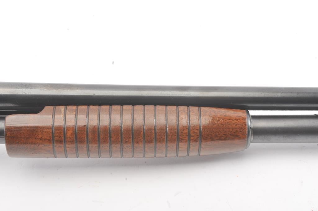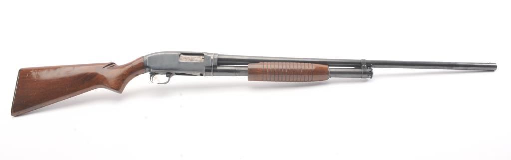 Winchester Model 12 pump shotgun, 12 gauge, Serial #1664748. The shotgun is in very good overall condition with a 30” barrel with a steel bead front sight. The shotgun retains the majority of the blue finish showingscratches and light surface rust in areas. The shotgun has a full choke with 2 ¾” chamber. The smooth wood stock is in very good condition with minor marks and mars. The buttstock ends with a checkered plasticbutt plate providing a 14” LOP. The bore is good, the action is crisp and the markings are sharp. Est.: $250-$500. (C+R).