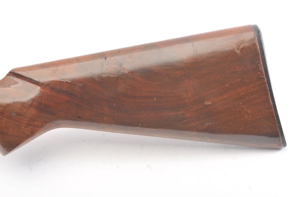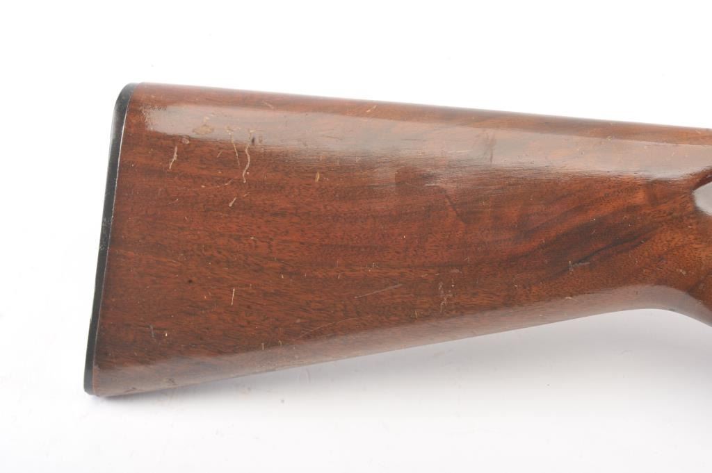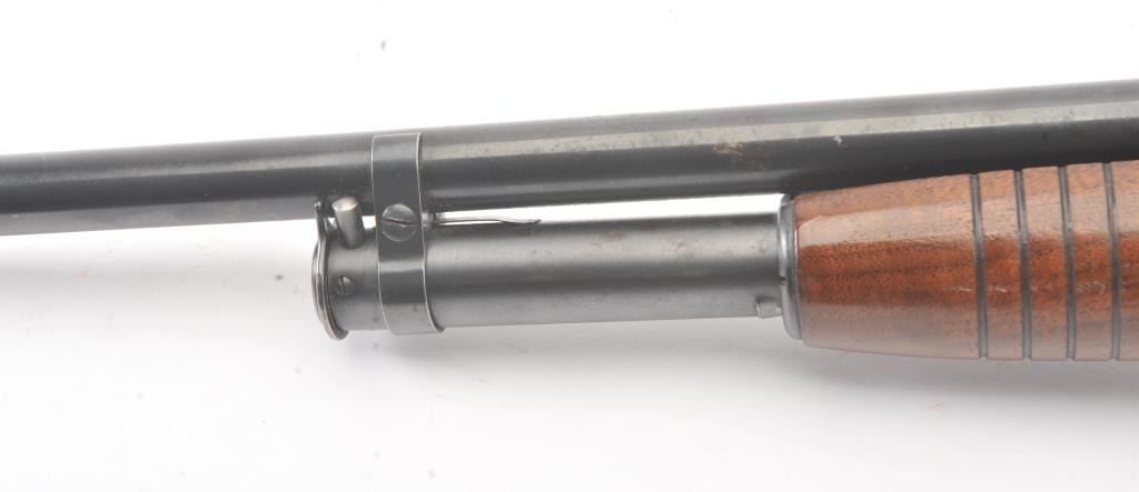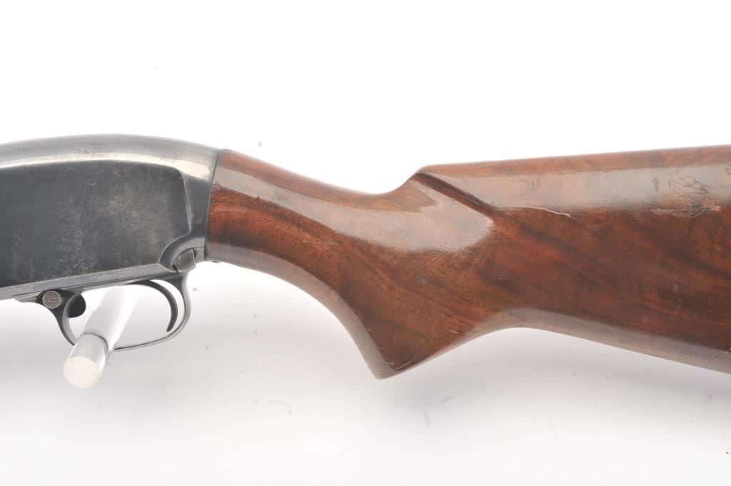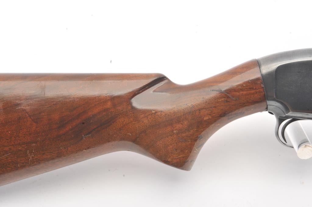 Winchester Model 12 pump shotgun, 12 gauge, Serial #1664748. The shotgun is in very good overall condition with a 30” barrel with a steel bead front sight. The shotgun retains the majority of the blue finish showingscratches and light surface rust in areas. The shotgun has a full choke with 2 ¾” chamber. The smooth wood stock is in very good condition with minor marks and mars. The buttstock ends with a checkered plasticbutt plate providing a 14” LOP. The bore is good, the action is crisp and the markings are sharp. Est.: $250-$500. (C+R).