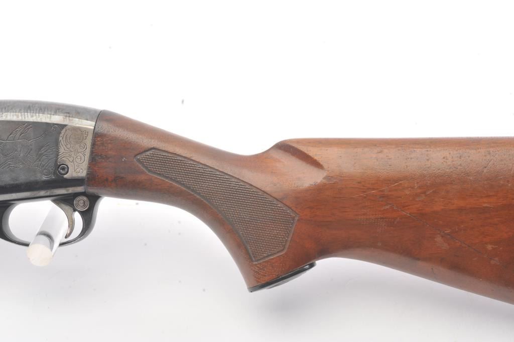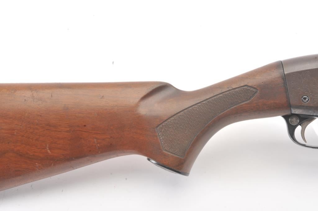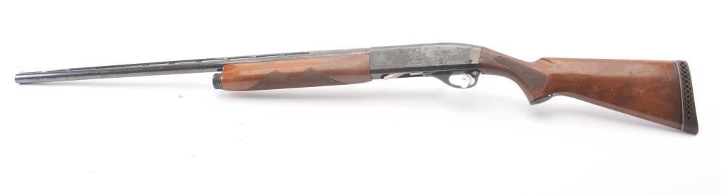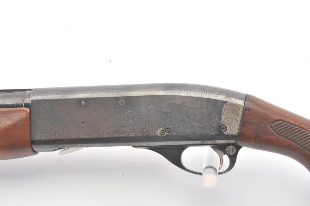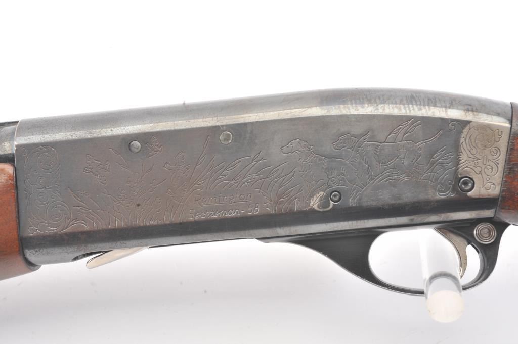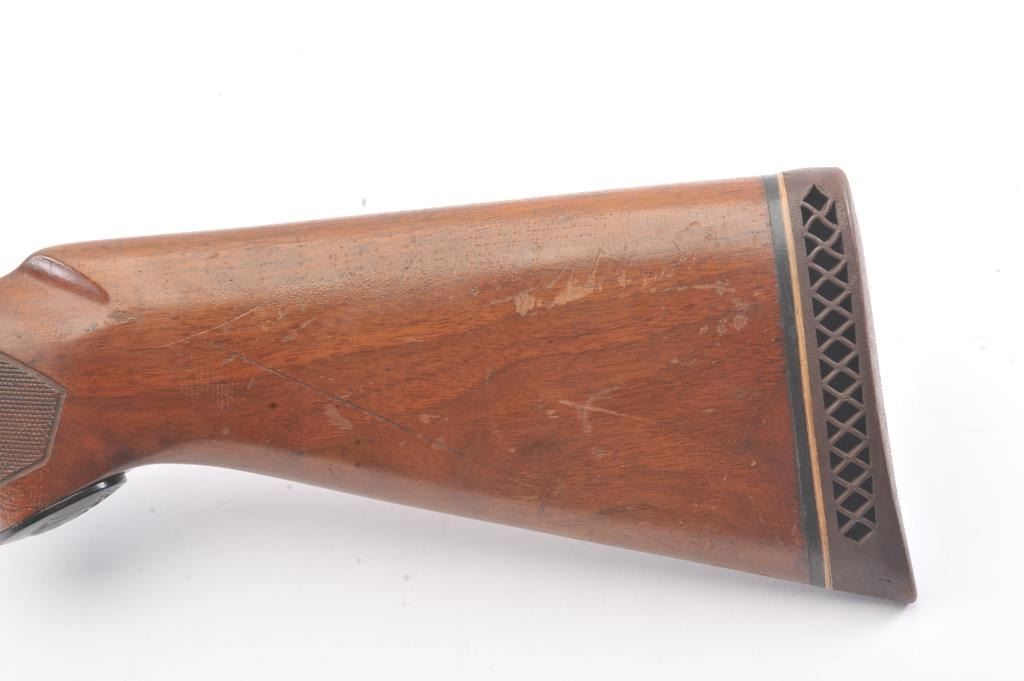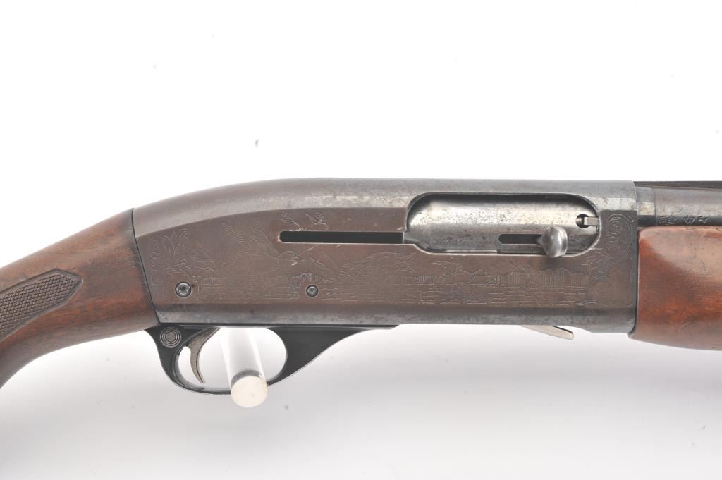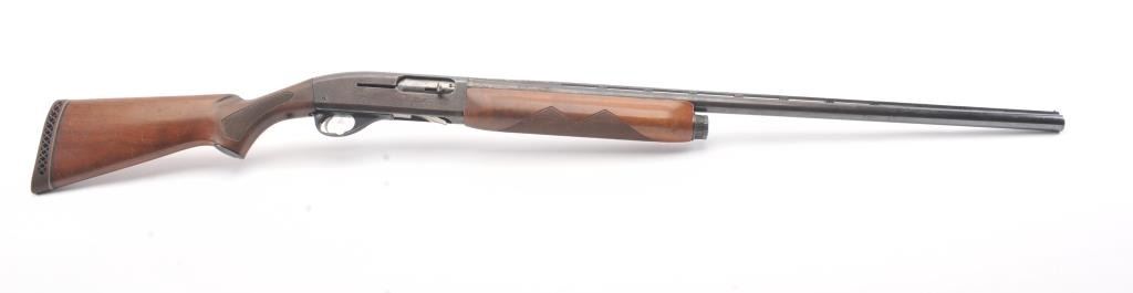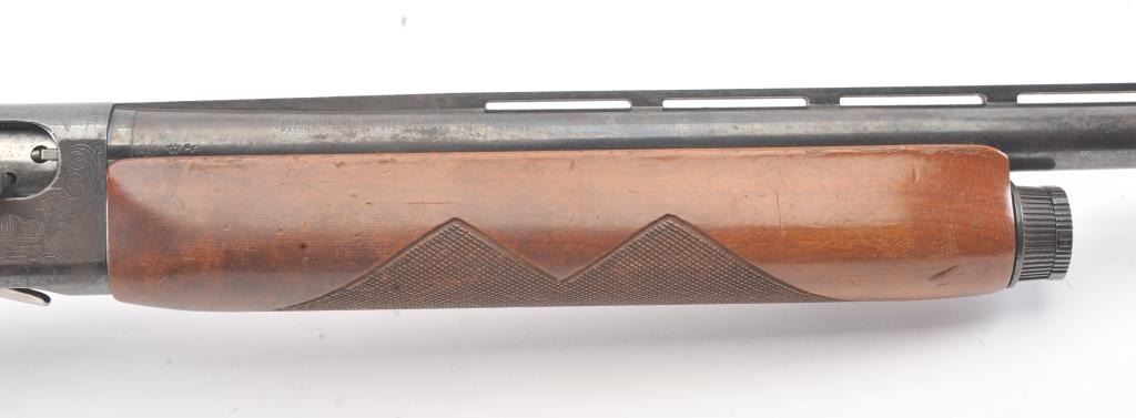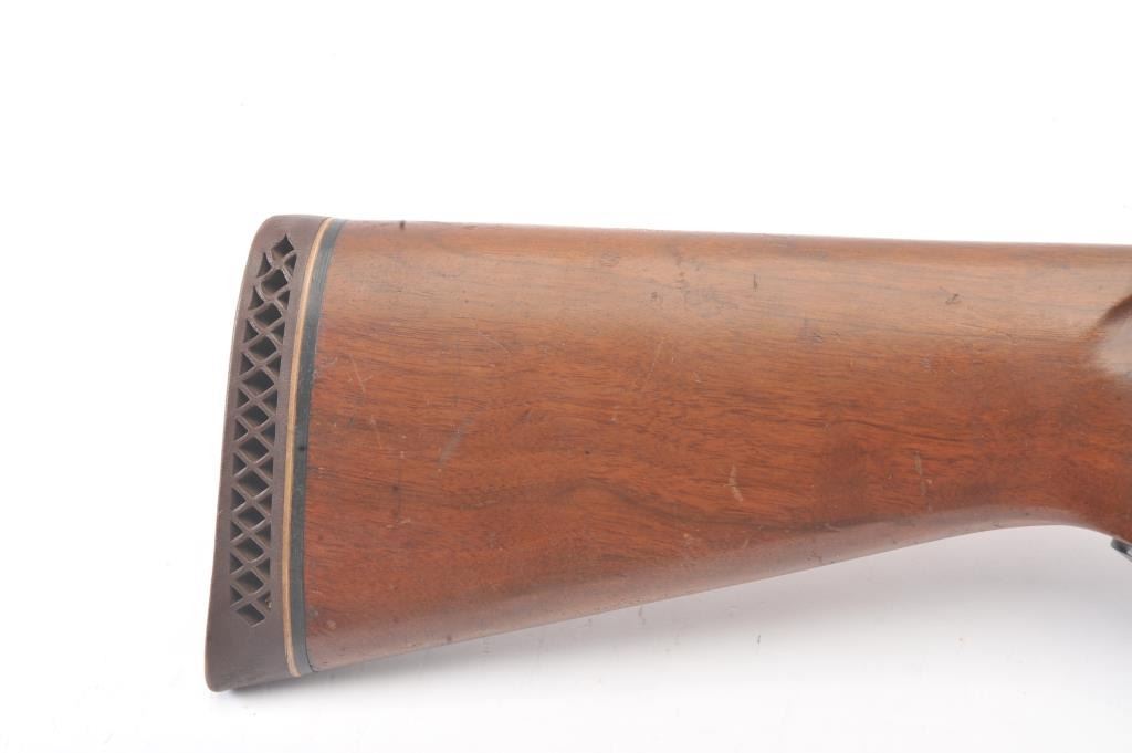 Remington Model 58 semi-automatic shotgun, 12 gauge, Serial #161138V. The shotgun is in good overall condition with a 30” barrel with a full-length ventilated rib and a steel bead front sight. The shotgun retains themajority of the blue finish with light to moderate surface rust on the barrel and loss of finish on the right side of the receiver. The shotgun is choked full with a 2 ¾” chamber. The checkered wood stock is in good condition with mars and scratches consistent with field use. The butt stock ends with a ventilated rubber recoil pad providing a 14 ¼” LOP. The bore is good, the action is crisp and the markings are legible. Est.:$160-$320. (Modern).