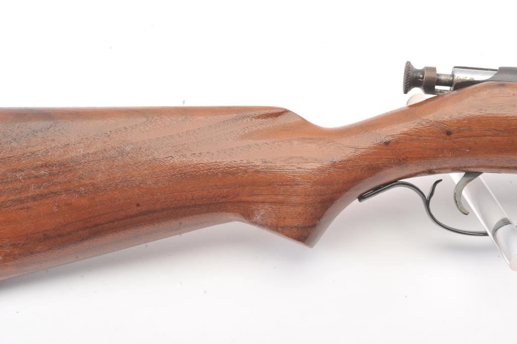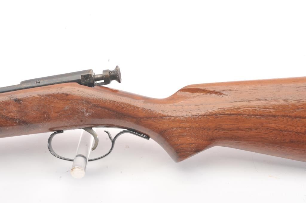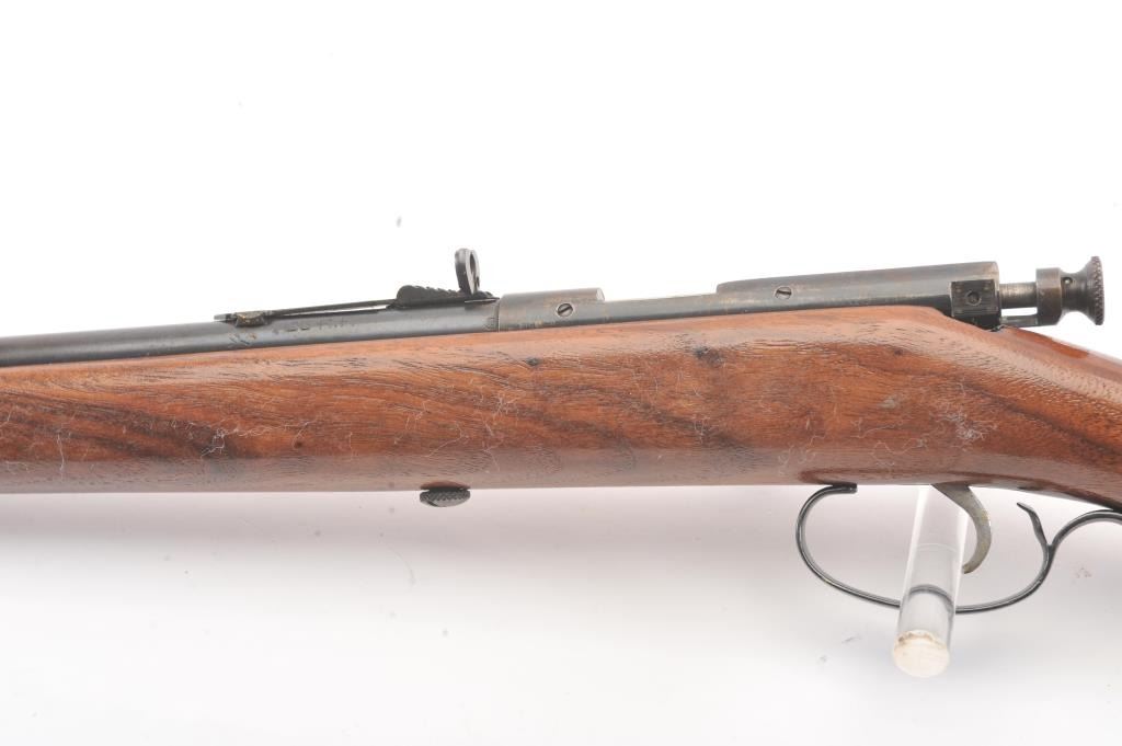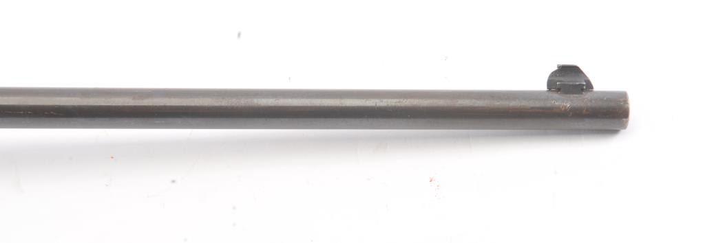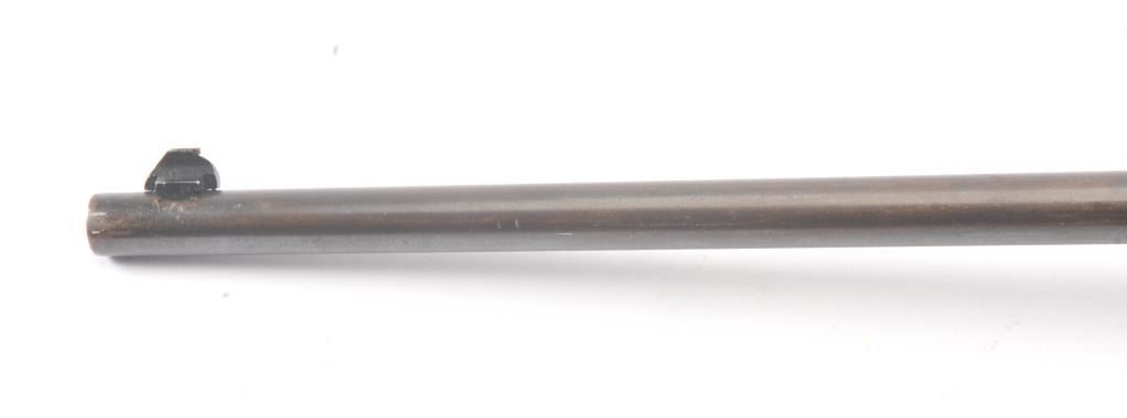 J. Stevens single shot rifle, .25 rim fire caliber, Serial #NSNV. The rifle is in good overall condition with a 24” barrel marked, “.25 RF”. The rifle has gone to an overall dark patina with wear at the muzzle. Thesmooth wood stock is in good condition with an extra coat of varnish added and a ventilated rubber recoil pad. The bore is fair, the action functions and the markings are legible. Est.: $200-$400. (C+R).