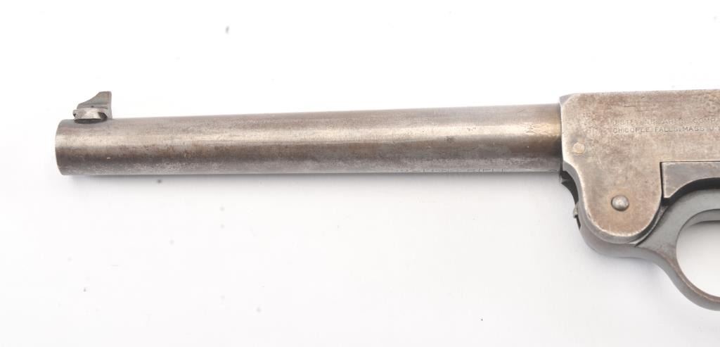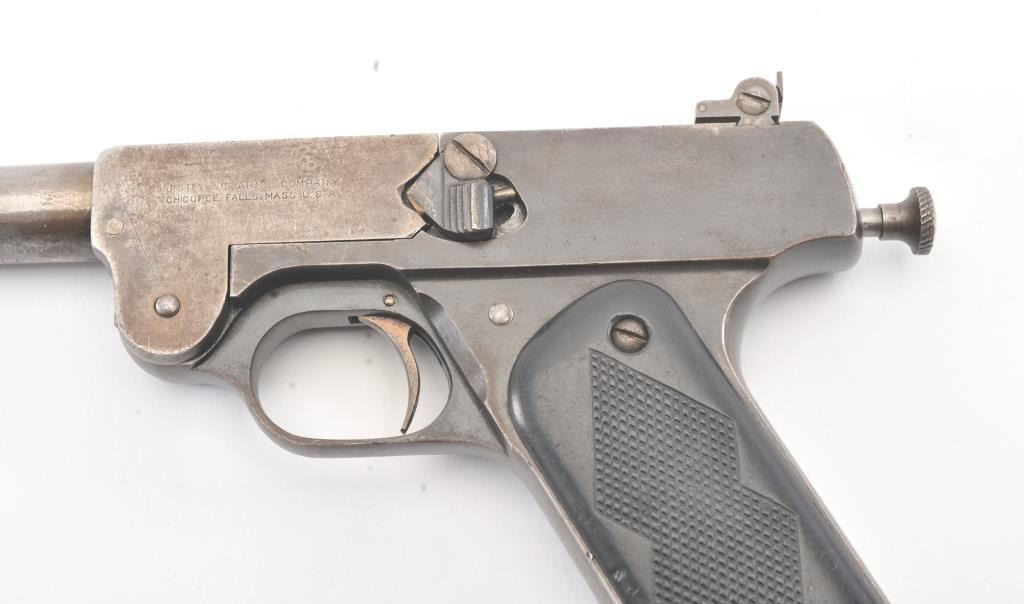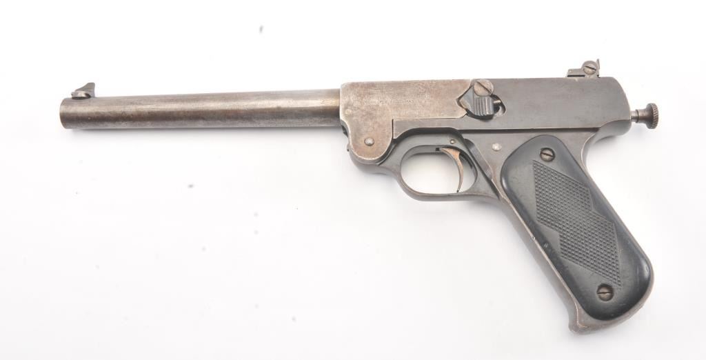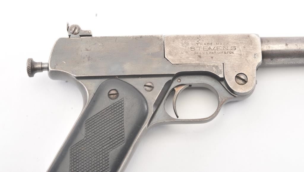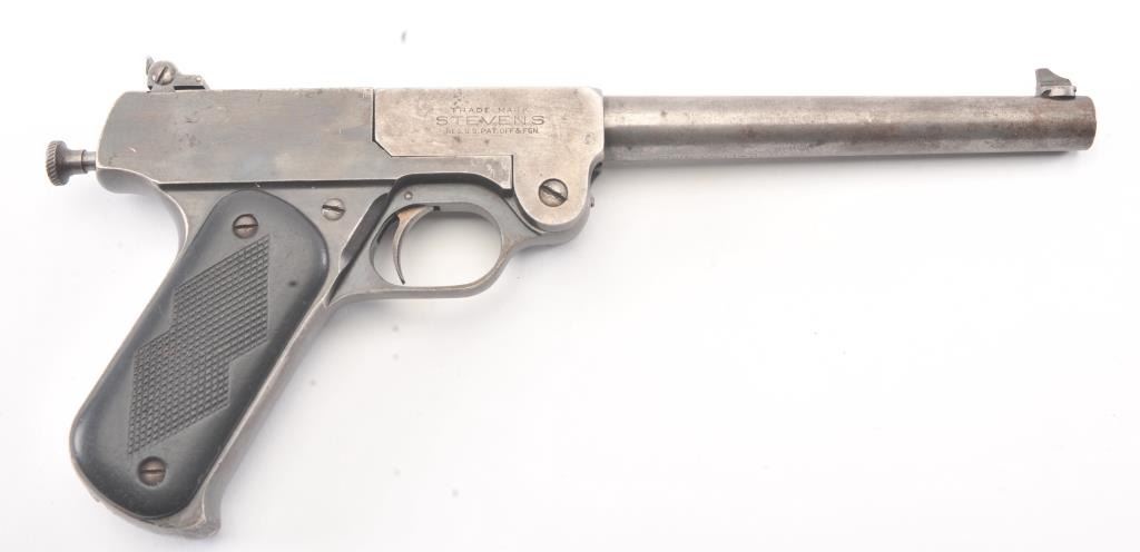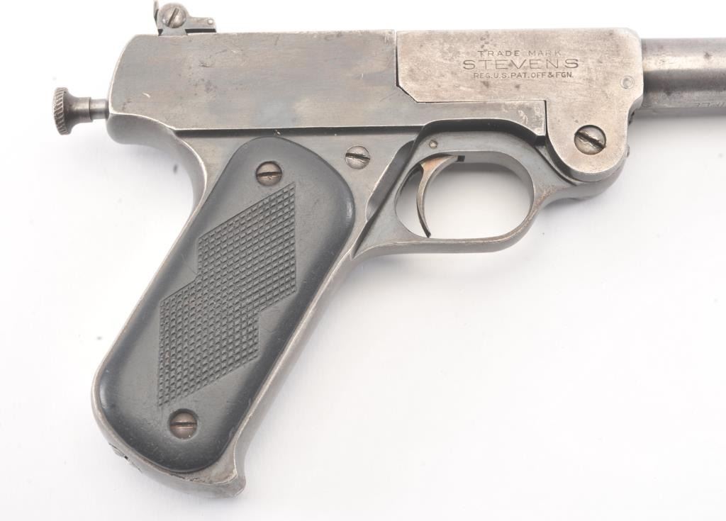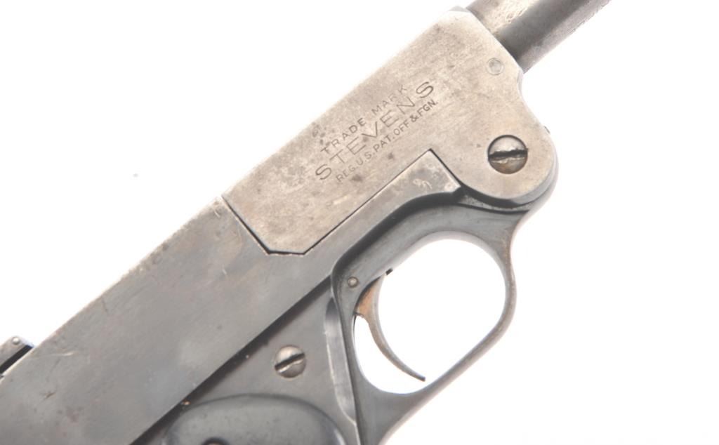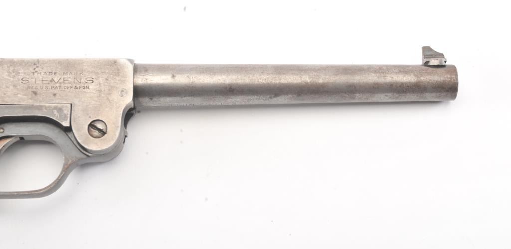J. Stevens No. 10 single shot pistol, .22 Long Rifle caliber, Serial #1266. The pistol is in good overall condition with an 8” barrel. The barrel has gone to an overall grey patina with light surface erosion andsignificant toning blue finish at the rear of the action. The checkered hard rubber grips are in good condition showing wear and small mars. The bore is fair, the action functions and the markings are legible.Est.: $150-$300. (C+R/PPT