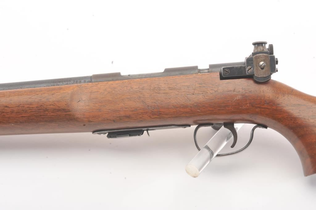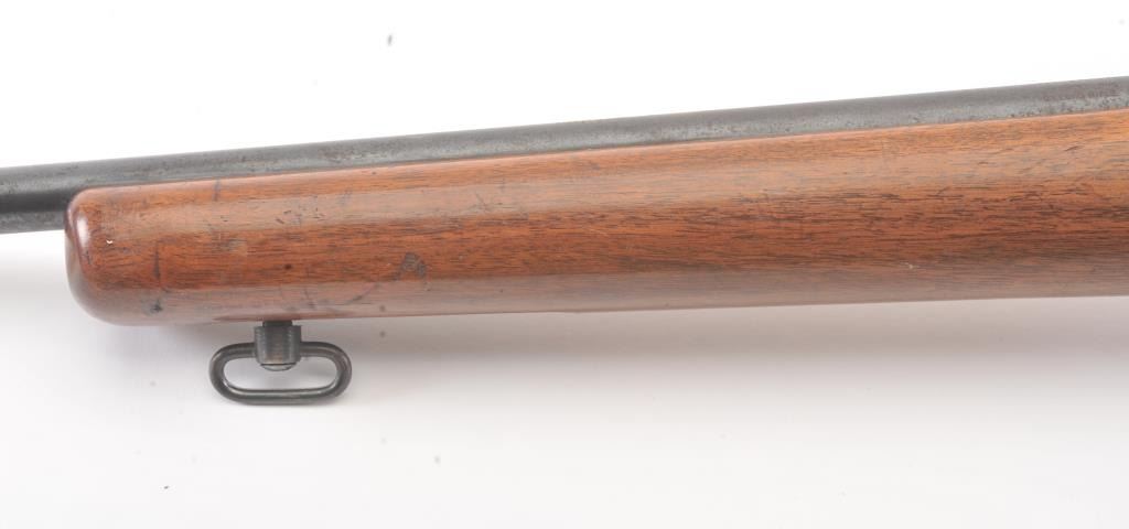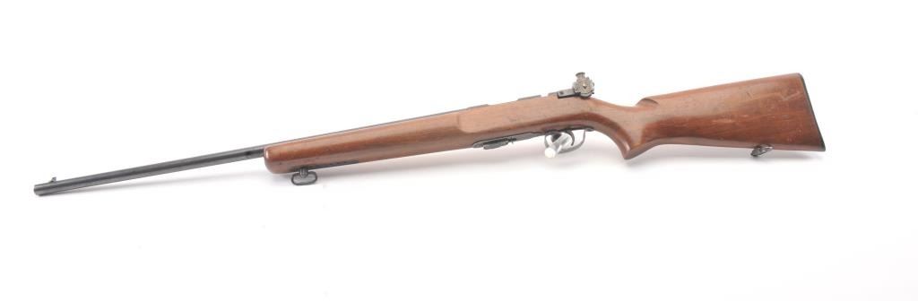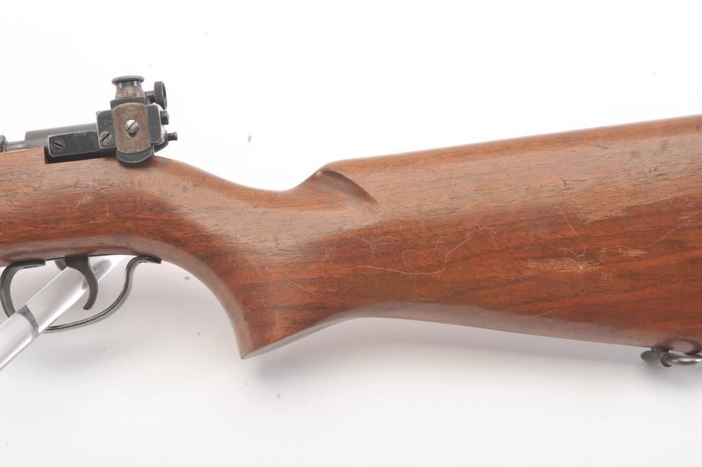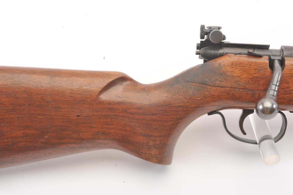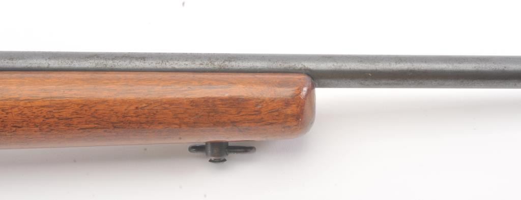 Remington Model 521 T Junior Special bolt rifle, .22 caliber, Serial #NSNV. The rifle is in good overall condition with a 25” barrel. The metal surfaces retain the majority of the blue finish with lightsurface rust and erosion. A Lyman aperture sight has been added at the rear of the action. The smooth wood stock has a beaver tail fore end and is in good condition. The bore is good, the action is crisp and themarkings are sharp. The lot includes one correct magazine. Est.: $140-$280. (Modern).