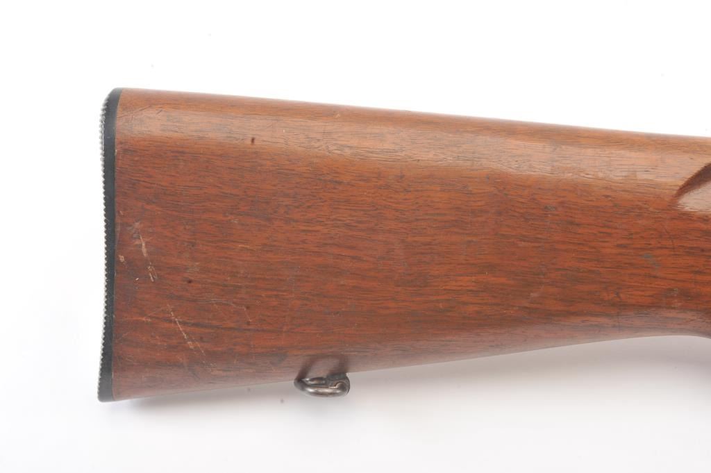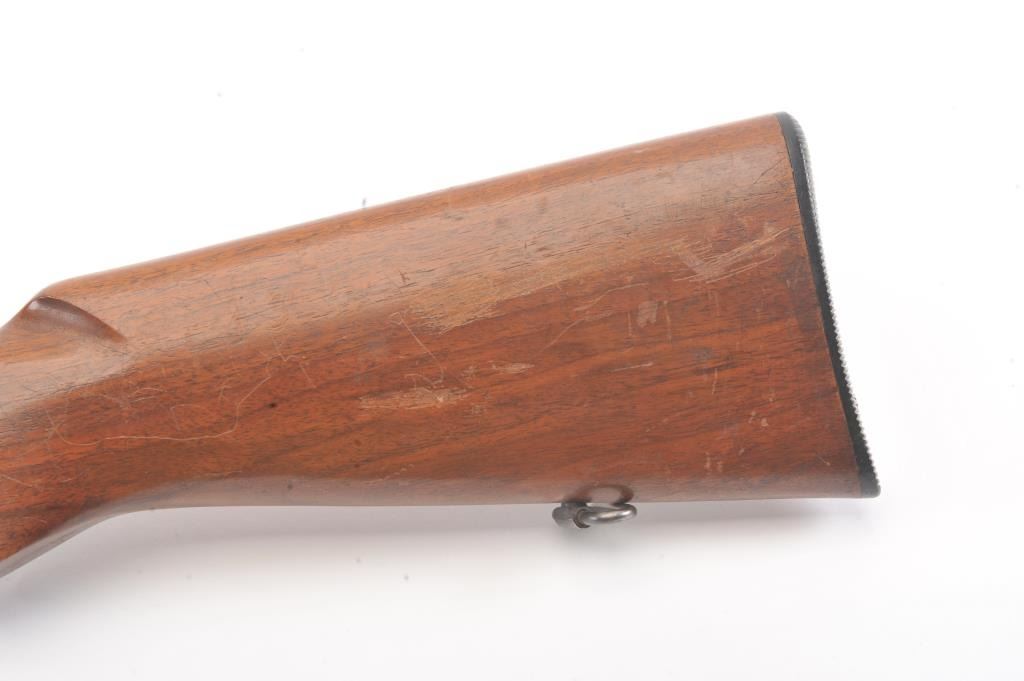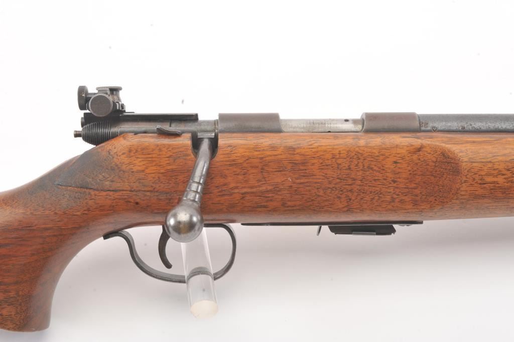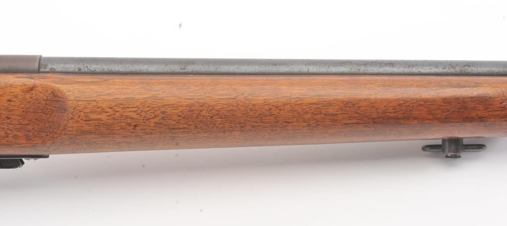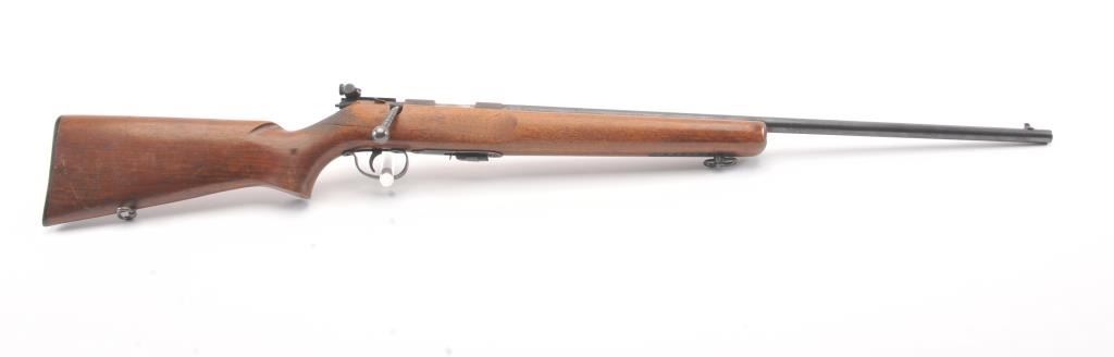 Remington Model 521 T Junior Special bolt rifle, .22 caliber, Serial #NSNV. The rifle is in good overall condition with a 25” barrel. The metal surfaces retain the majority of the blue finish with lightsurface rust and erosion. A Lyman aperture sight has been added at the rear of the action. The smooth wood stock has a beaver tail fore end and is in good condition. The bore is good, the action is crisp and themarkings are sharp. The lot includes one correct magazine. Est.: $140-$280. (Modern).