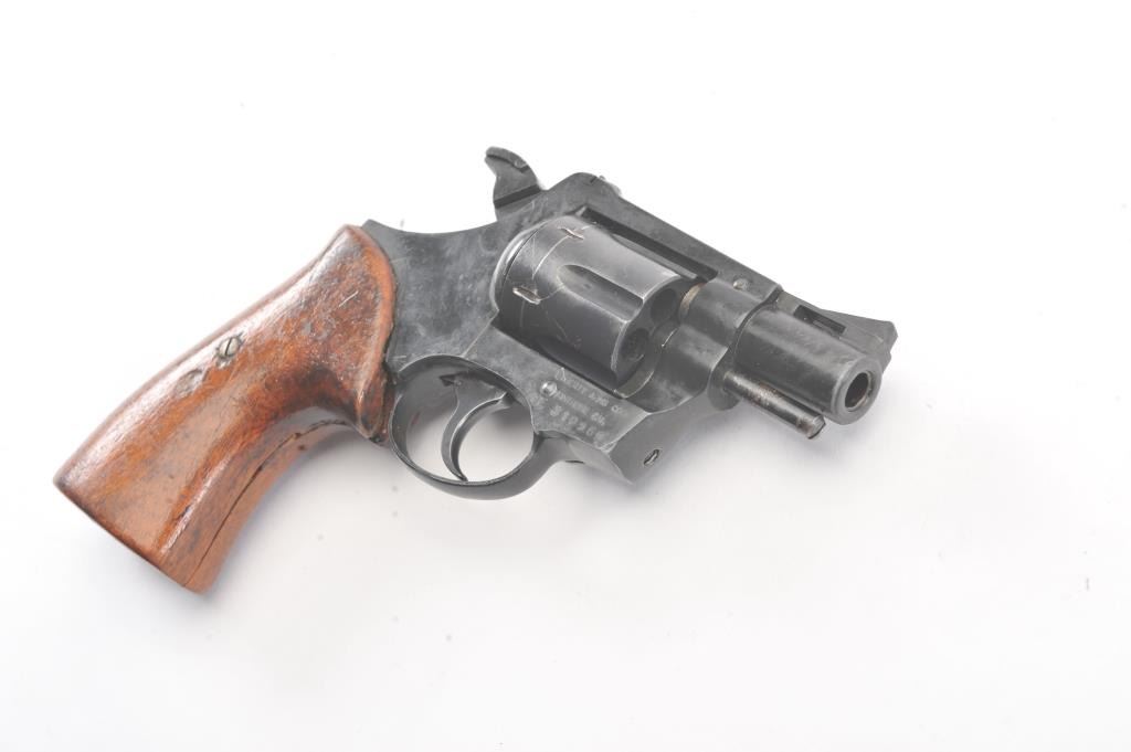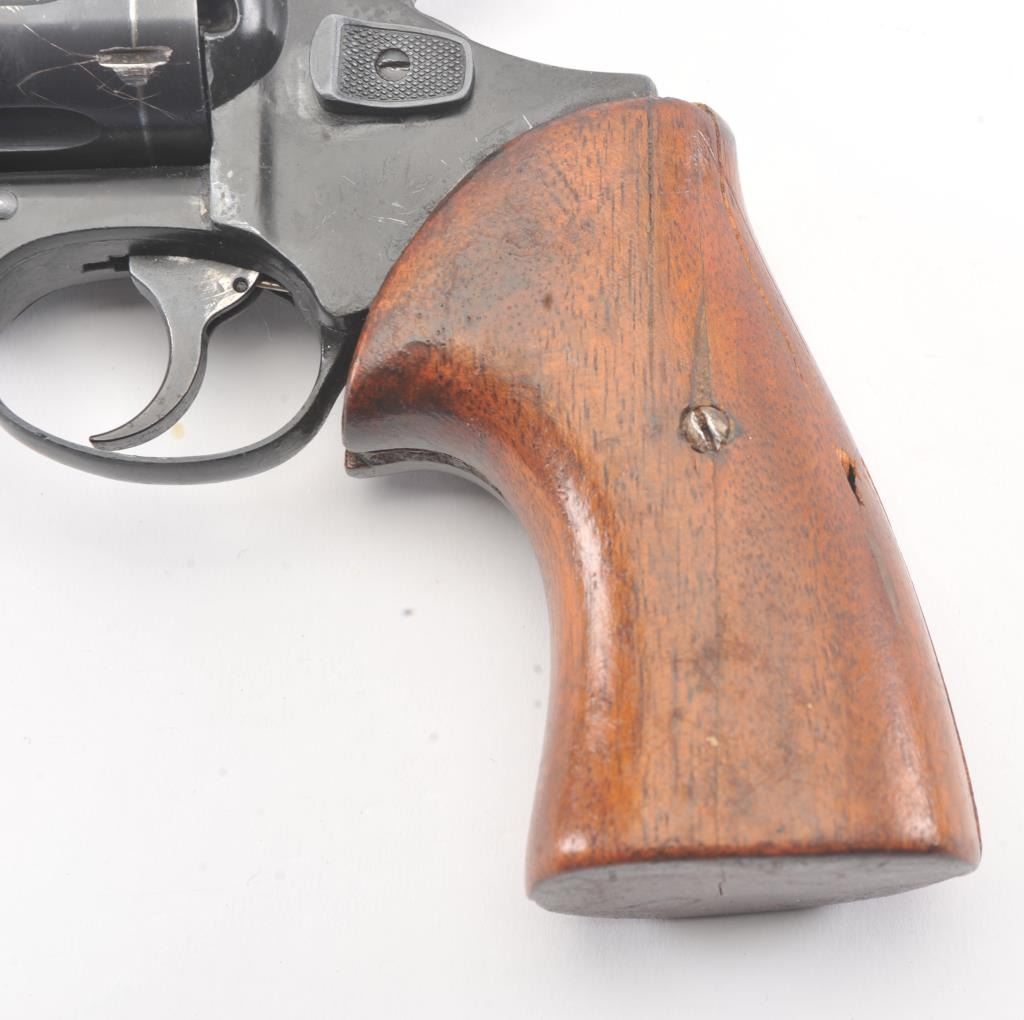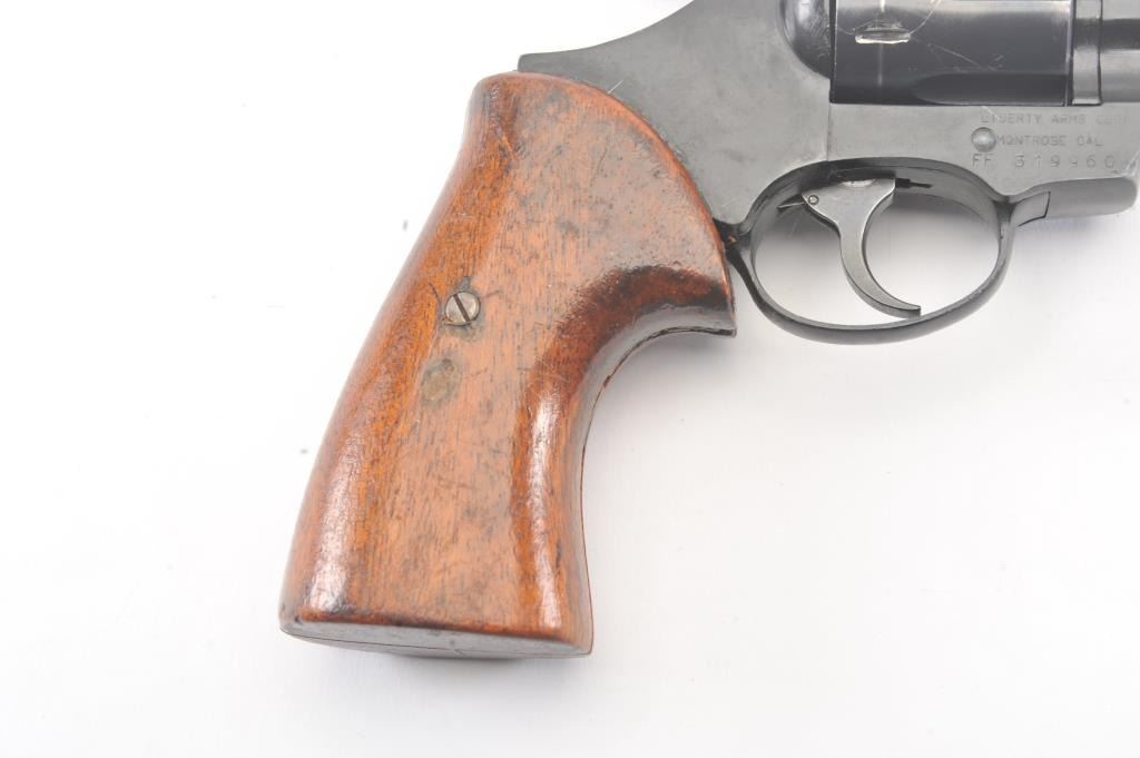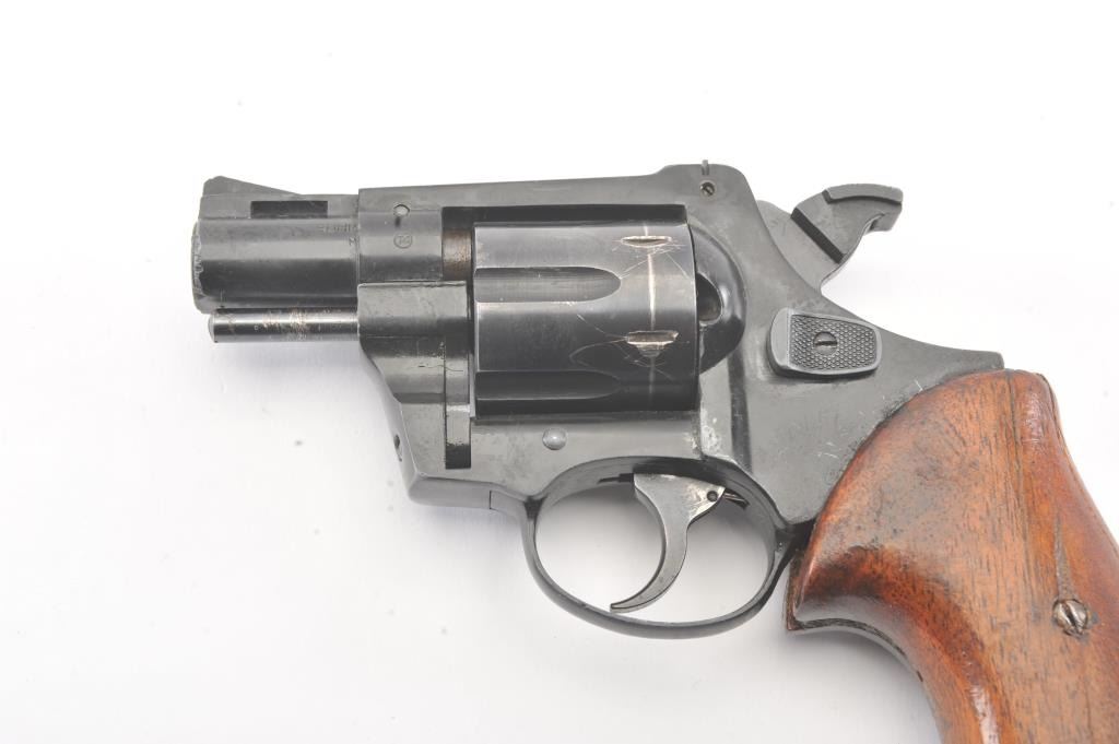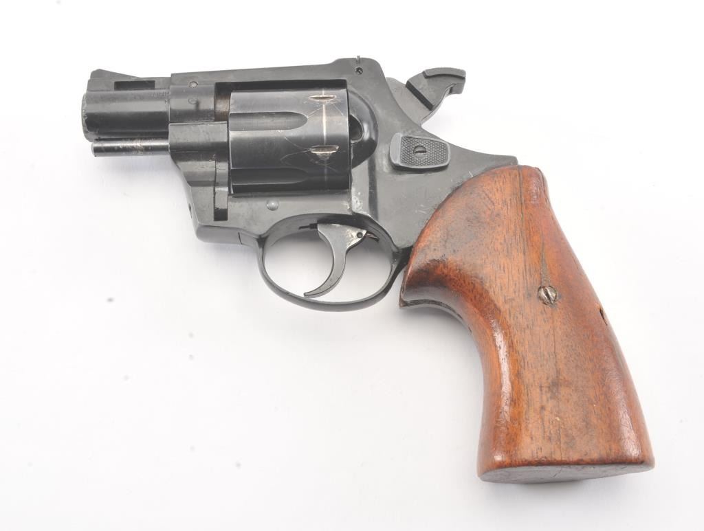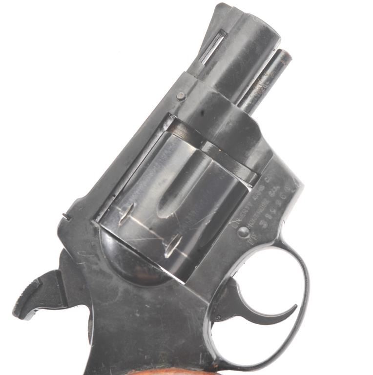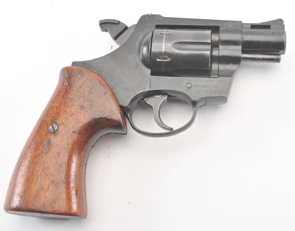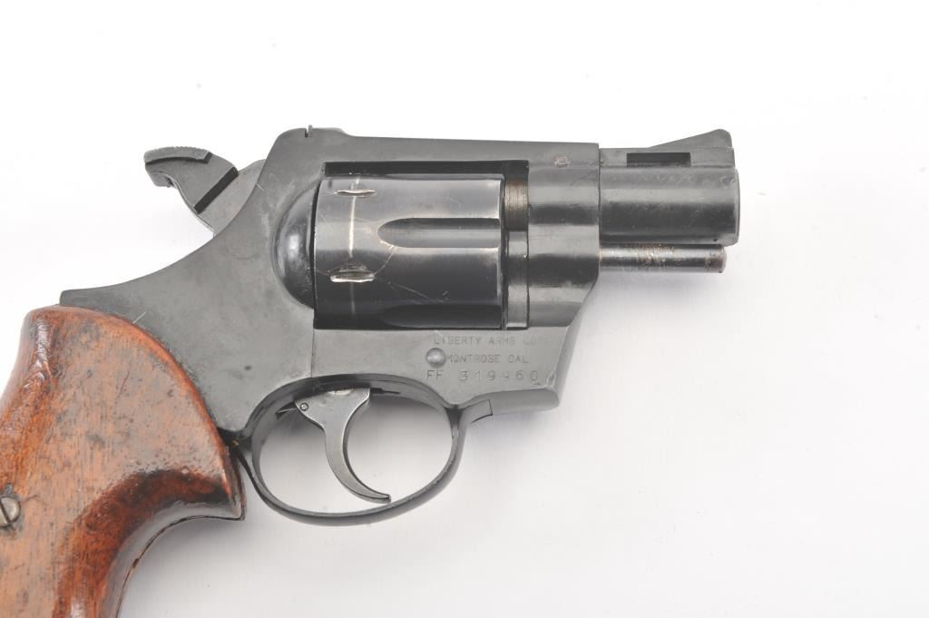 Liberty Arms Rohm DA revolver, .38 caliber, Serial #FF319960. The pistol is in good overall condition with a 2” barrel. The pistol retains the majority of the blue finish with wear at the muzzle, scratches and an index line on the cylinder. The smooth wood grips are in fair condition with scrapes, dents and a small area of damage on the back. The bore is fair, the action functions and the markings are legible.Est.: $125-$250. (Modern/PPT).