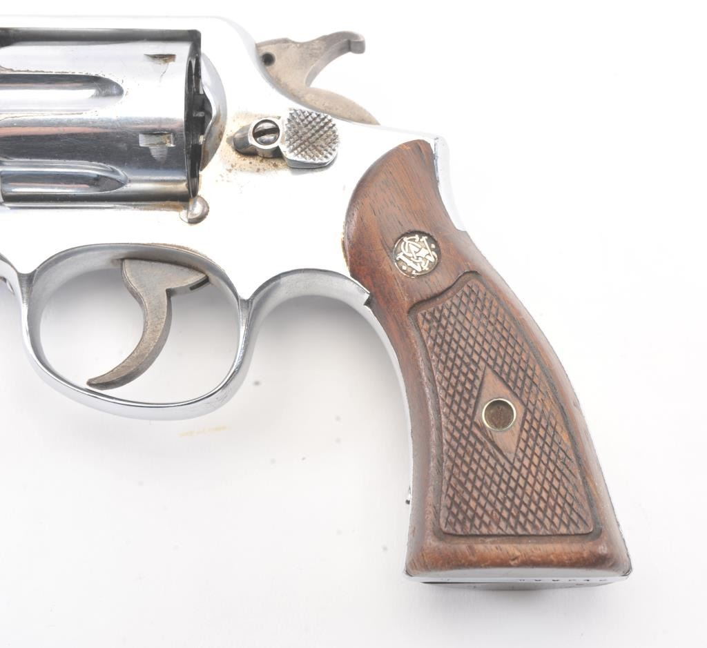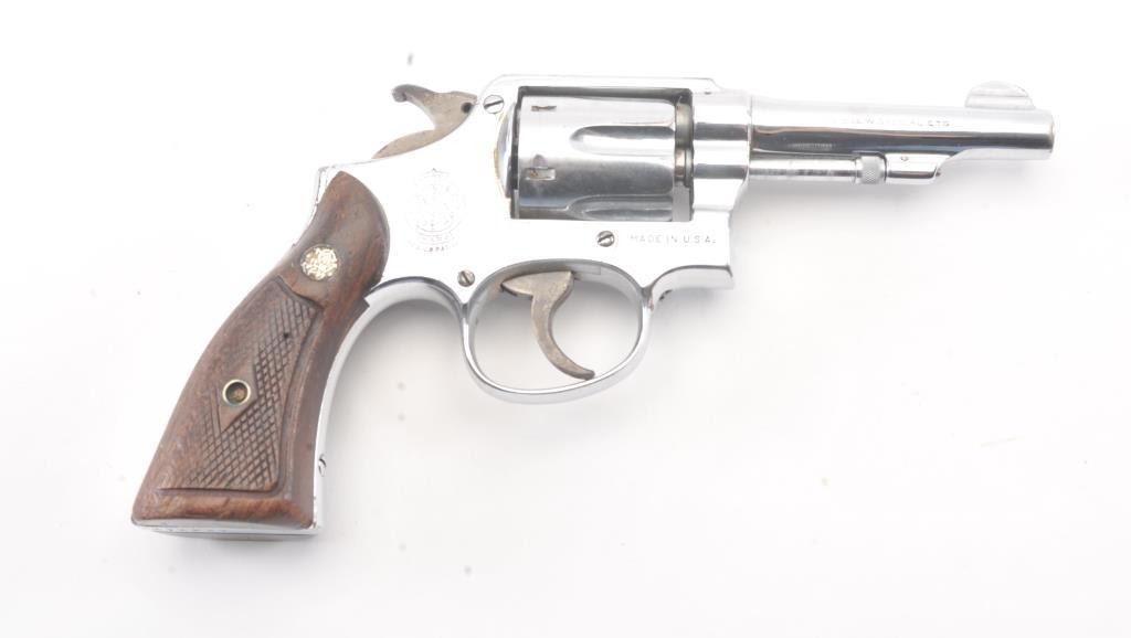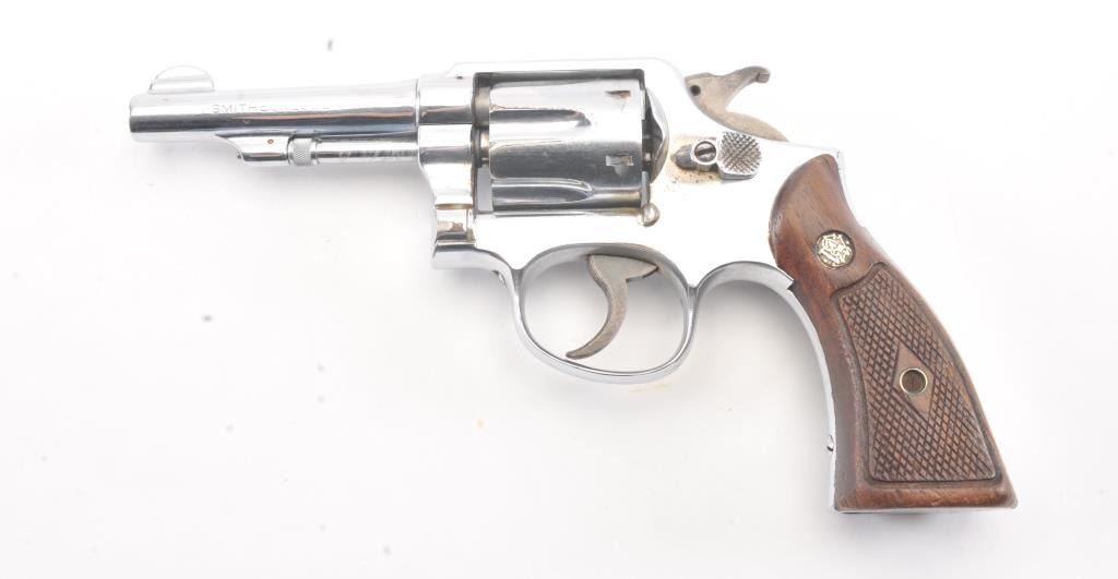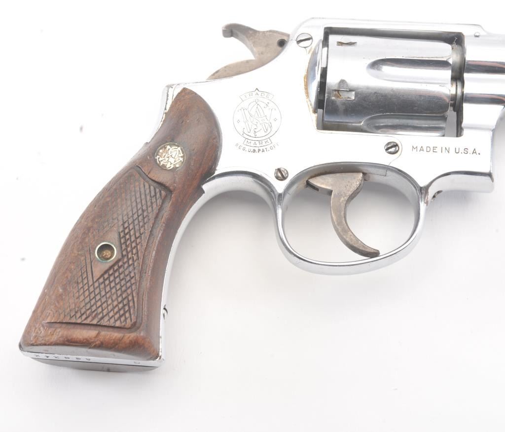 Smith & Wesson M&P DA revolver, .38 Special caliber, Serial #S866242. The pistol is in good overall condition as re-nickeled with a 4” barrel. The pistol retains nearly all of an old re-nickel finish with areas of lightsurface erosion. The hammer and trigger show muted case color. The checkered wood medallion grips are in good condition with flattening to the checkering and small mars. The bore is good, the action functions andthe markings are legible. Est.: $140-$280. (C+R/PPT).