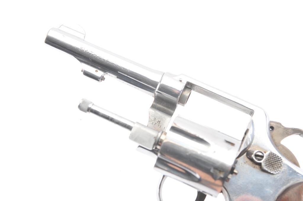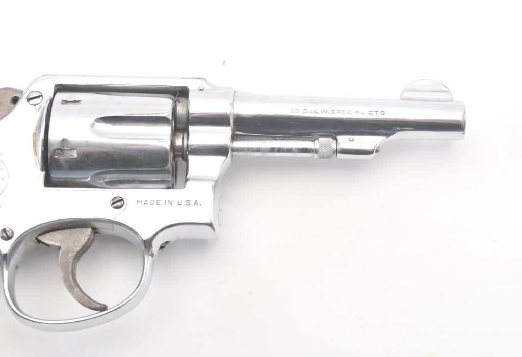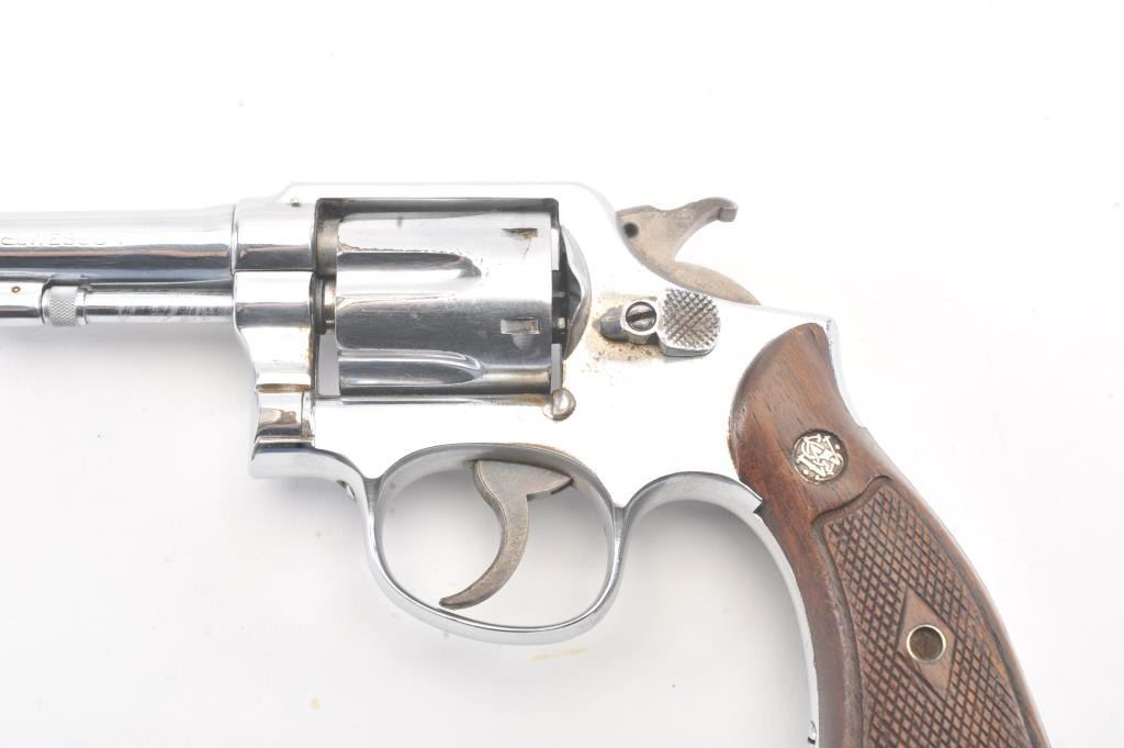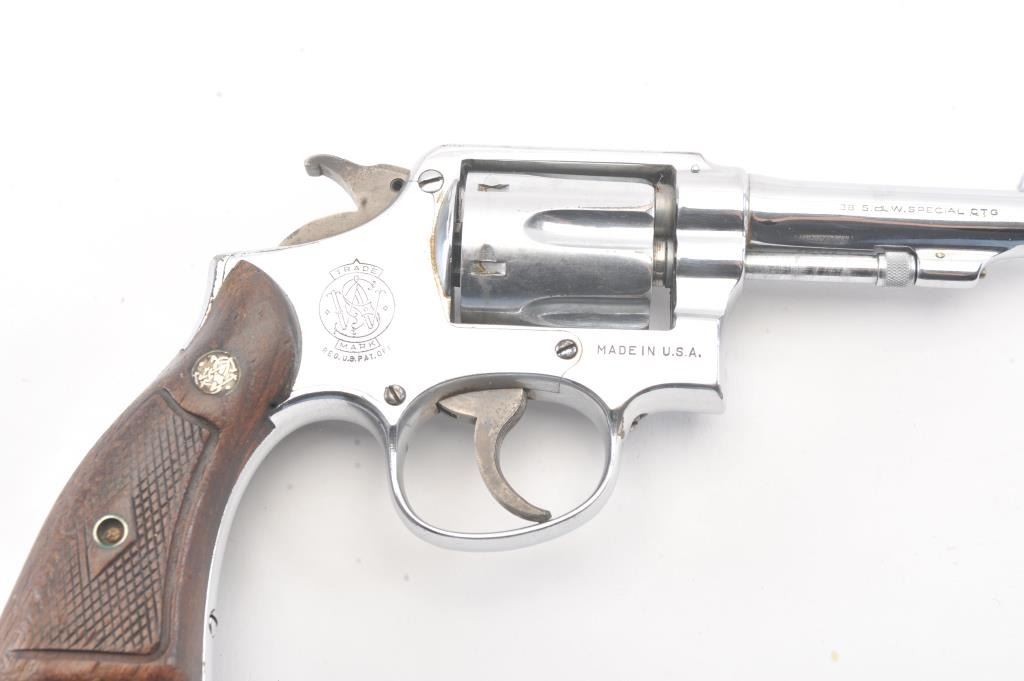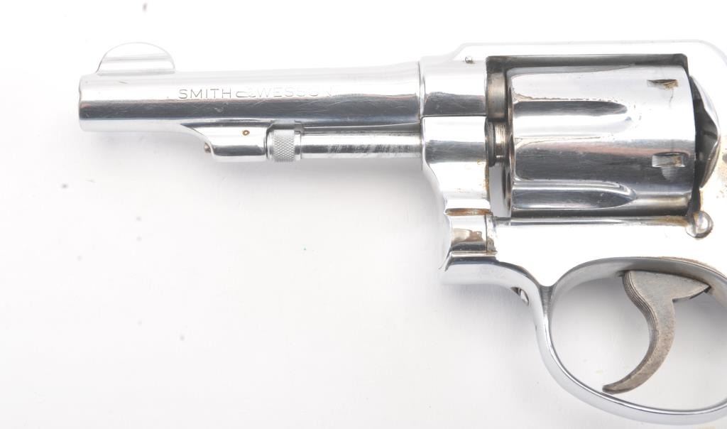 Smith & Wesson M&P DA revolver, .38 Special caliber, Serial #S866242. The pistol is in good overall condition as re-nickeled with a 4” barrel. The pistol retains nearly all of an old re-nickel finish with areas of lightsurface erosion. The hammer and trigger show muted case color. The checkered wood medallion grips are in good condition with flattening to the checkering and small mars. The bore is good, the action functions andthe markings are legible. Est.: $140-$280. (C+R/PPT).