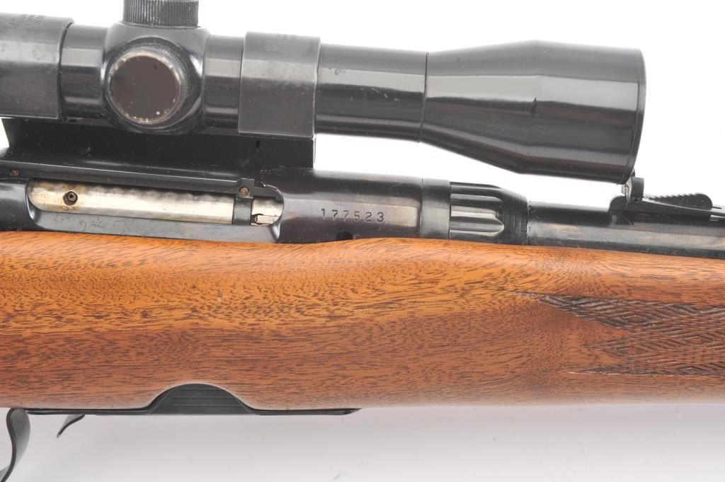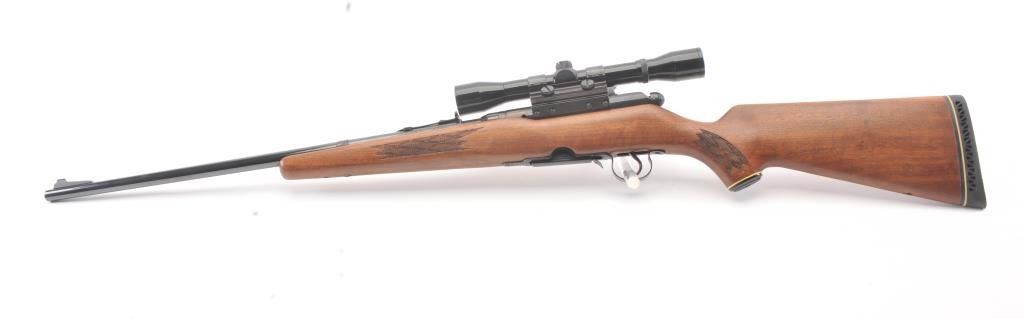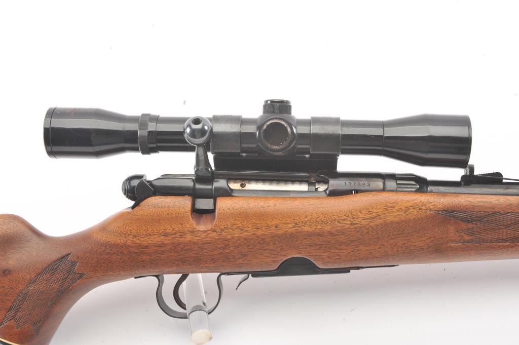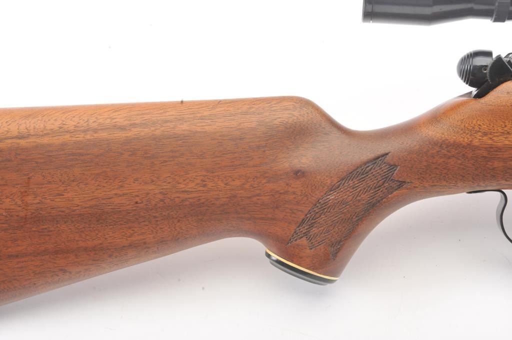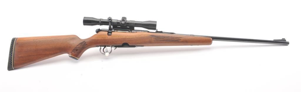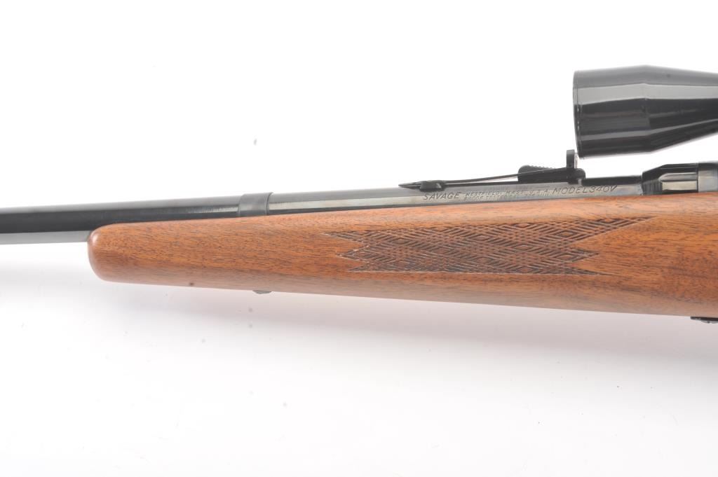 Stevens Model 340-V bolt action rifle, .225 Winchester caliber, Serial #177523. The rifle is in fine overall condition with a 24” barrel. The rifle retains nearly all of the blue finish with light handling marks. Thecheckered wood stock is in very good condition with compressions and small mars consistent with field use. The butt stock ends with a ventilated rubber pad. The bore is good, the action crisp and the markingsare sharp. The rifle is topped with a Tasco 4 x 32 fixed power scope with clear, crisp optics. The lot includes one correct magazine. Est.: $200-$400. (Modern).
