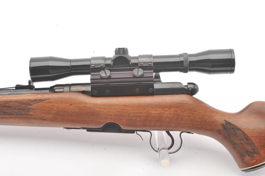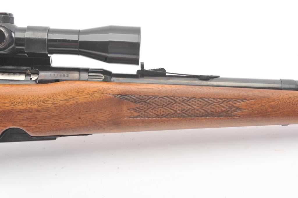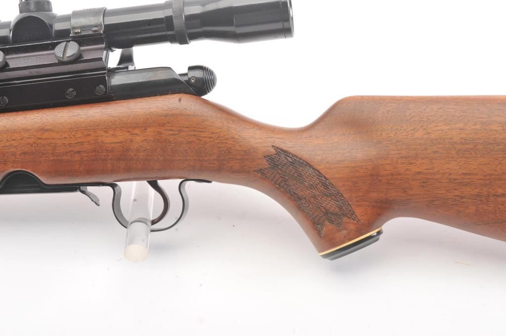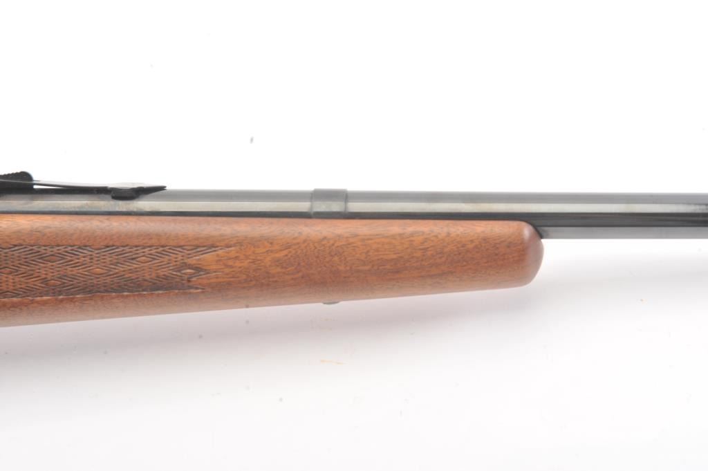 Stevens Model 340-V bolt action rifle, .225 Winchester caliber, Serial #177523. The rifle is in fine overall condition with a 24” barrel. The rifle retains nearly all of the blue finish with light handling marks. Thecheckered wood stock is in very good condition with compressions and small mars consistent with field use. The butt stock ends with a ventilated rubber pad. The bore is good, the action crisp and the markingsare sharp. The rifle is topped with a Tasco 4 x 32 fixed power scope with clear, crisp optics. The lot includes one correct magazine. Est.: $200-$400. (Modern).