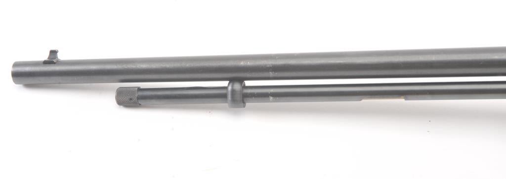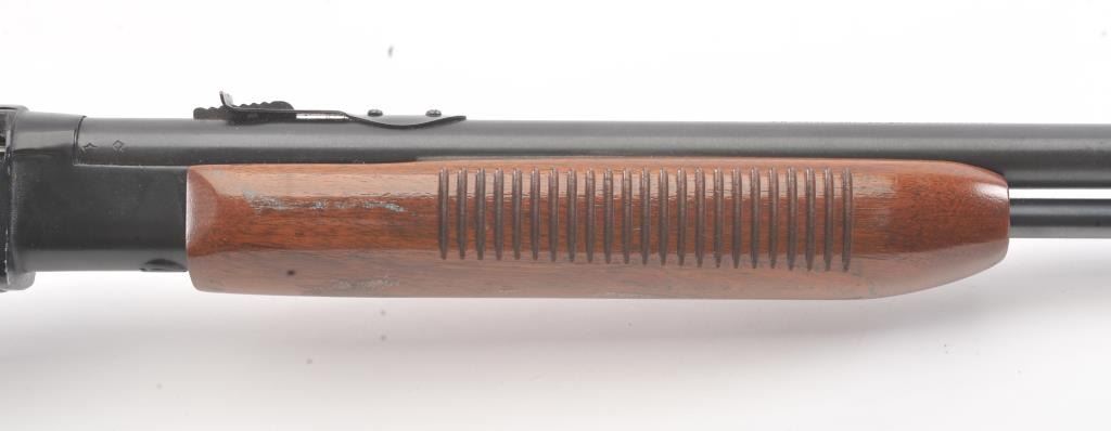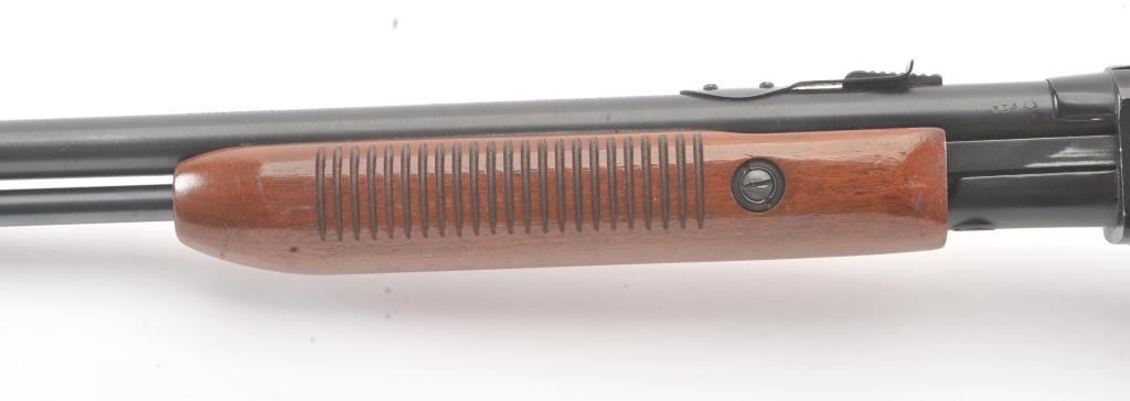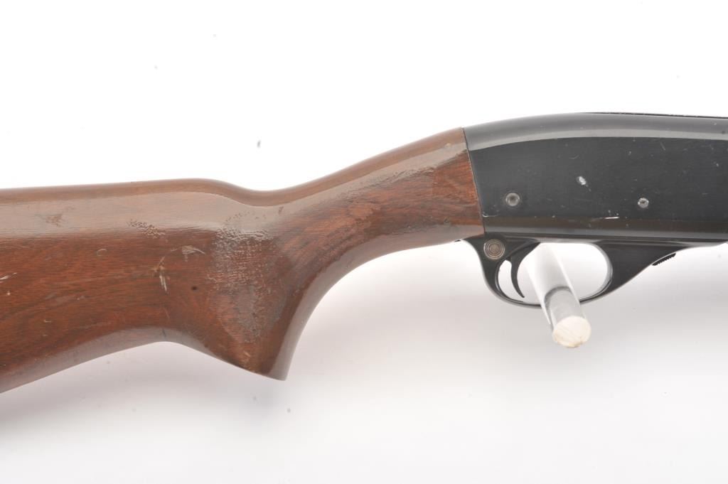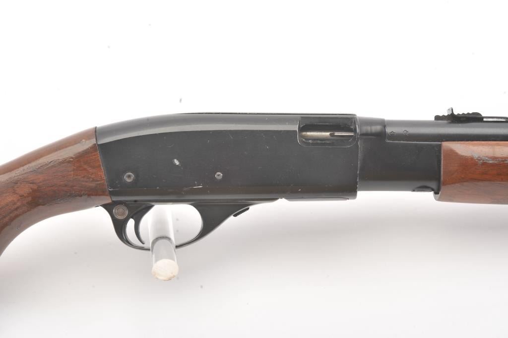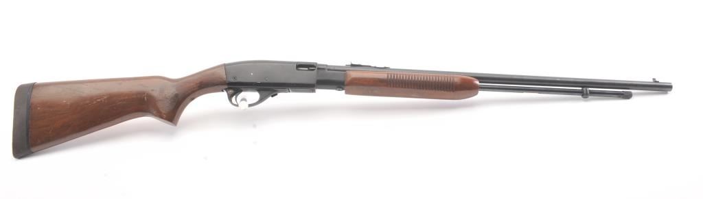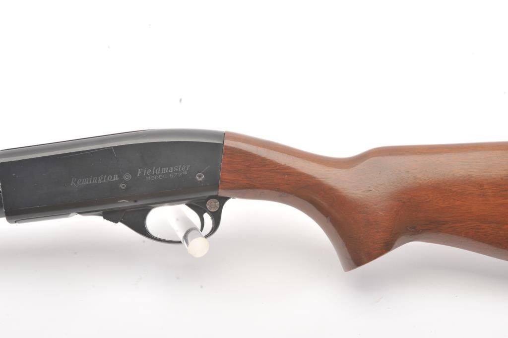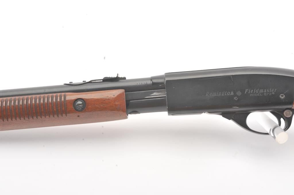 Remington Model 572 Field Master pump rifle, .22 S., L., LR caliber, Serial #NSNV. The rifle is in fine overall condition with a 23” barrel and ¾ length magazine. The metal surfaces retain the majority of the bluefinish with scratches and mars consistent with field use. The smooth wood stocks are in good condition with mars, compressions and scratches. The bore is good, the action is crisp and the markings are sharp. Est.:$150-$300. (Modern).