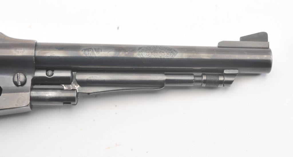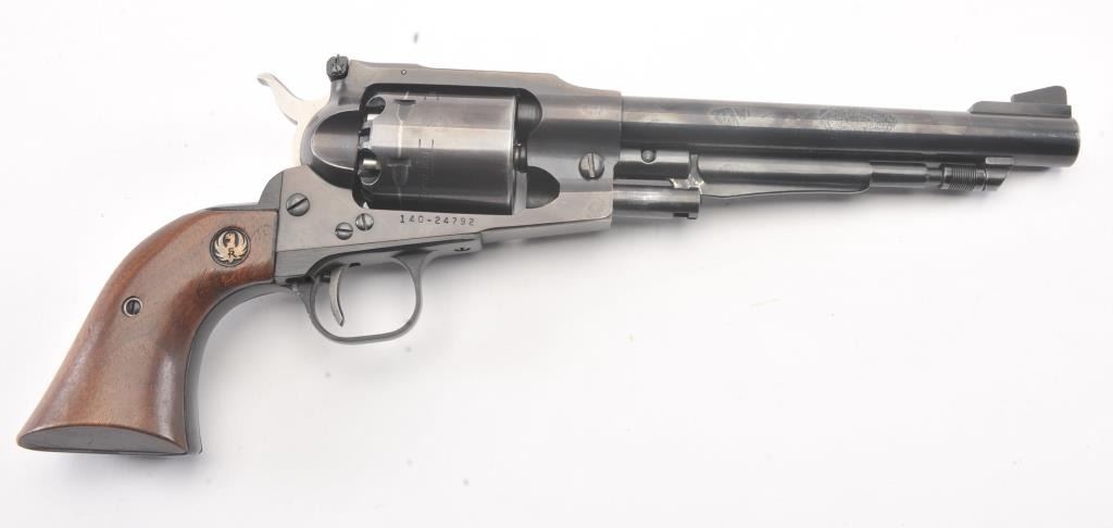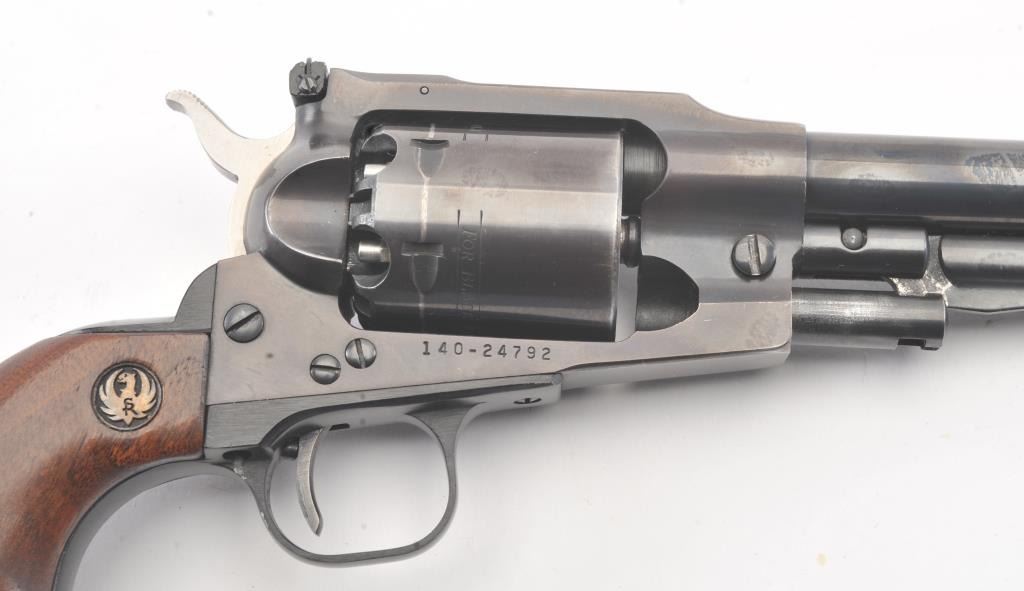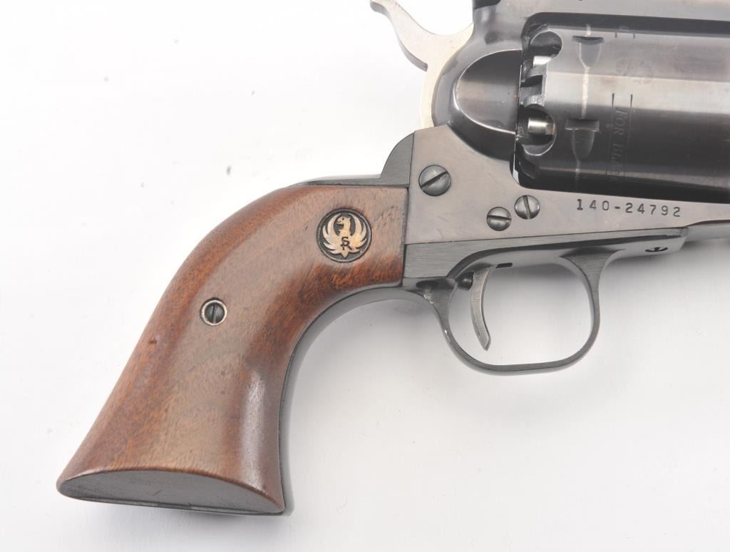 Ruger Model Old Army percussion revolver, .45 caliber, Serial #140-24792. The pistol is in nearly excellent overall condition with a 7 ½” barrel. The pistol retains approximately 90%-92% of the blue finish with light handling marks and an index line on the cylinder. The smooth wood medallion grips are in very good condition. Est.: $250-$500. (Modern/PPT).