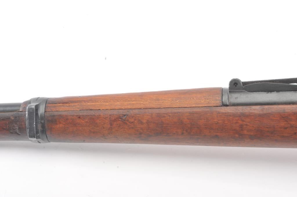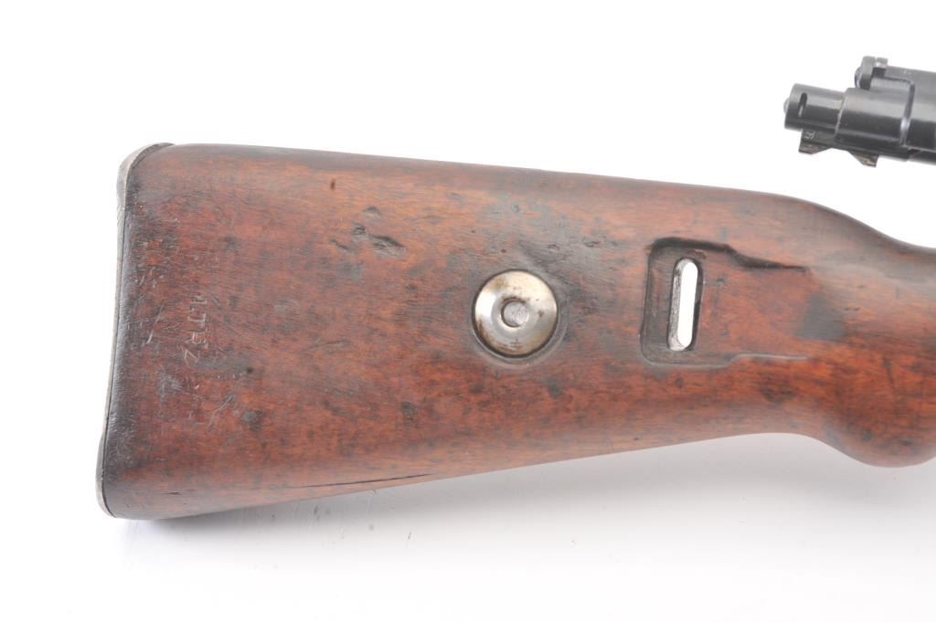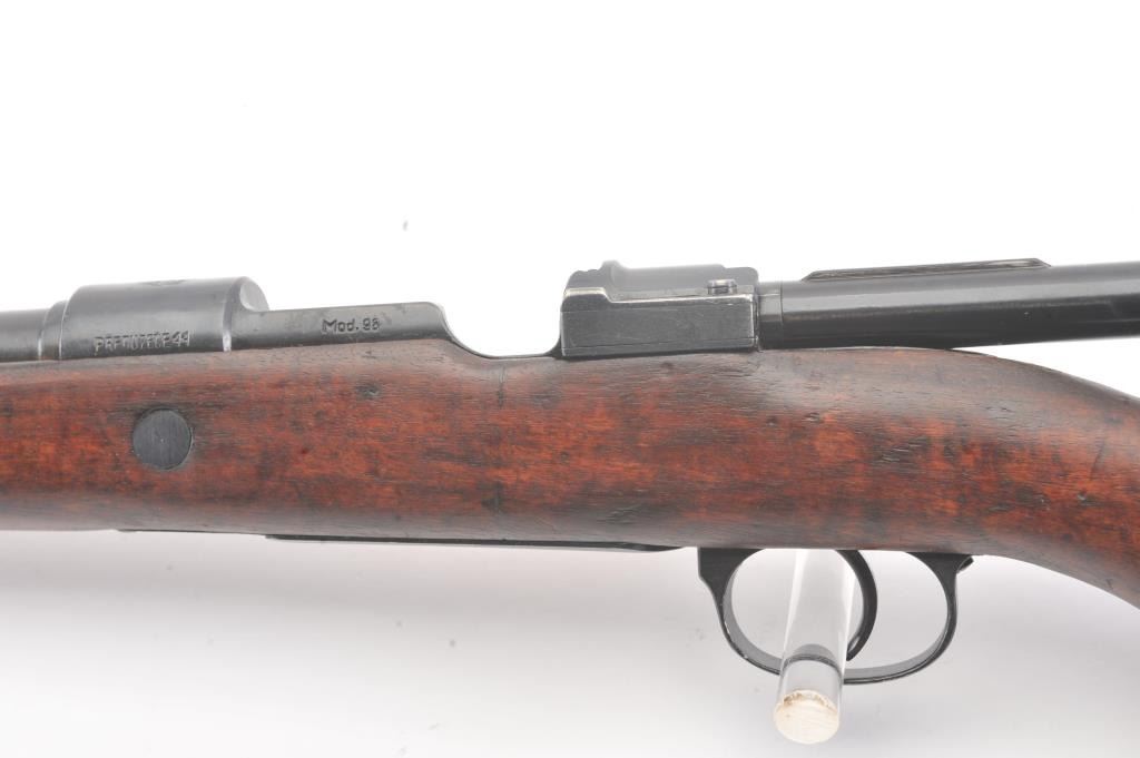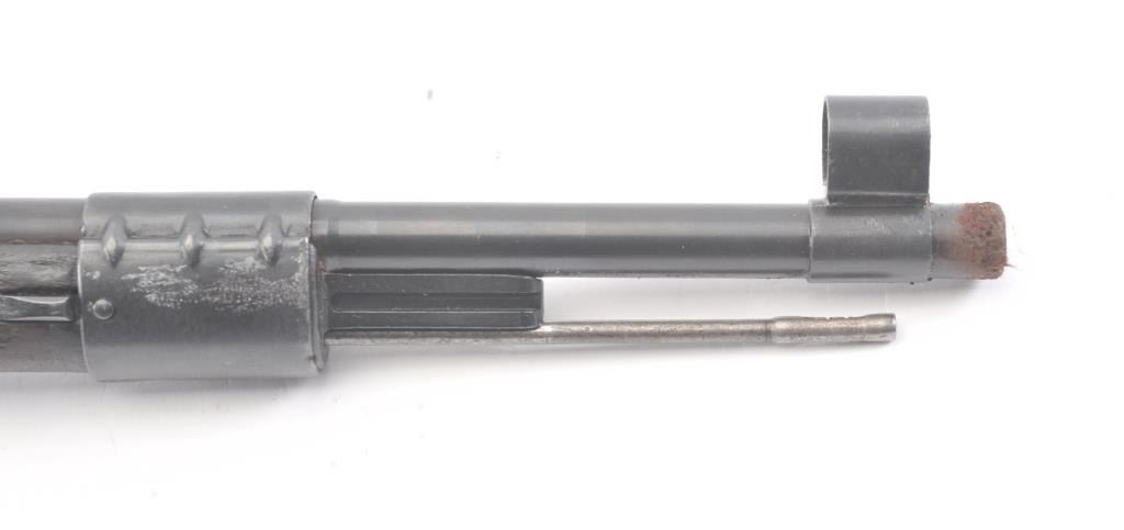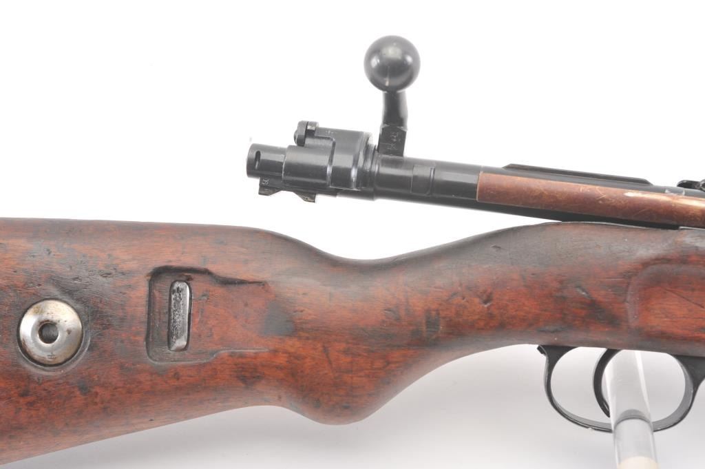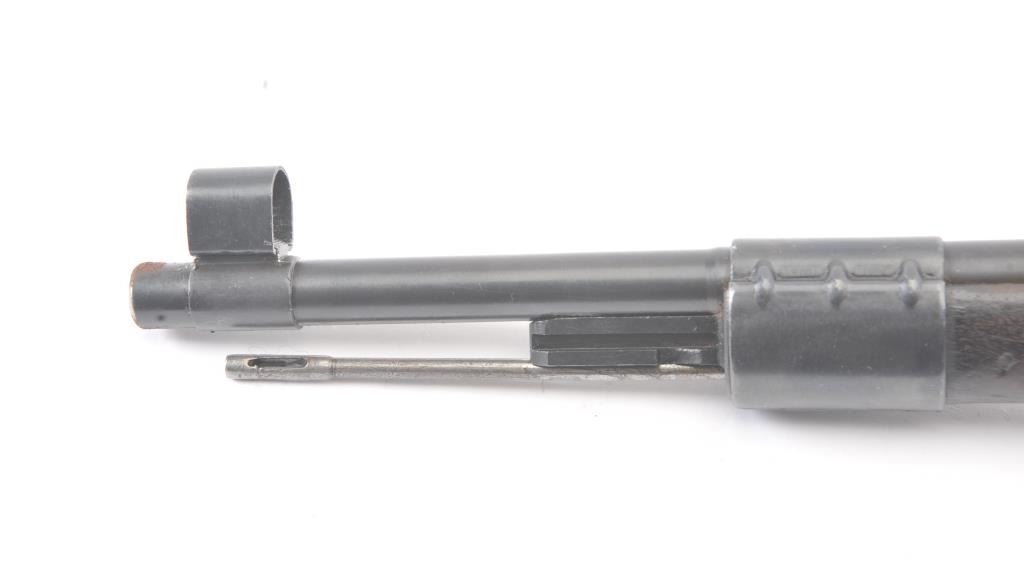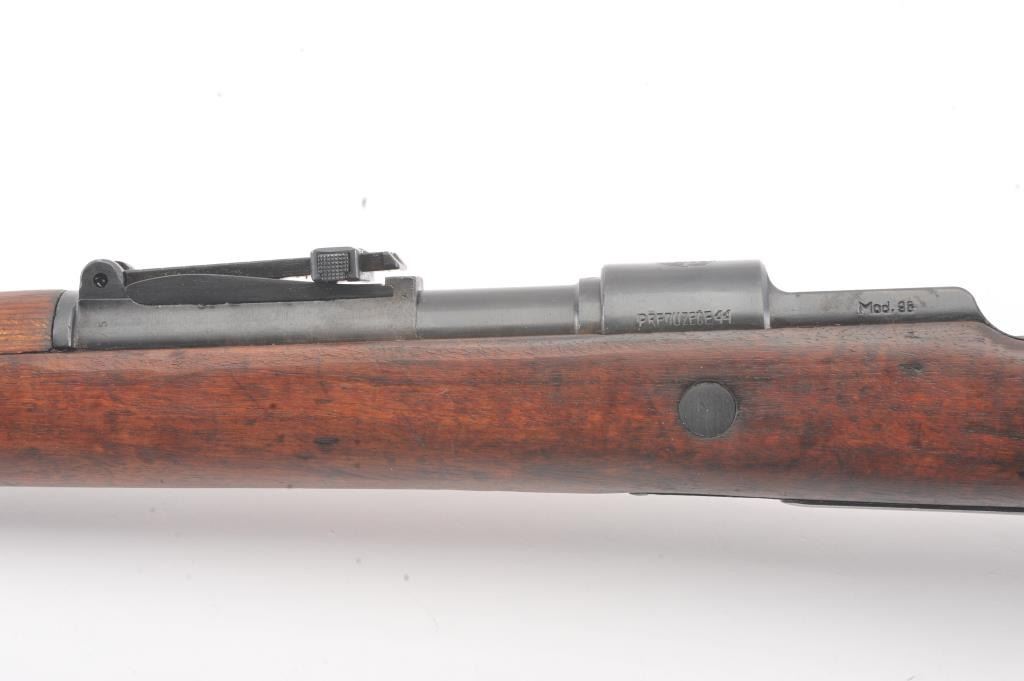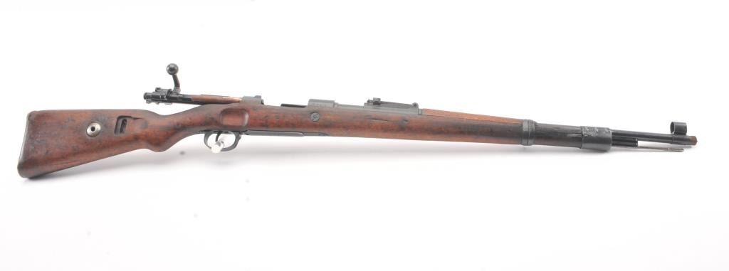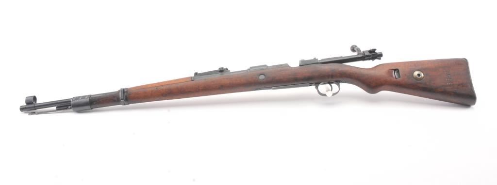 Yugoslavian marked Oberndorf Model 98 Mauser bolt action rifle, 8 x 57 caliber, Serial #M3542. The rifle is in very good overall condition with a 24” barrel with a hooded front and military tangent style rear sights. The rifle retains a significant amount of original military finish with a crisp Yugoslavian crest on the front ring and a Nazi Waffen proof on the magazine base plate. There is moderate rust at the muzzle due to poor storage. The smooth wood stock is in good condition with mars and dents consistent with carry and use. The bore is good, the action is crisp and the markings are sharp. Est.: $200-$400. (C+R).