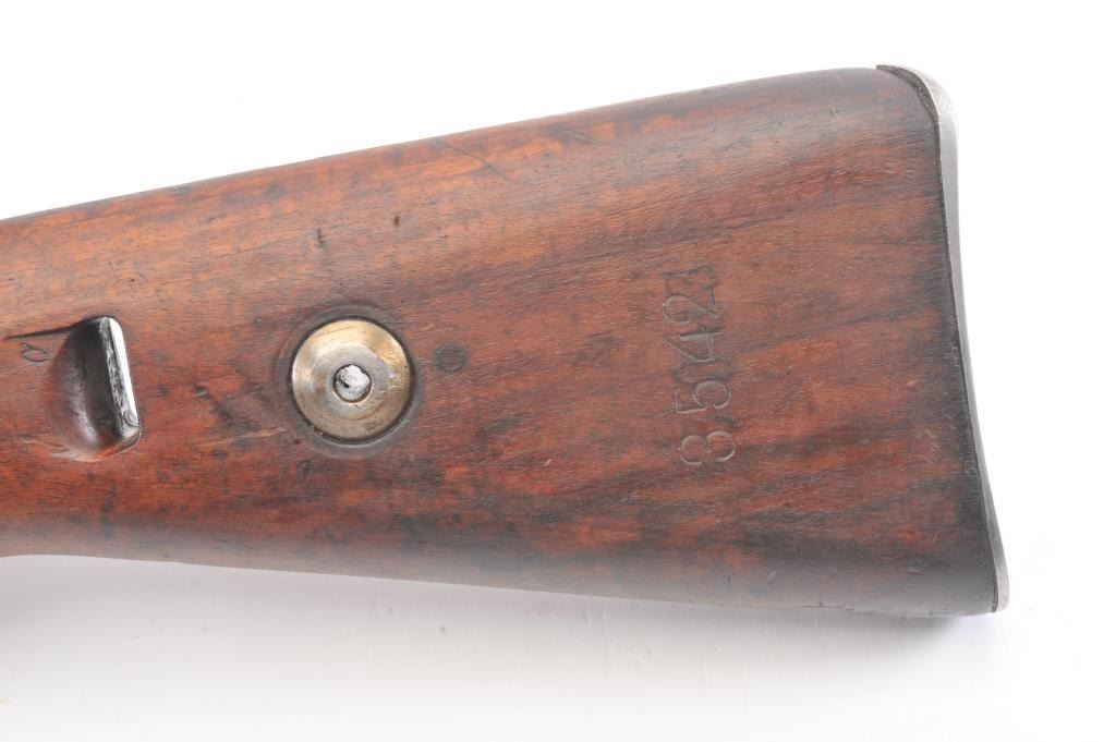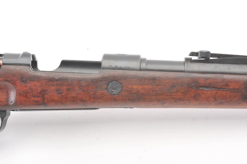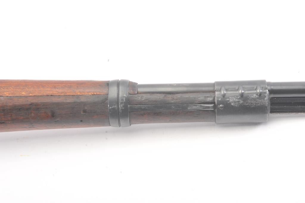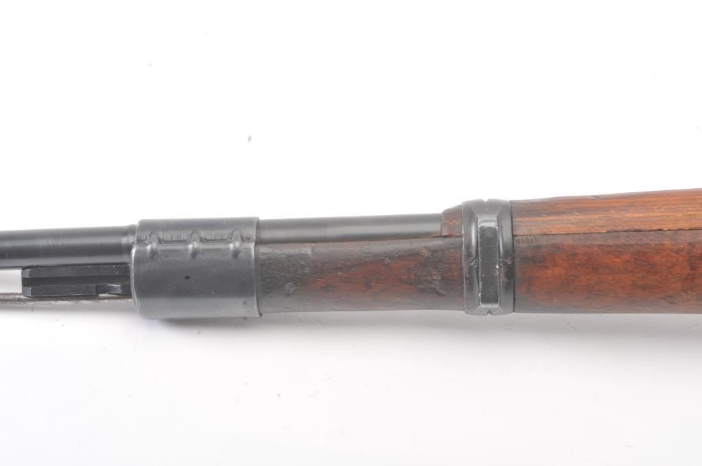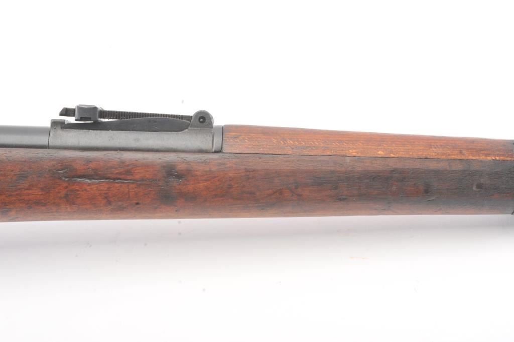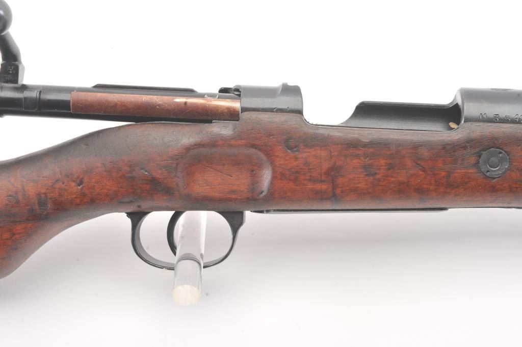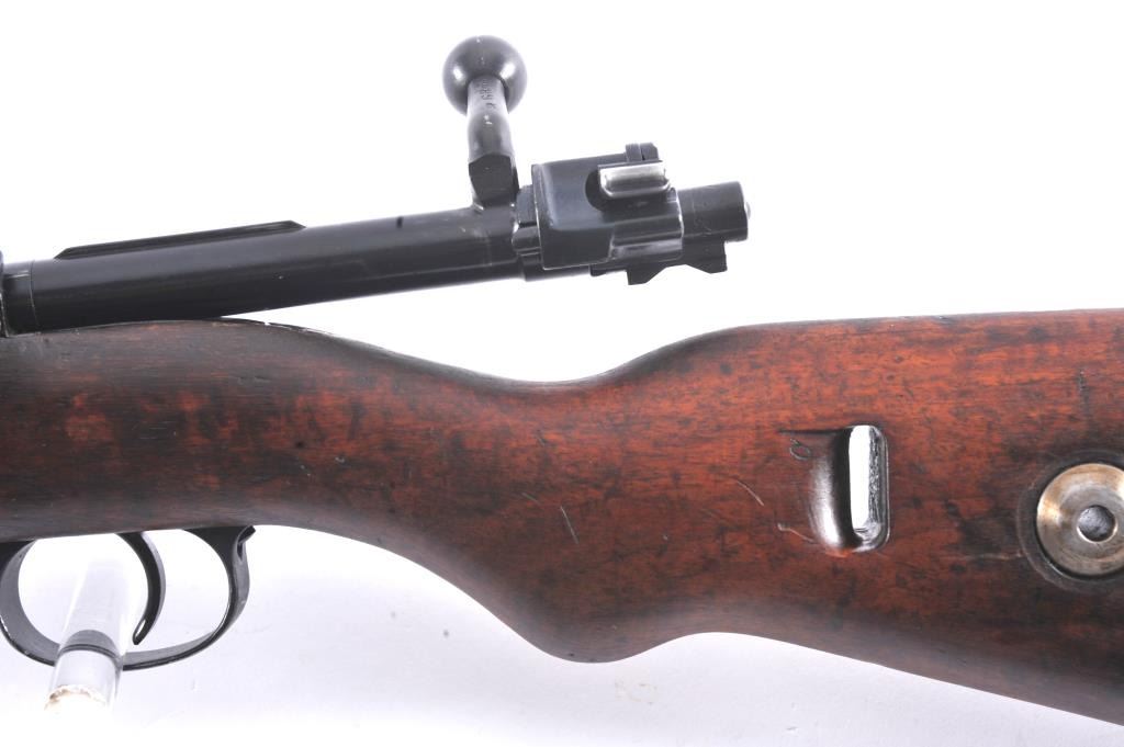 Yugoslavian marked Oberndorf Model 98 Mauser bolt action rifle, 8 x 57 caliber, Serial #M3542. The rifle is in very good overall condition with a 24” barrel with a hooded front and military tangent style rear sights. The rifle retains a significant amount of original military finish with a crisp Yugoslavian crest on the front ring and a Nazi Waffen proof on the magazine base plate. There is moderate rust at the muzzle due to poor storage. The smooth wood stock is in good condition with mars and dents consistent with carry and use. The bore is good, the action is crisp and the markings are sharp. Est.: $200-$400. (C+R).