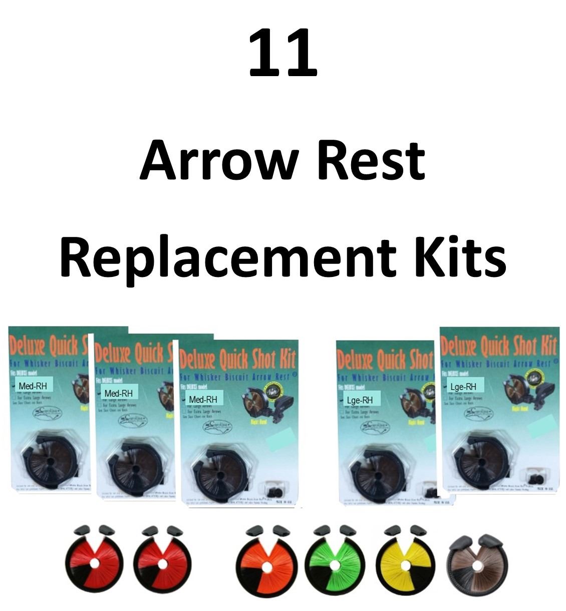 11 x Rest Replacement kits, 5 x Deluxe Quick Shot Kit, 3-M RH, 2-L RH, 6 x Trophy Ridge Whisker Biscuit, 2-Red, 1-Green, 1-Orange, 1-Yellow, 1-Black