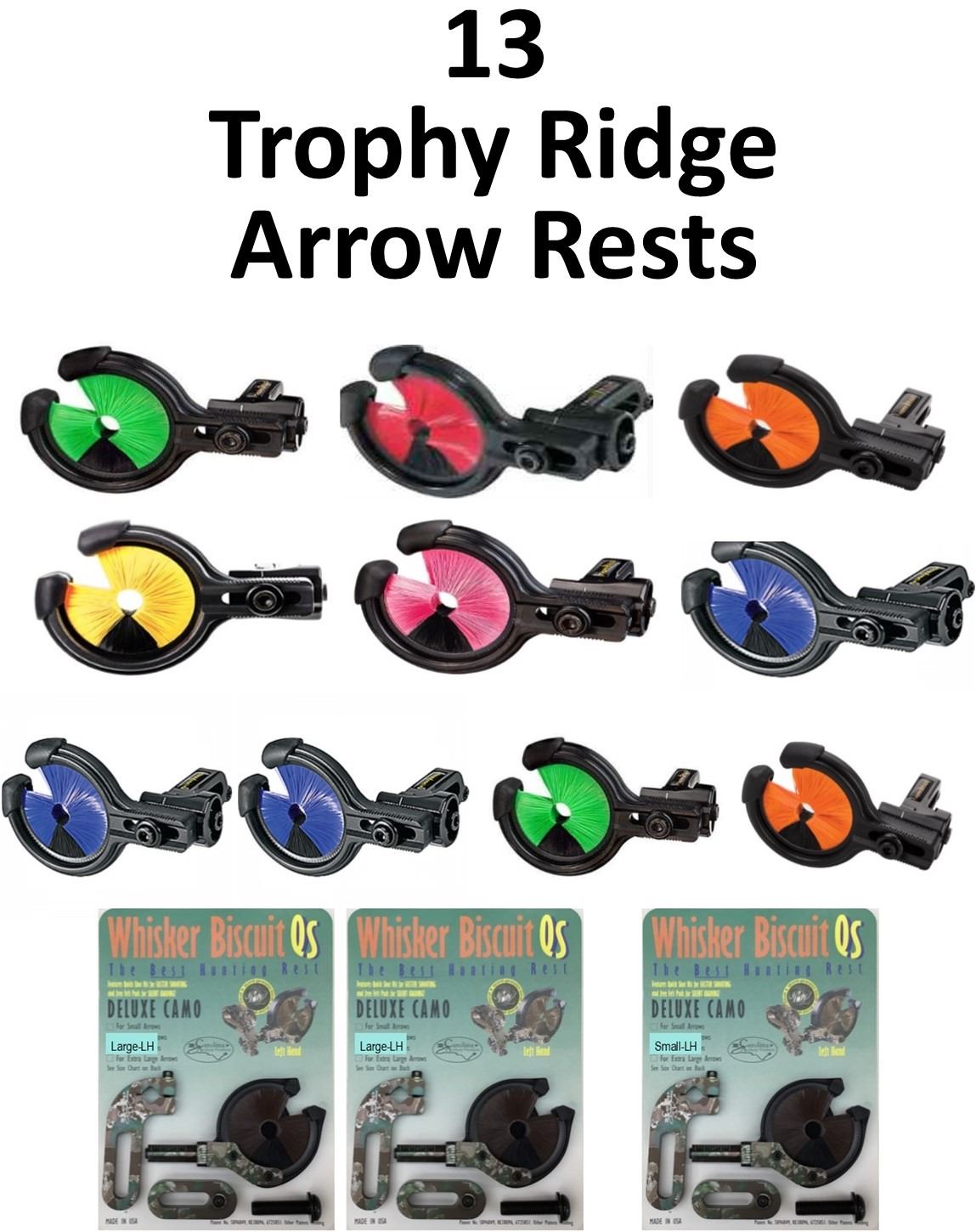 13 x Trophy Ridge Rests, 10 x Kill Shot Medium, 3-Purple, 2-Green, 2-Orange, 1-Red, 1-Yellow, 1-Pink, 3 x Deluxe Quick Shot Camo, 2-Large LH, 1-Small LH