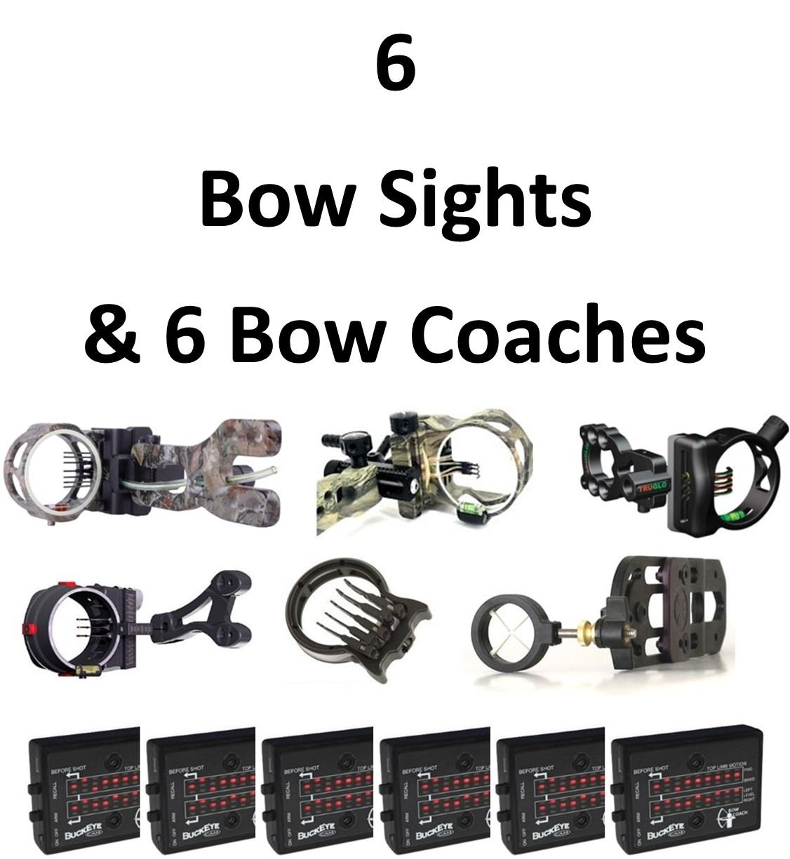 6 x Sights & 6 x Bow Coaches, Icon 7 Pin .020 AP, Optix SE .029 LH, Rite-Site XS 5 Light 19 Black, Buckhead 3 Point Black, 1-Hogg Wrap Kit 5 Pin .029 LG, Hind Sight Xtreme Sight