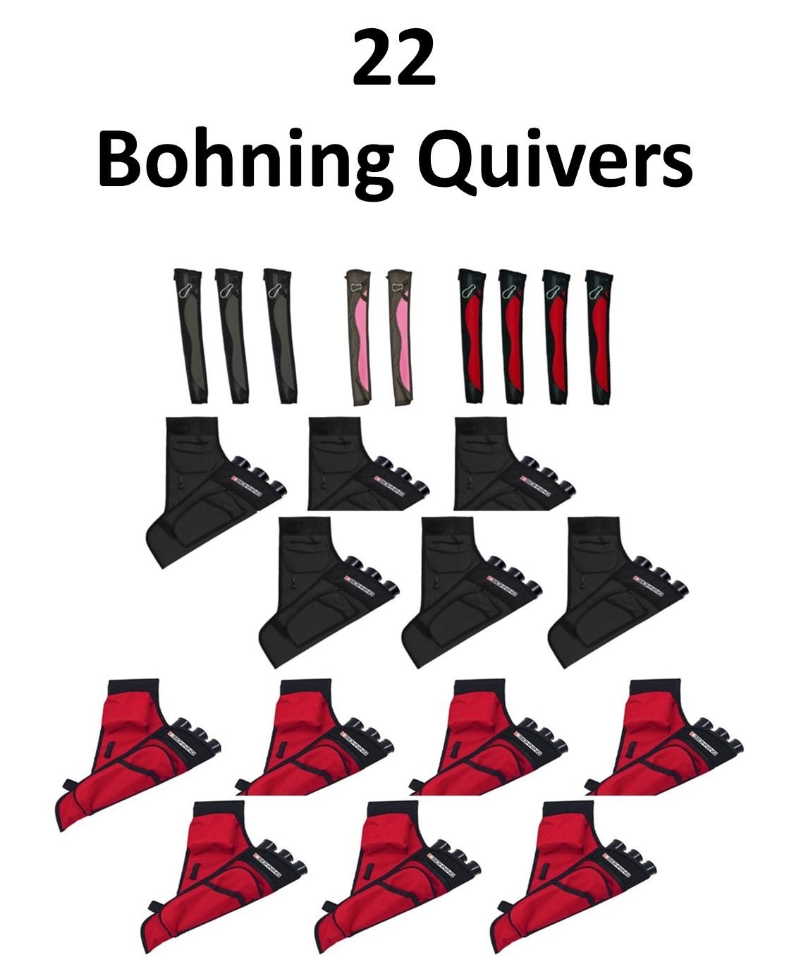 22 x Bohning Quivers, 9 x Tube Youth, 3-Grey, 2-Hot Pink, 4-Red, 13 x Mini Quivers, 6-Black RH, 7-Red RH