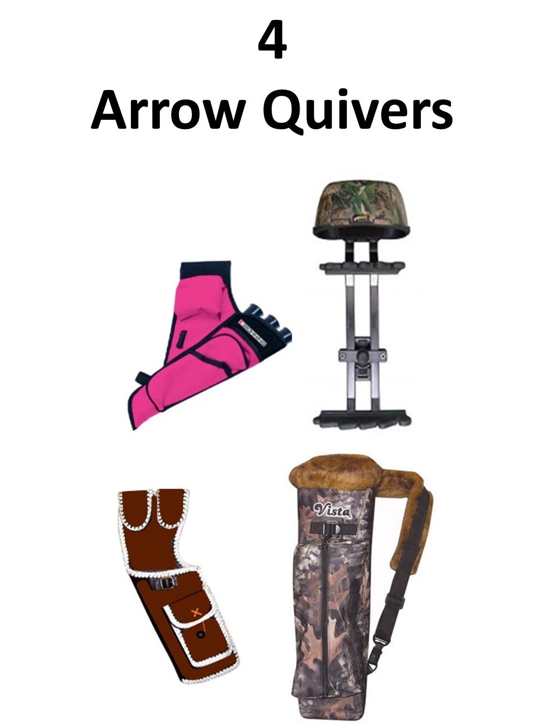 4 x Arrow Quivers, 1 x Bohning Mini Target Pink RH, 2 x Vista, 1-Rascal Brown RH, 1-MaverickII Back Quiver, 1 x Kwikee Kwiver HI-5 APG