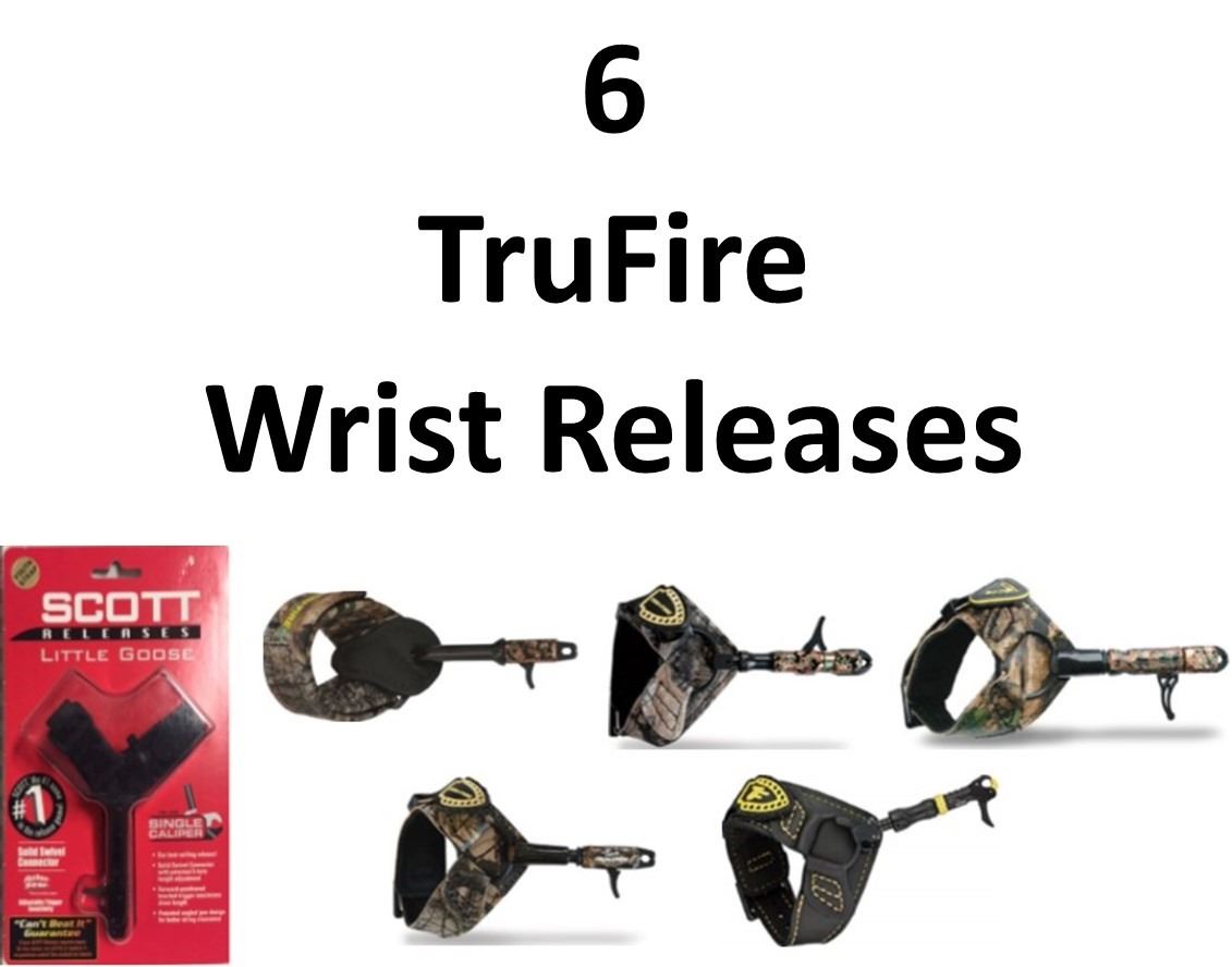 6 x Wrist Releases, 1 x Scott Little Goose Youth Strap Black, 5 x TruFire, 1-X-Caliper Camo, 1-360° Buckle Fold Back, 1-360° Extreme Buckle Foldback, 1-Hurricane Buckle Junior, 1-Panic-X