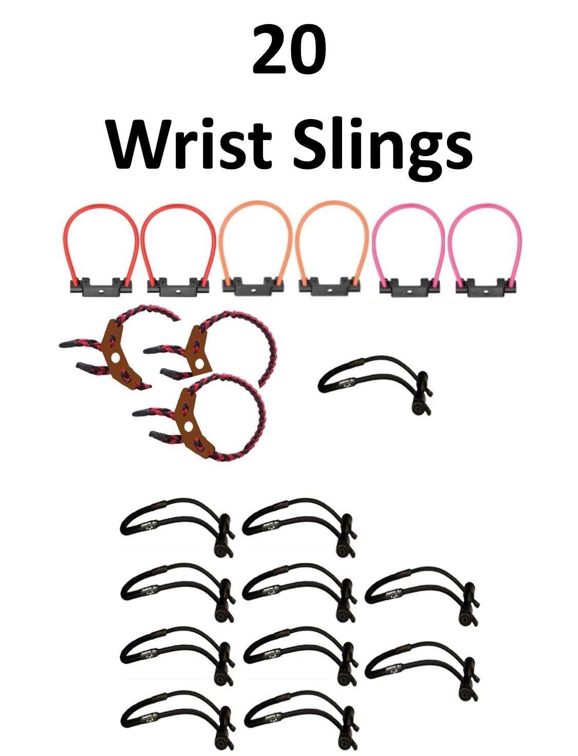 20 Wrist Slings, 10 Pine Ridge Nitro Wrist Slings, 2 - Red, 2 - Orange, 2 - Pink, 3 - Vista Braided Sling - Red / Black, 11 - LOC Outdoorz Stiffy Sling MaXX - Black