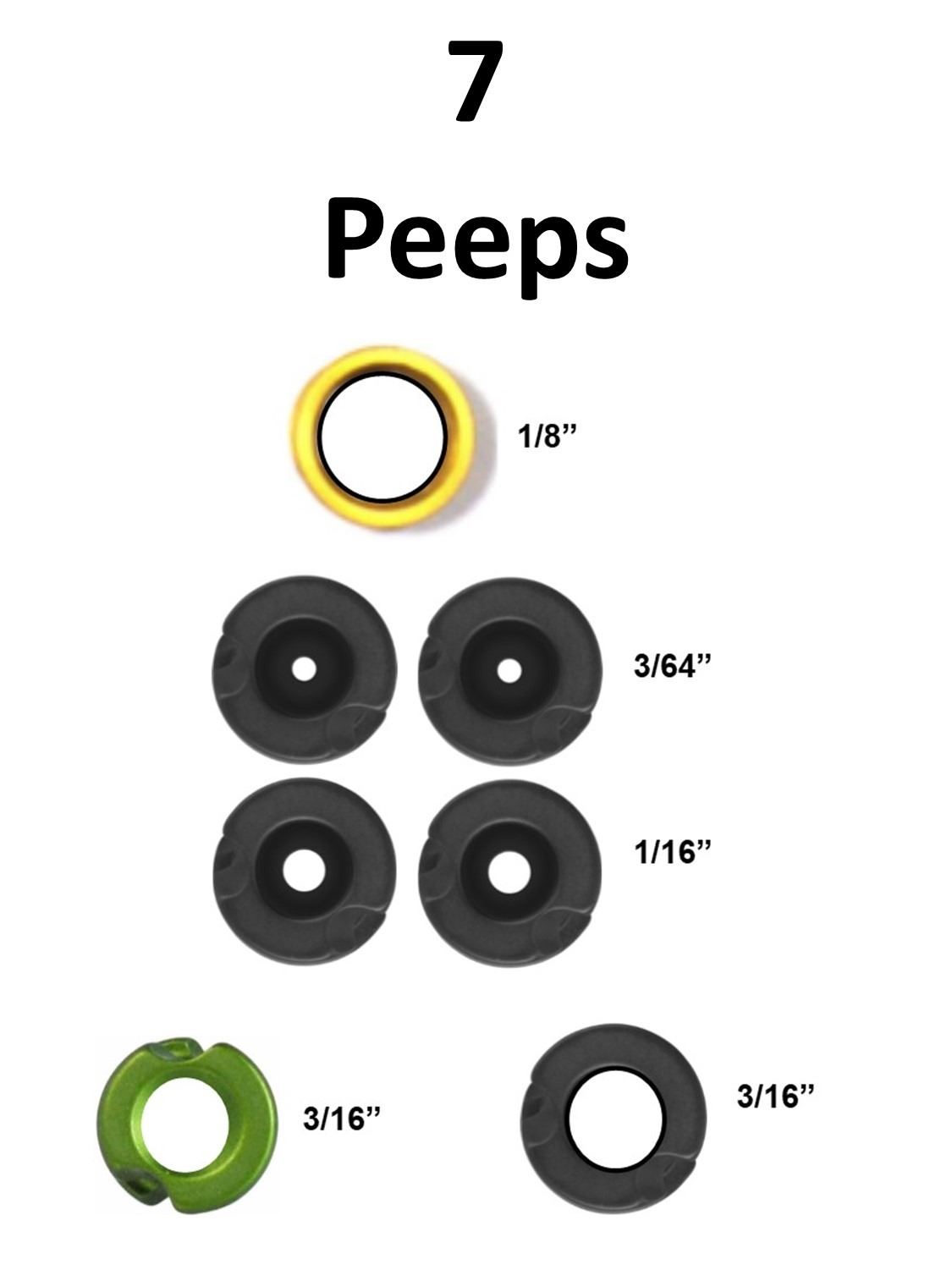 7 x Peeps, 2 x Clearshot Speed Peeps, 1-1/8 Gold, 1-3/16 Black, 4 x Jim Fletcher Tru Peeps, 2-3/64 Small, 2-1/16 Large, 1 x G5 Meta 3/16 Green