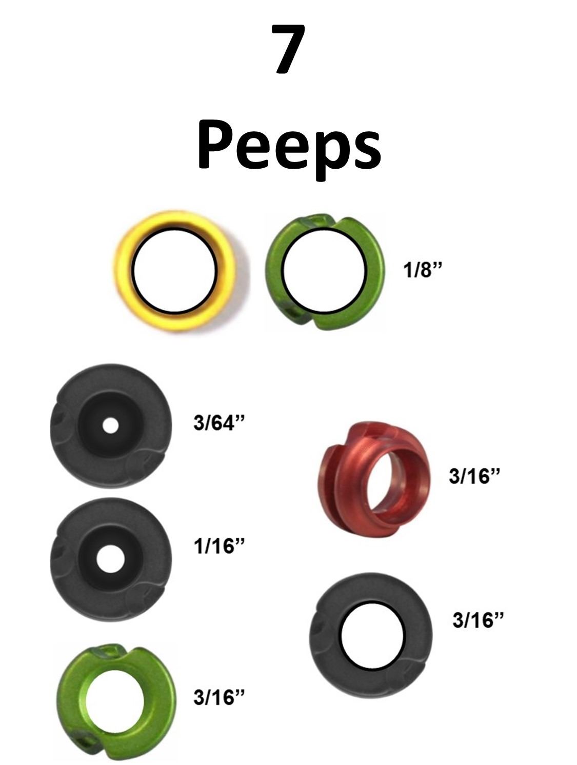 7 x Peeps, 4 x Clearshot Speed Peeps, 1-1/8 Gold, 1-1/8 Green, 1-3/16 Red, 1-3/16 Black, 2 x Jim Fletcher Tru Peeps, 1-3/64 Small, 1-1/16 Large, 1 x G5 3/16 Meta Peep Green