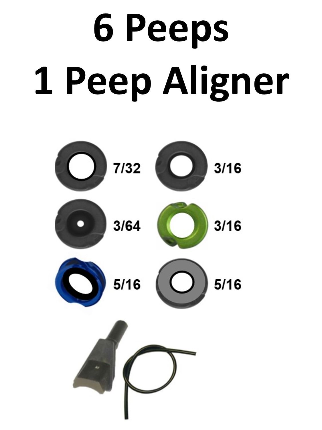 6 x Peeps & 1 x Peep Aligner, 2 x Clearshot Speed Peeps, 1-7/32 Black, 1-3/16 Black, 1 x Jim Fletcher Tru Peep 3/64 Small, 3 x G5 Peeps, 1-Meta Green 3/16, 1-Meta Magnum Hunter 5/16, 1-Titanium 5/16