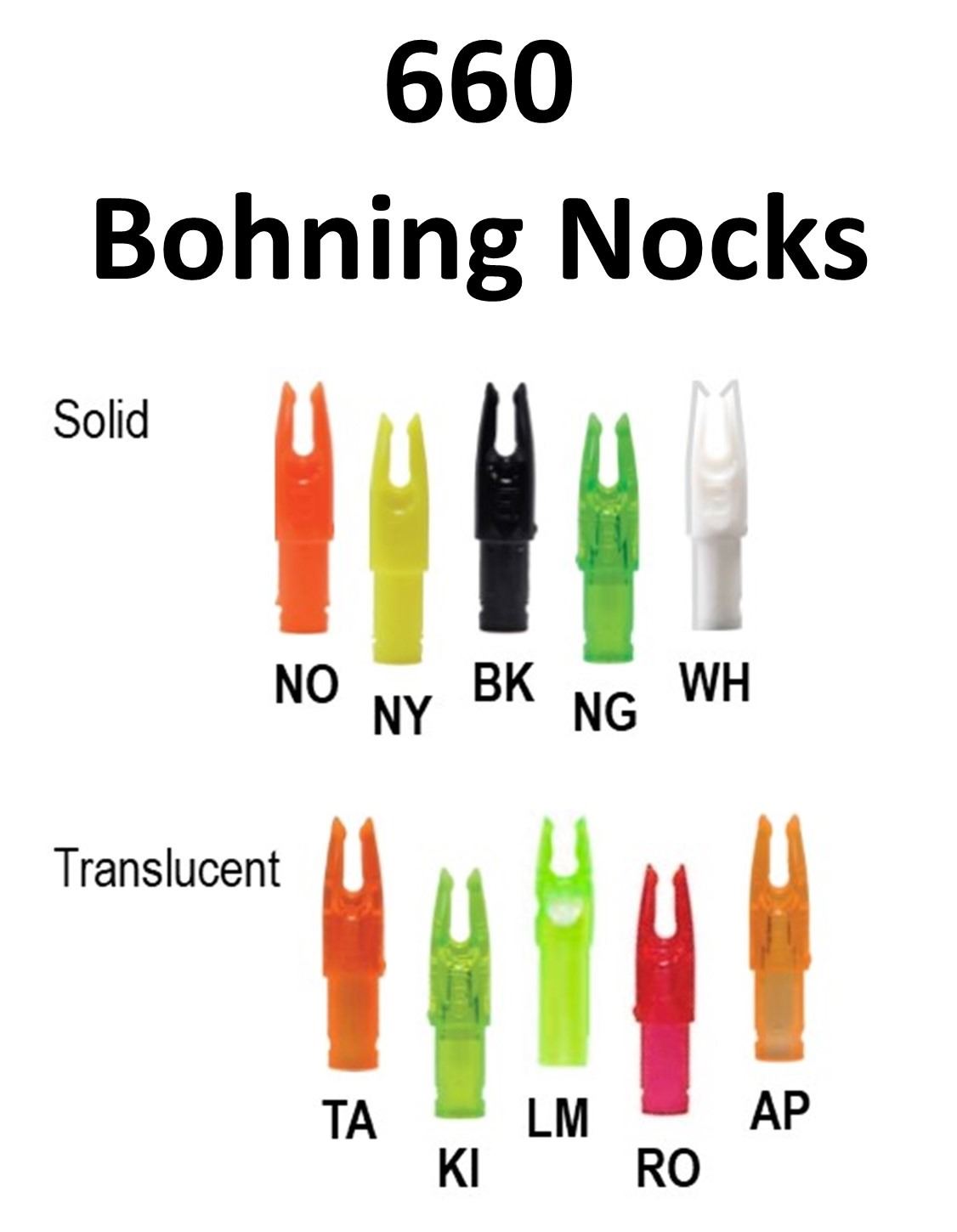 55 x Bohning Signature Nocks .244 - 12 pk, 4-Tangerine, 5-Kiwi, 5-Neon Orange, 5-Neon Yellow, 6-Black, 6-Neon Green, 6-Lime, 6-Rose, 6-Apricot, 6-White