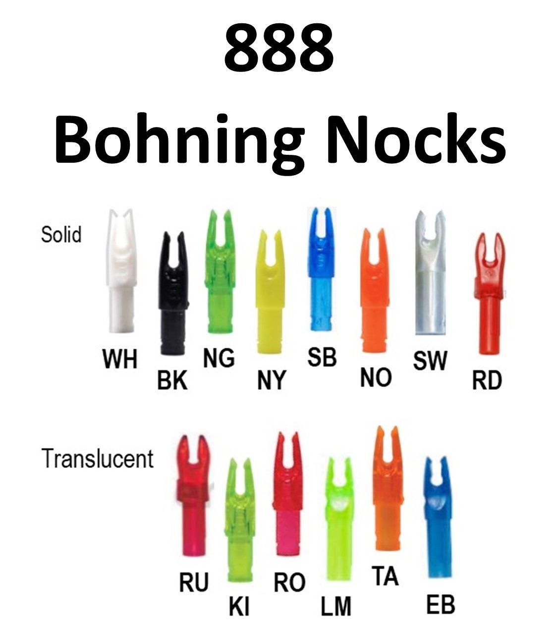 74 x Bohning Blazer Double Lock Nocks .244 - 12 pk, 4-Ruby, 5-White, 1-Kiwi, 3-Rose, 4-Lime, 6-Black, 3-Neon Green, 5-Neon Yellow, 7-Tangerine, 6-Satin Blue, 1-Neon Orange, 7-Electric Blue, 8-Satin White, 14-Red