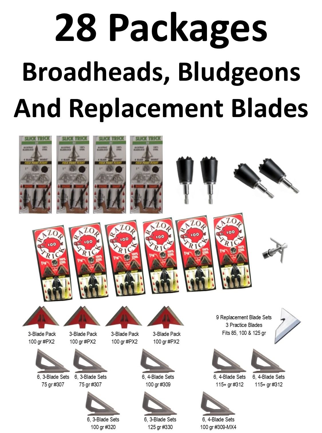 24 x Broadheads/Blades & 4 Bludgeons, 4-Slick Trick 85Gr, 6-Razor Trick 100 Gr, 1-Reign 100 Gr, 13 x Replacement Blade, 4-PX2 Repl, 1-Buckmaster Repl, 8 x Muzzy, 2-307, 1-309, 2-312, 1-320, 1-330, 1-MX4-3, 4 x Bludgeons, 2-125Gr, 2-85Gr
