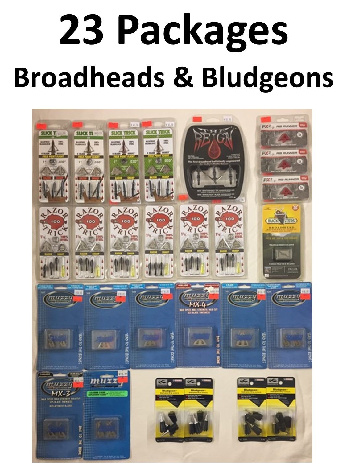 23 x Broadheads & 4 Bludgeons, 4-Slick Trick 85Gr, 6-Razor Tricks 100Gr, 1-Reign 100 Gr, 12 x Replacement Blade, 3-PX2 Repl, 1-Buckmaster, 8 x Muzzy, 1-307, 2-309, 1-MX4-3, 1-312, 1-320, 1-MX3-3, 1-330, 4 x Bludgeons, 2-4 Pack 125Gr, 2-4 Pack 85Gr