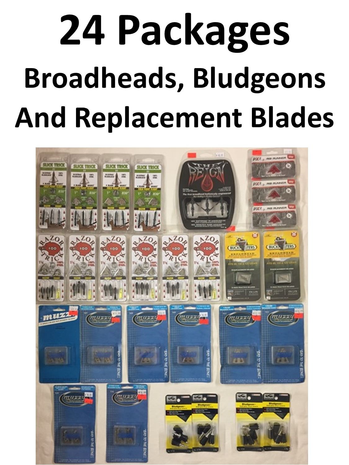 24 x Broadheads & 4 Bludgeons, 4-Slick Trick 85Gr, 6-Razor Tricks 100 Gr, 1-Reign 100 Gr, 13 x Replacement Blades, 3-PX2 Repl, 2-Buckmaster Repl, 8 x Muzzy, 2-307, 2-309, 2-312, 1-320, 1-330, 4 x Bludgeons, 2-4 Pack 125Gr, 2-4 Pack 85Gr
