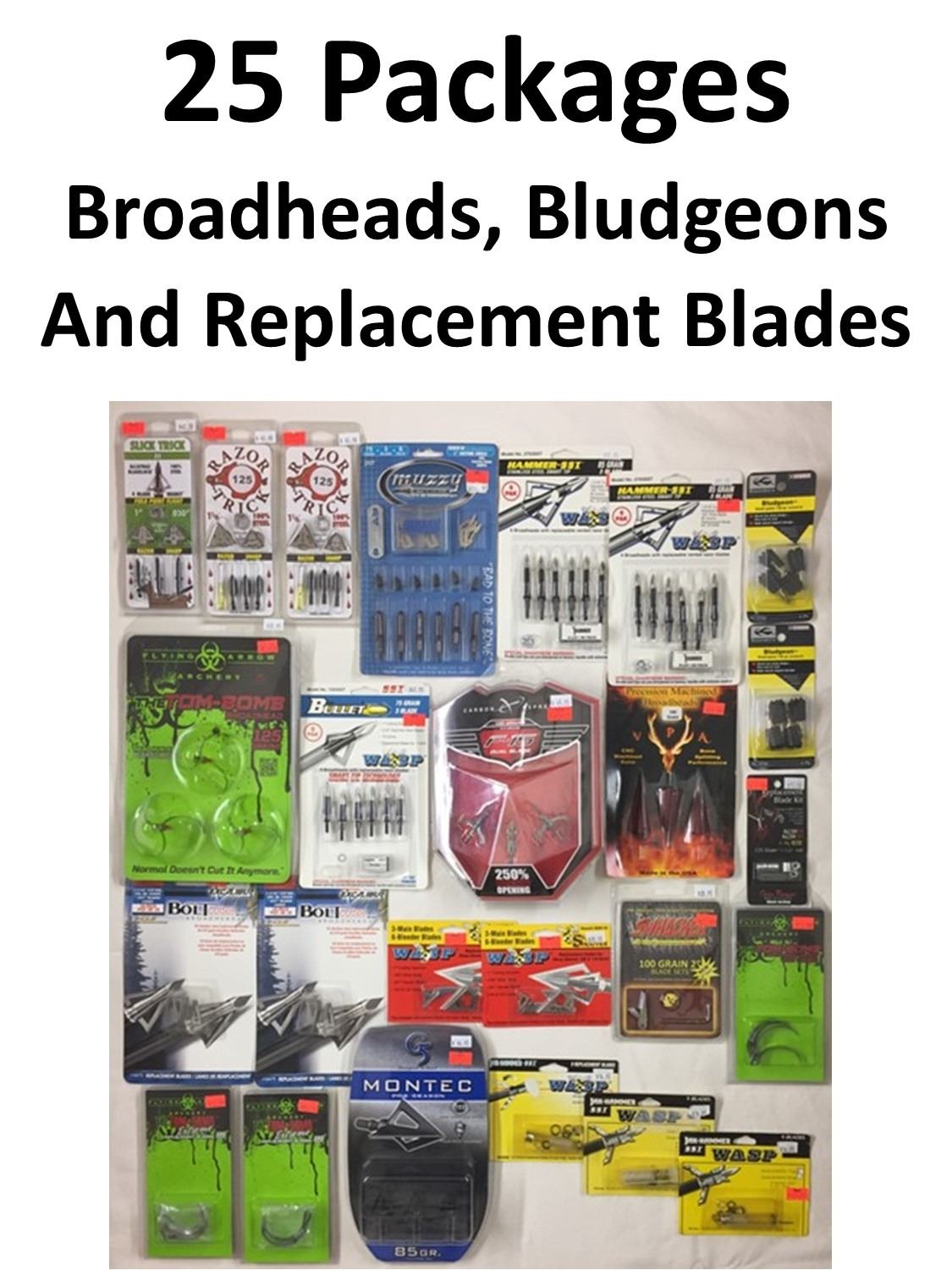 25 Packages of Broadheads Plus ..., Slick Trick 85Gr, 2-Razor Tricks 125 Gr, Muzzy 75 Gr, 2-Hammer SST 85 Gr, Boss Bullet 75Gr, Toxic Tom Bomb 125 Gr, F-15 100 Gr, VPA 3 Blade 190 Gr, 12 x Relpacement Packs, 2-Boltcutter, Toxic Tom Bomb 125 Gr, 2-Toxic Tom Bomb Extreme 100 Gr, 3-Jak Hammer 75Gr. 2-Sharp Shooter, Swhacker 100 Gr, Grim Reaper X-Bow 125 Gr, Montec Pre Season 85 Gr, 2-Bludgeon 125 Gr