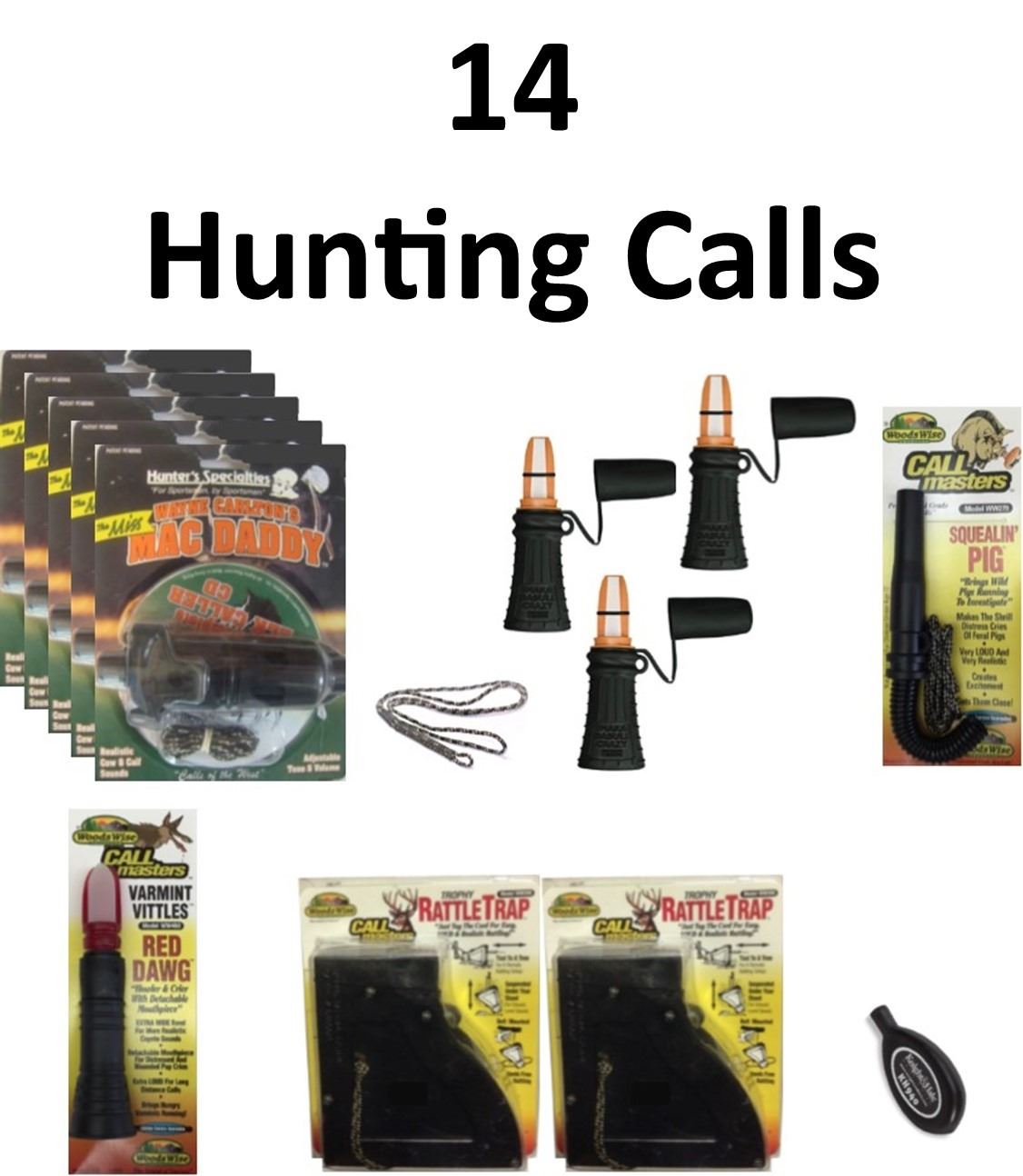 14 x Hunting Calls & 1 Lanyard, 5-Miss Mac Daddy Cow Call, 3-Imaka Da Bullcrazy, 2-Squealin Pig, P.A.W.S. Red Dog, Mouse Squeaker, 2-Trophy Rattle Trap, Single Lanyard